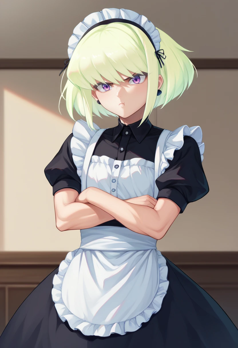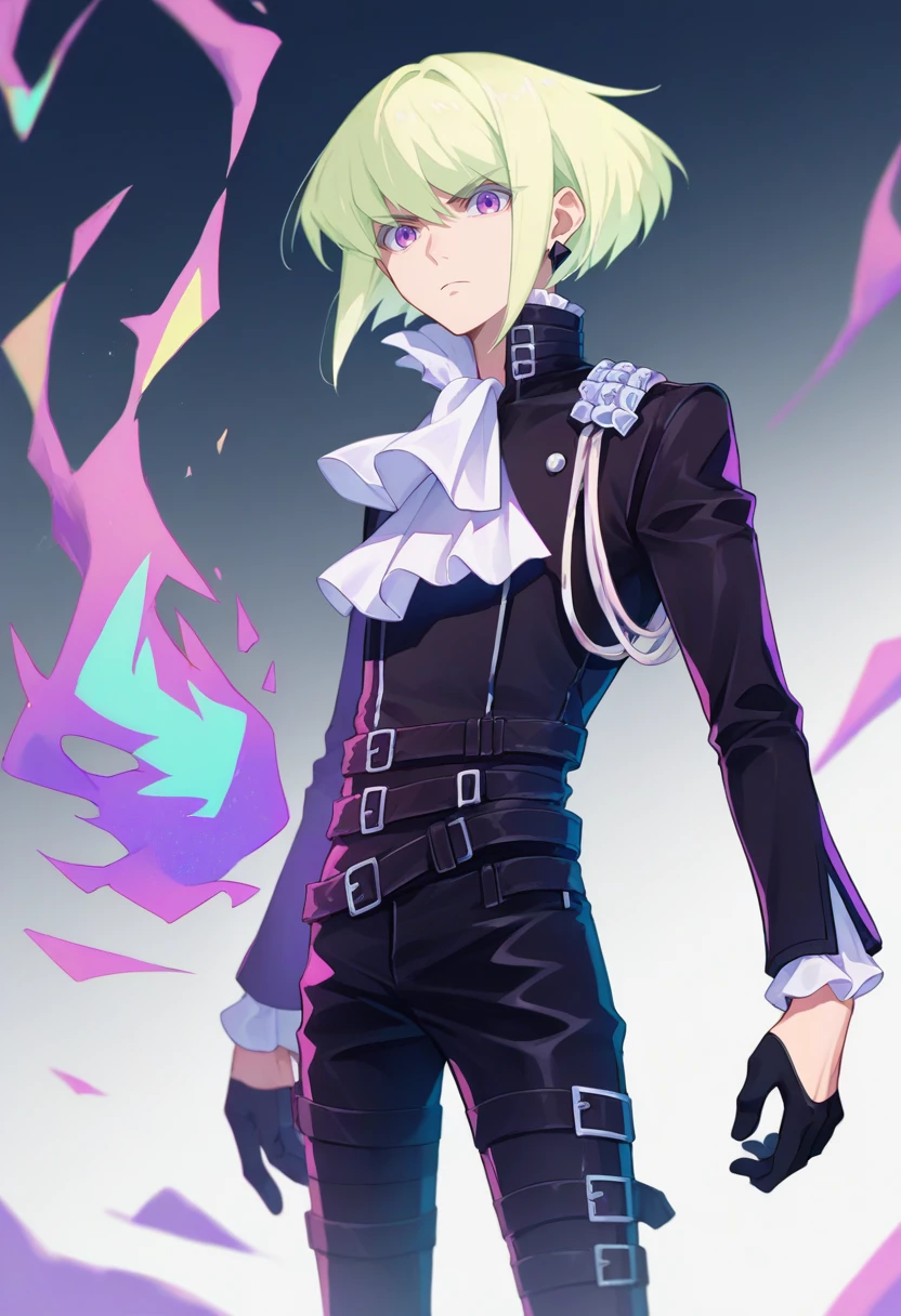 Default Outfit: frills, black jacket, white ascot, multiple belts, long sleeves, frilled sleeves, black gloves, half gloves, black pants, earrings