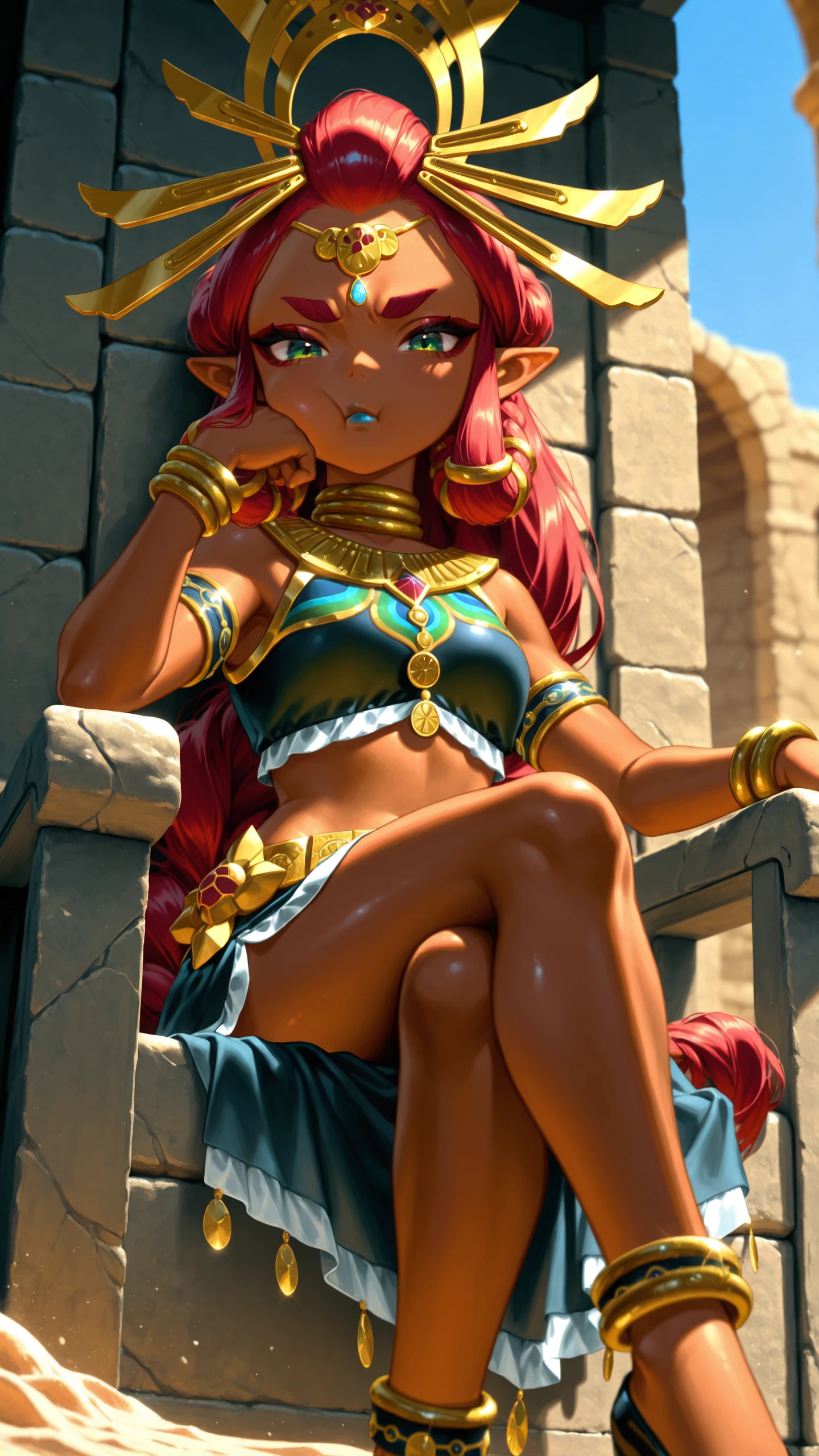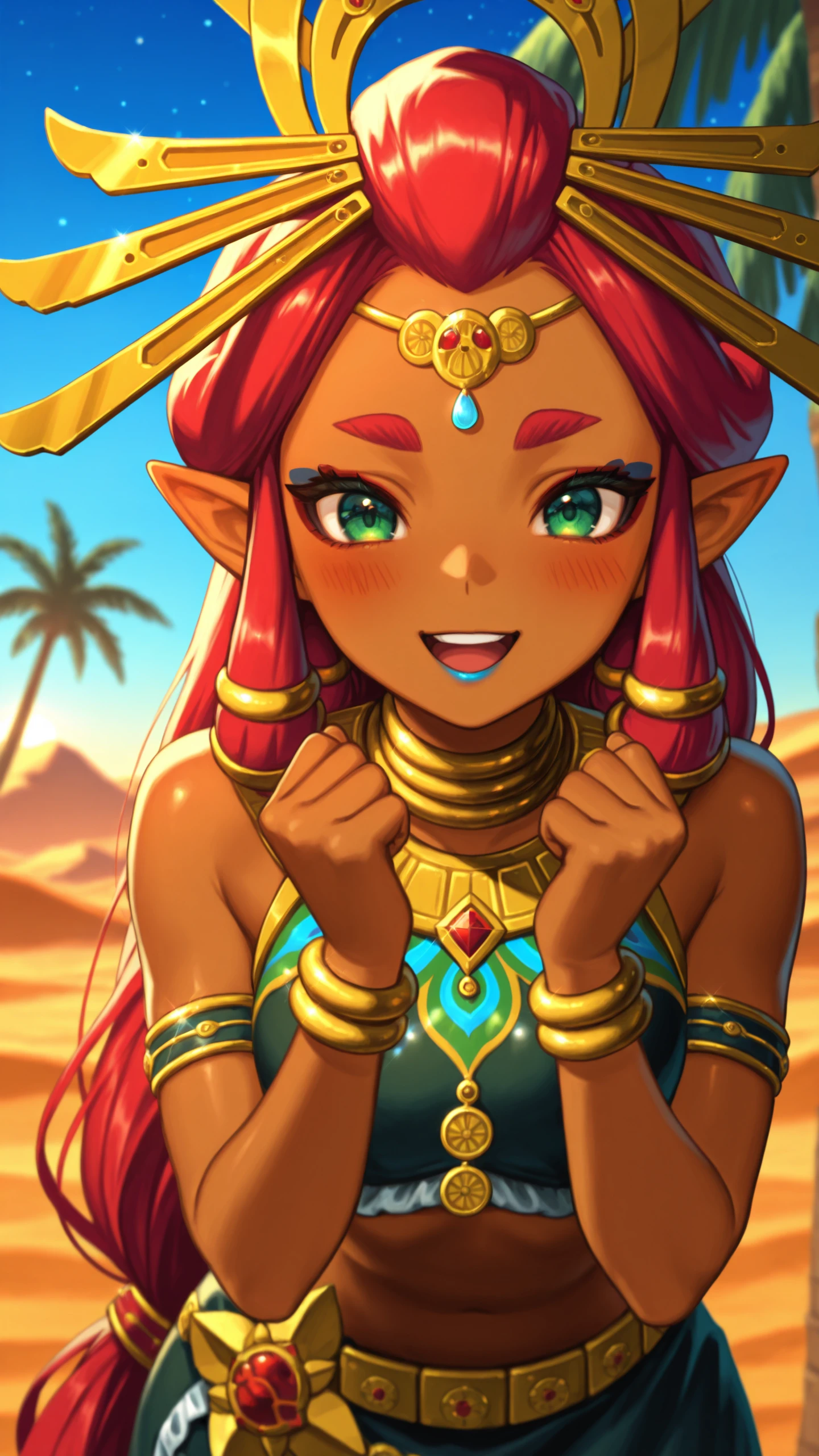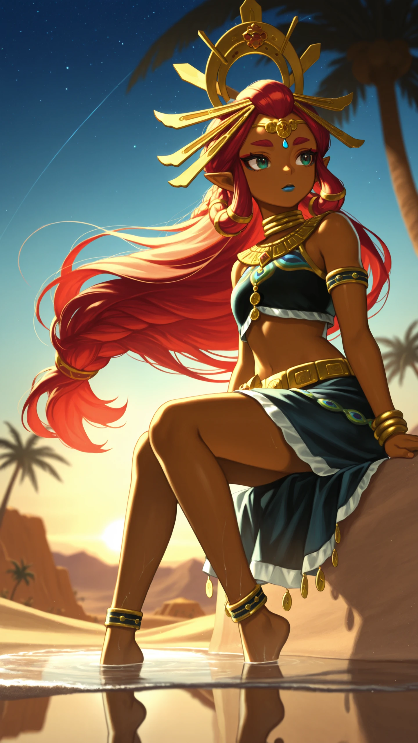 r1ju, gerudo, dark-skinned female, red hair, pointy ears, green eyes, makeup, blue lips, lipstick, braid, very long hair