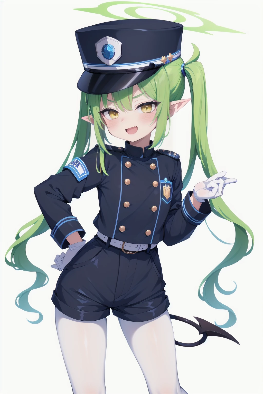 recommendation tags : long hair,gloves,long sleeves,hat,twintails,very long hair,tail,yellow eyes,pantyhose,boots,green hair,shorts,pointy ears,belt,white gloves,black footwear,uniform,short shorts,halo,demon tail,armband,peaked cap,white pantyhose,