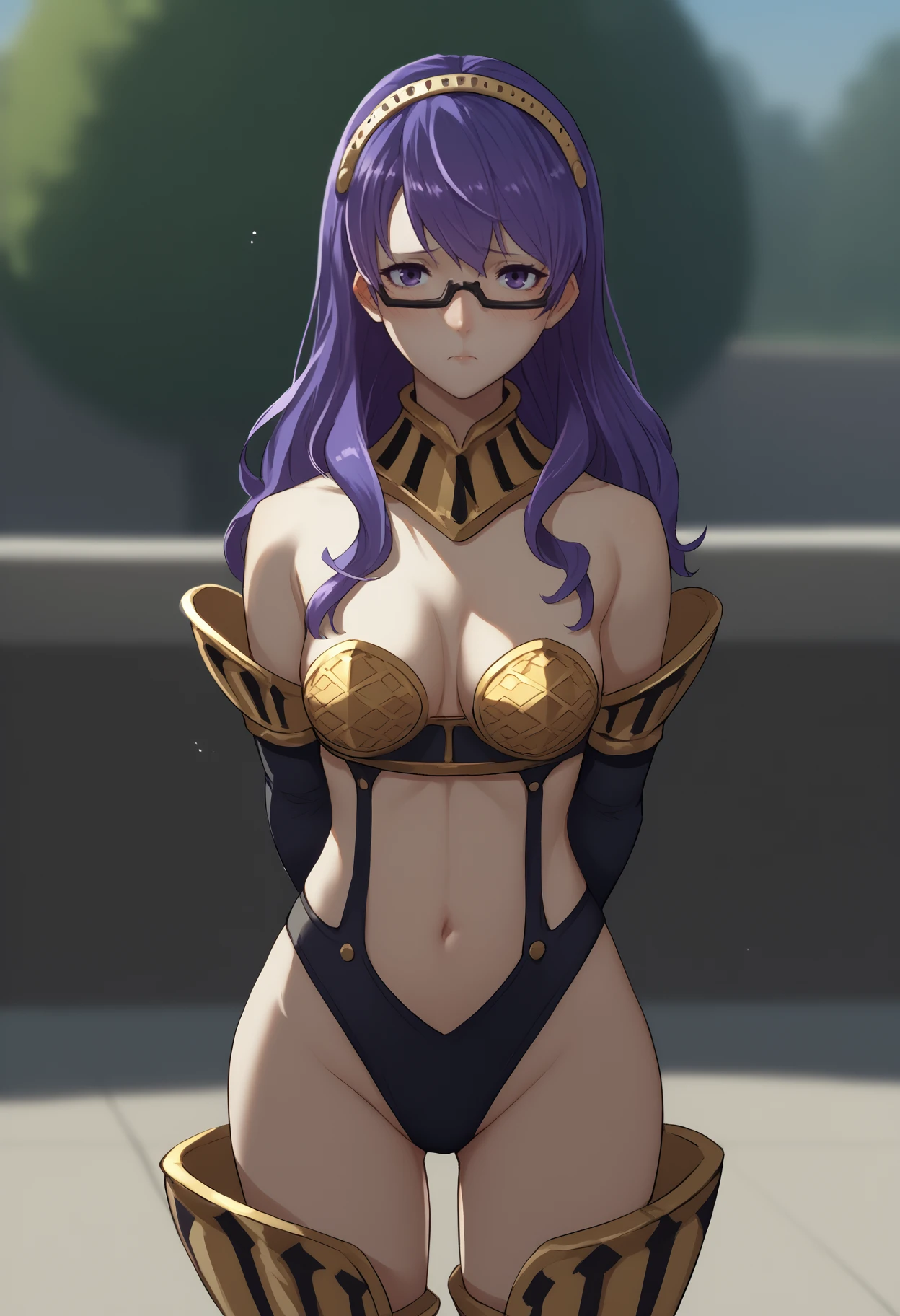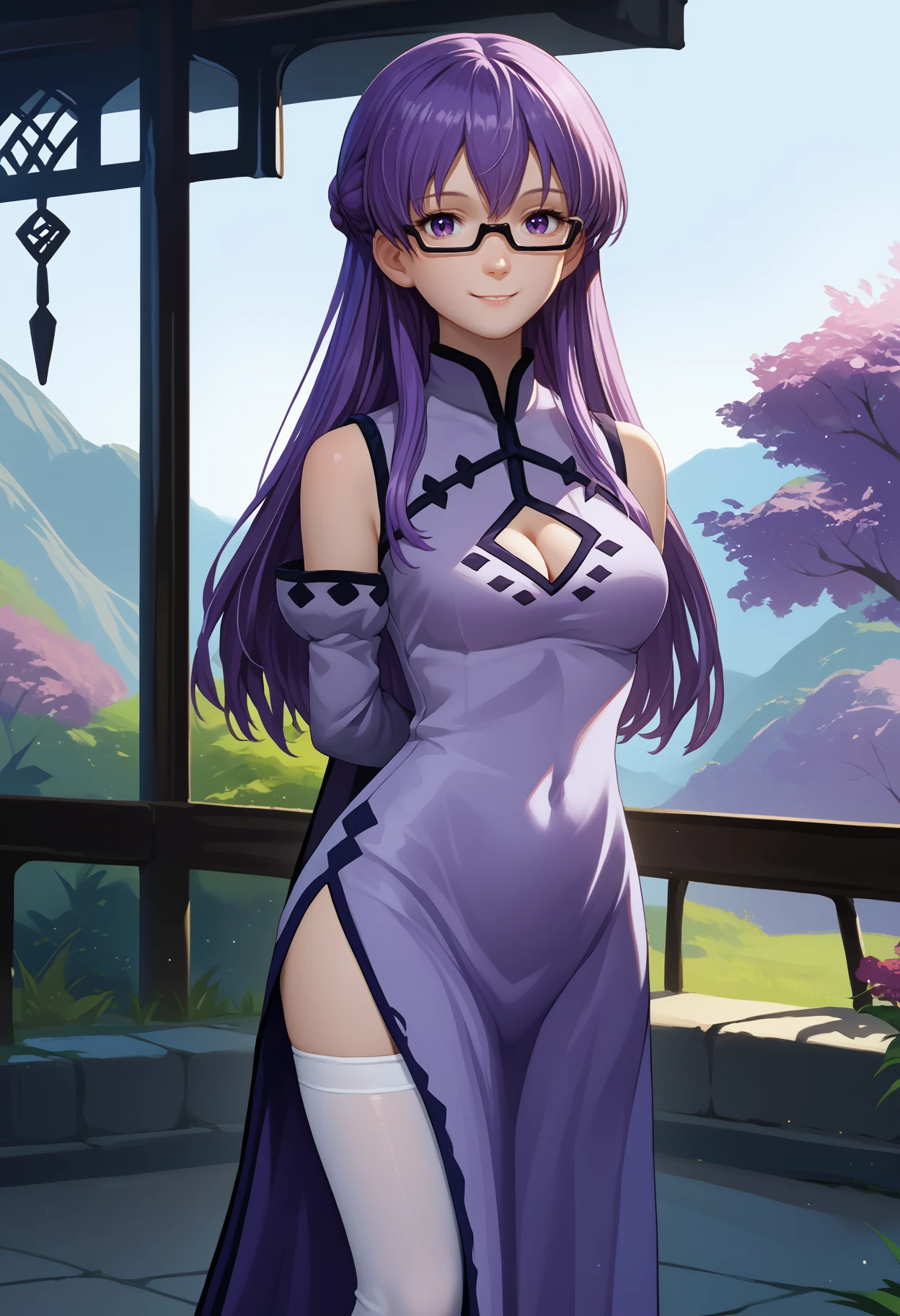 Default Outfit: glasses, purple dress, china dress, cleavage cutout, side slit, detached sleeves, white thighhighs, bare shoulders