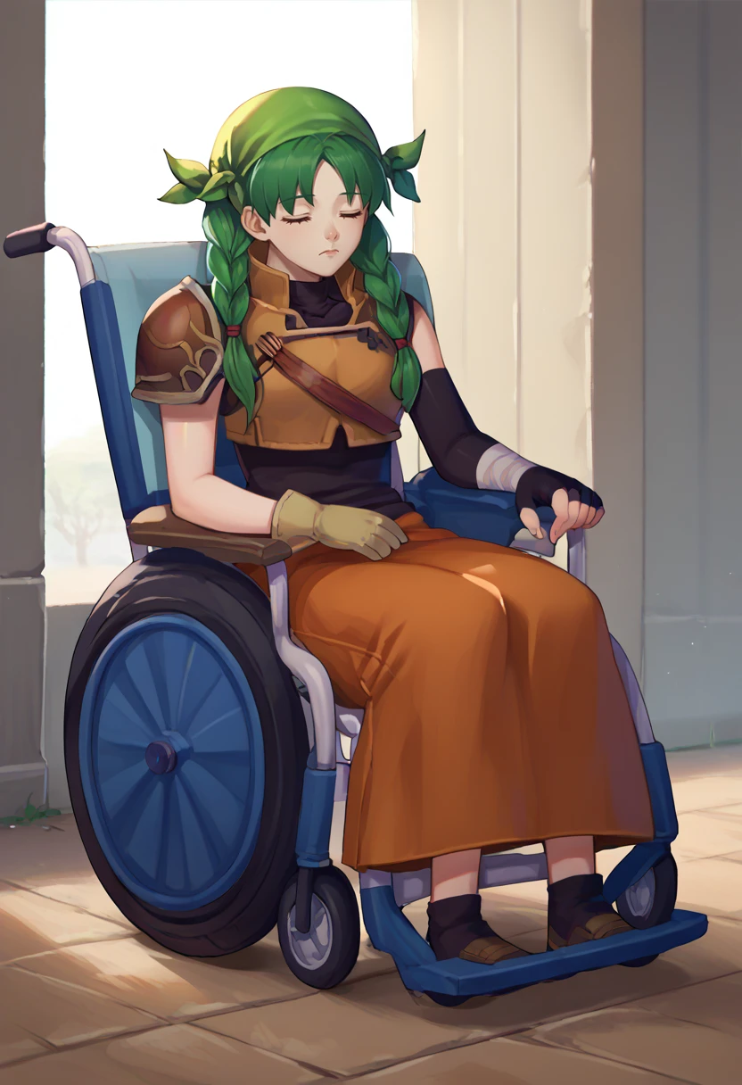Default Outfit: bandana, sleeveless, breastplate, shoulder armor, asymmetrical gloves, fingerless gloves, skirt