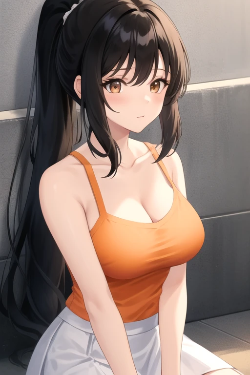 CattleyaGlory, 1girl, solo, long hair, white skirt, large breasts, orange shirt, black hair, bare shoulders, brown eyes, collarbone, ponytail, sleeveless, orange camisole,