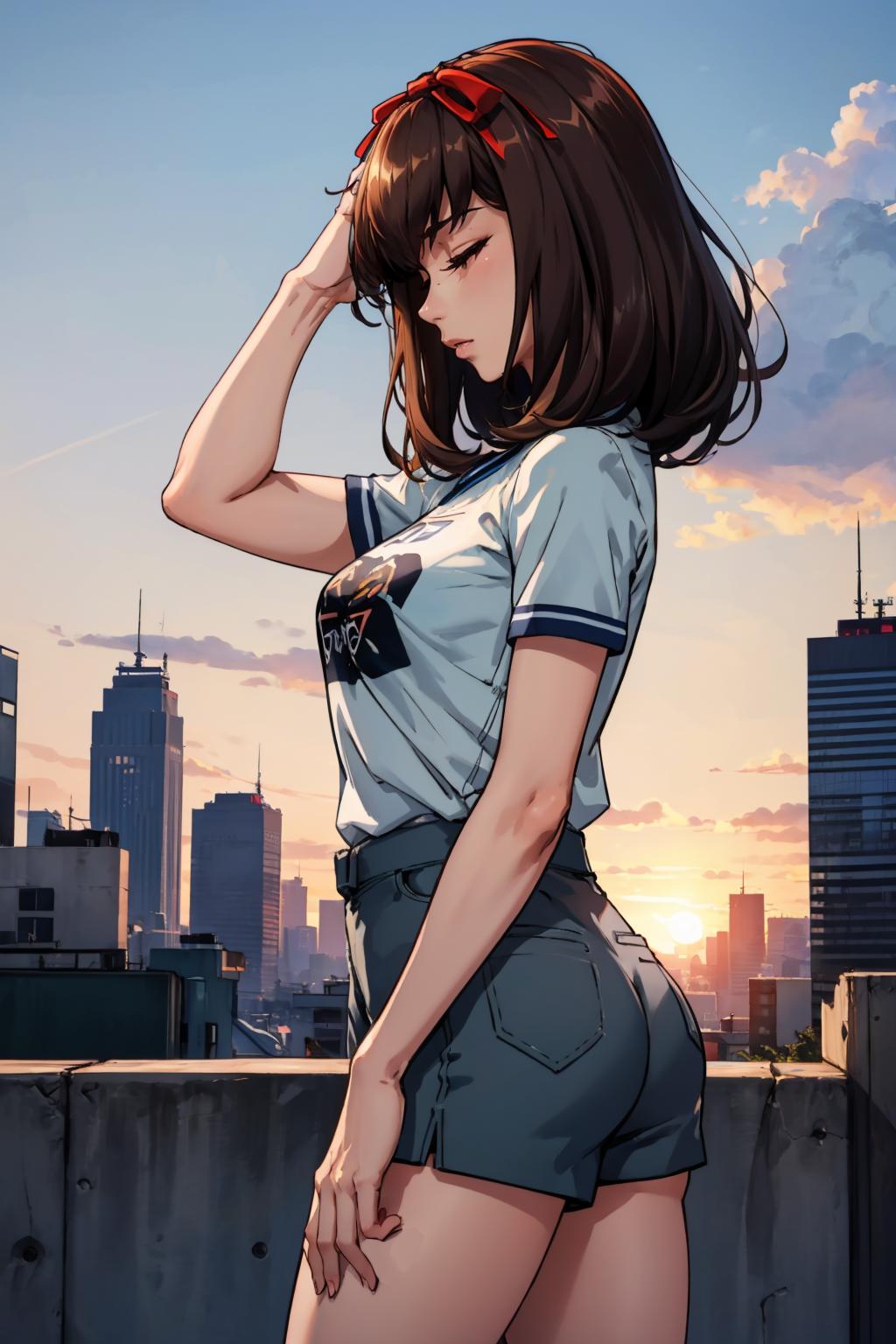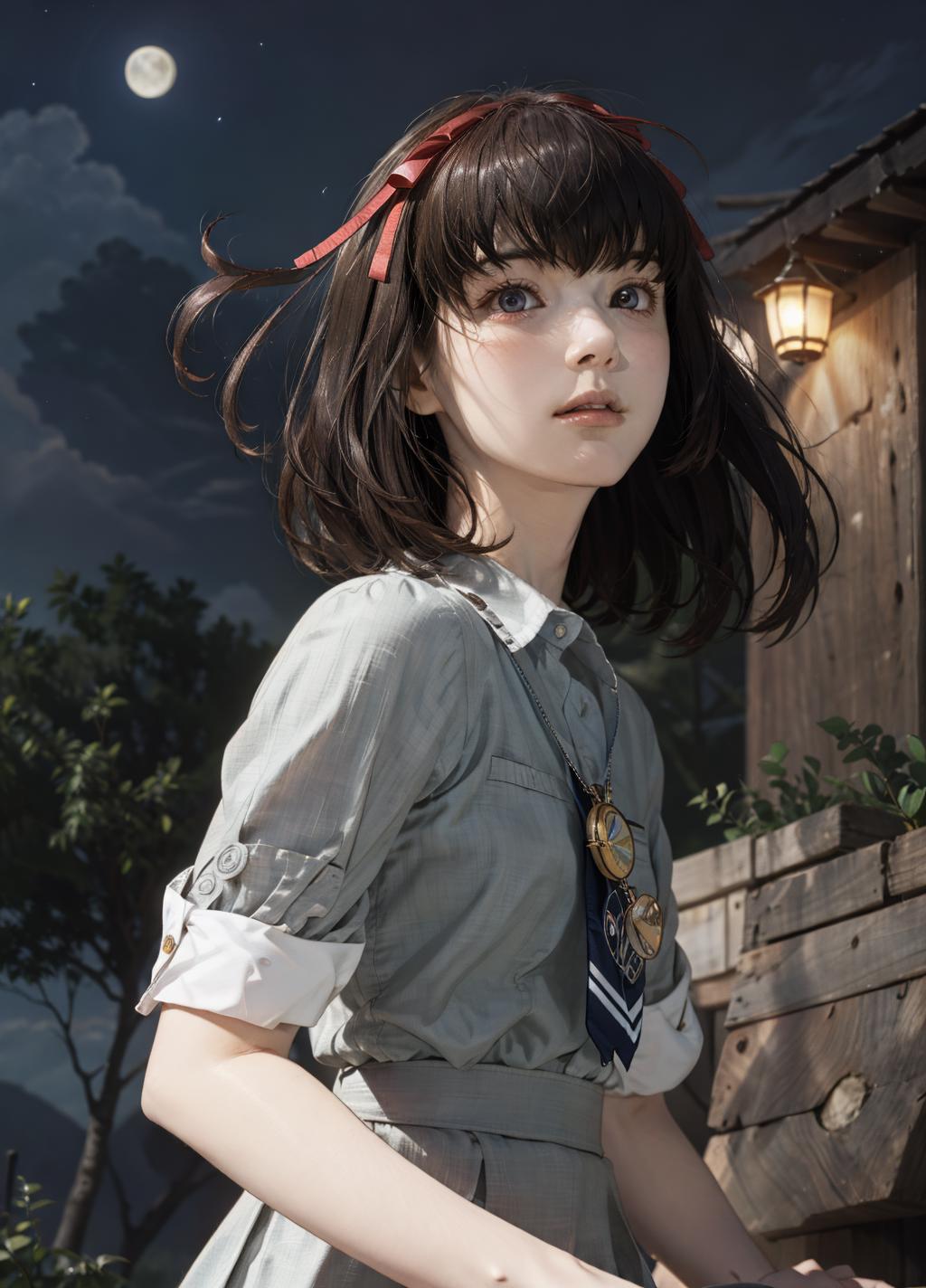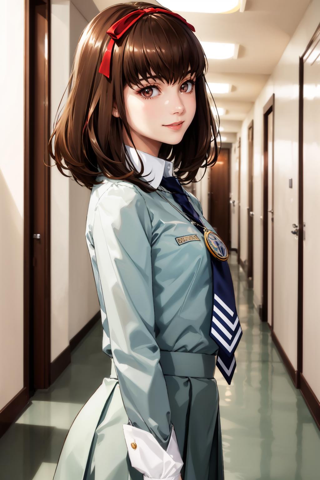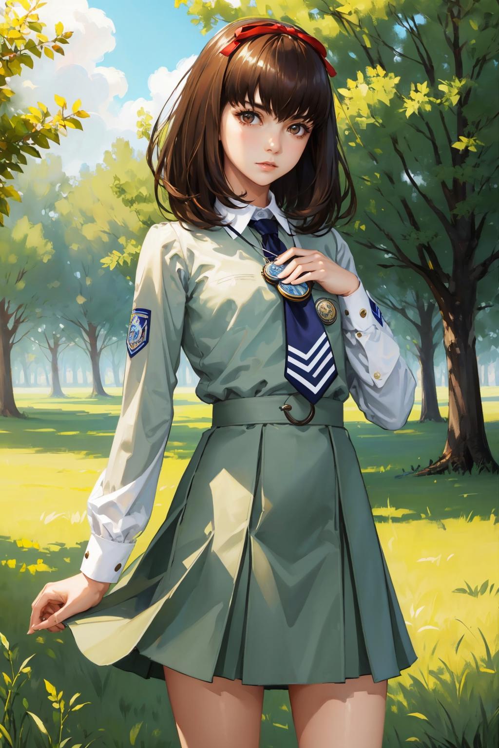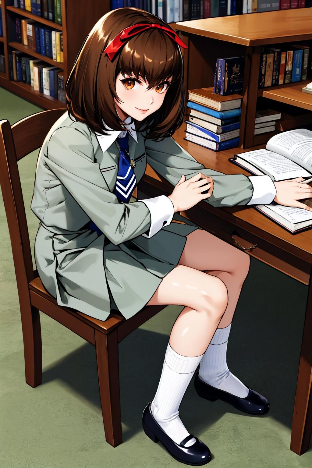 Add "pendant, hair ribbon, school uniform, skirt, socks, mary janes" for her typical look.