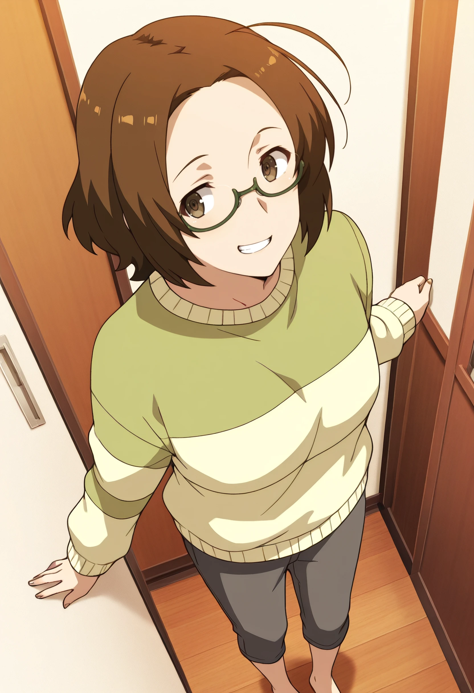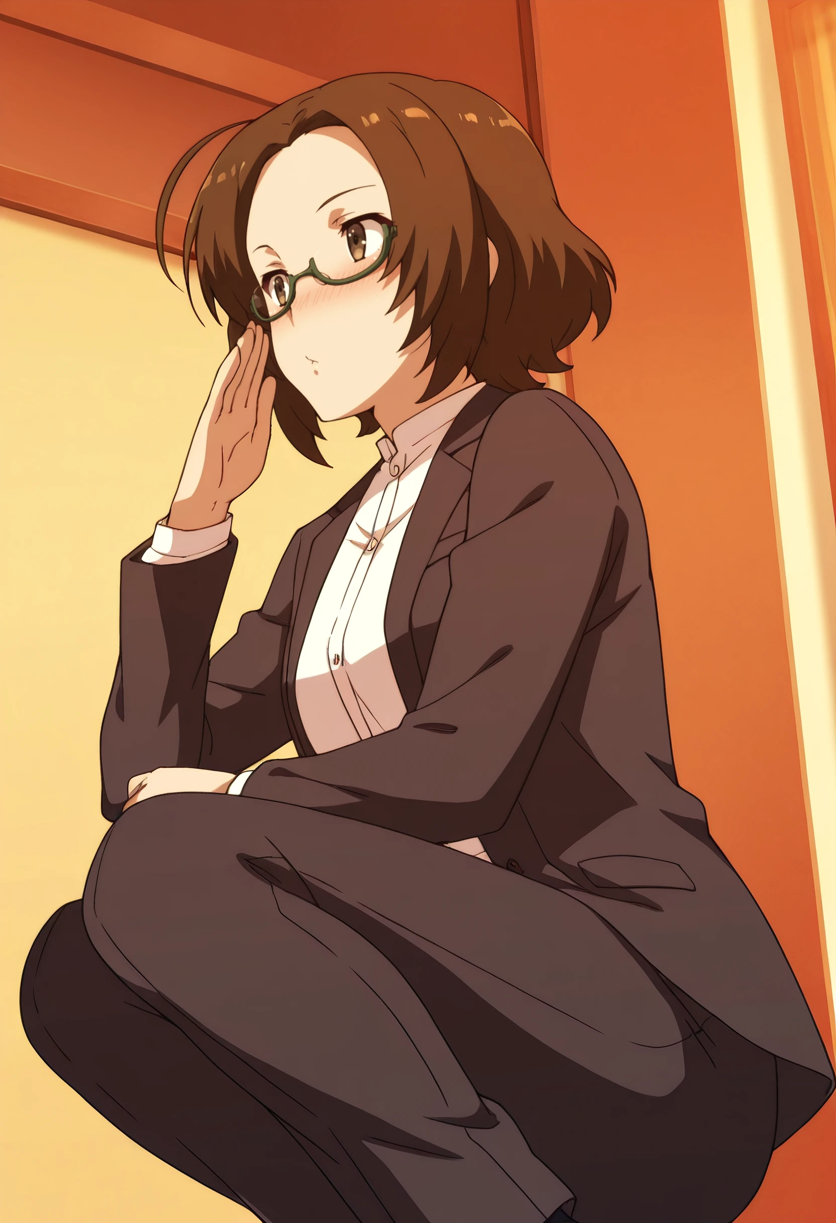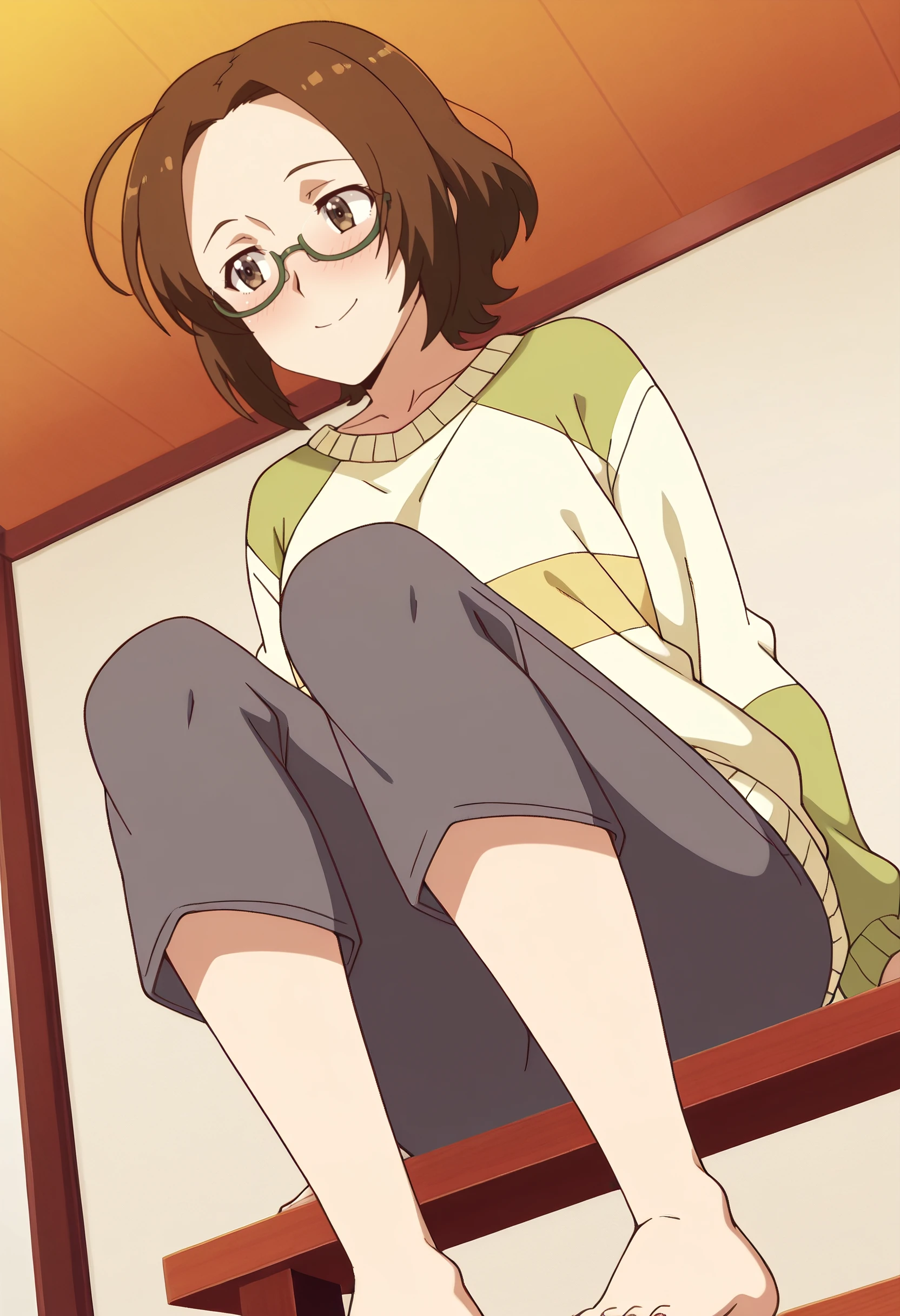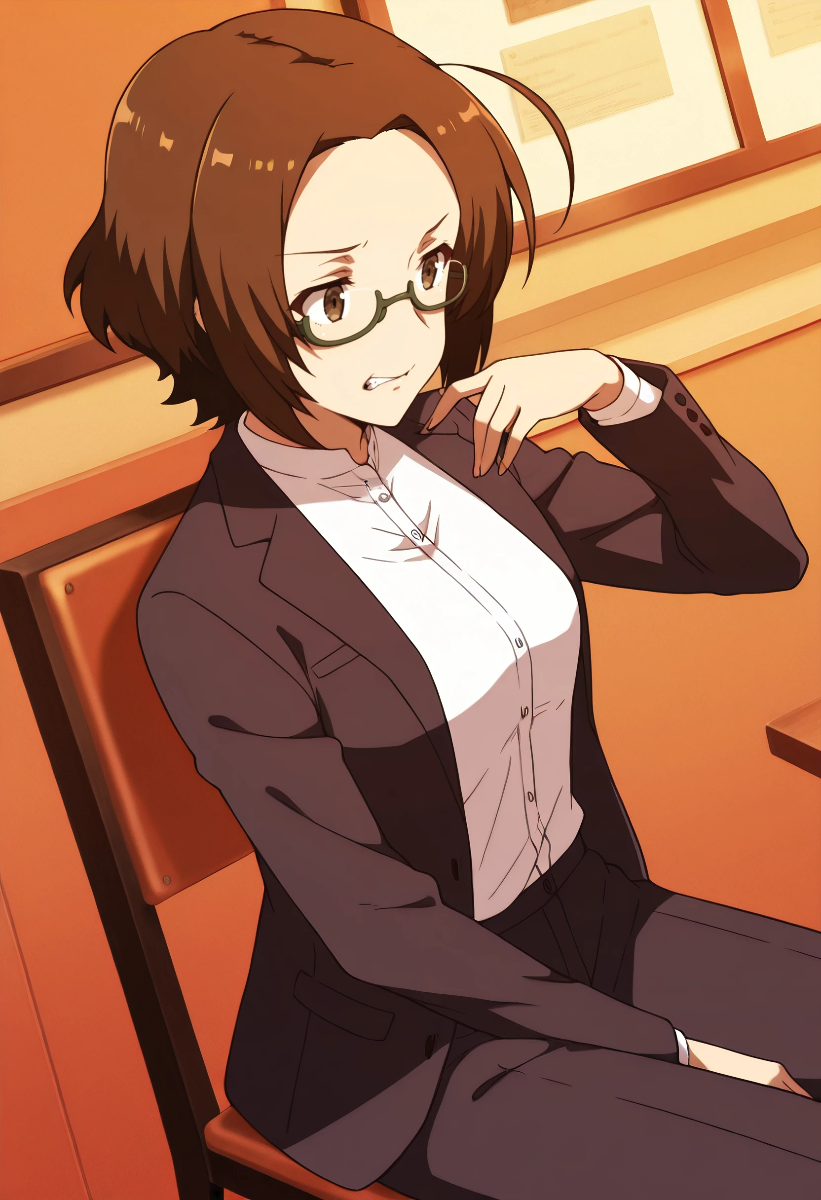 TNMRui, brown hair, glasses, short hair, brown eyes, semi-rimless eyewear, green-framed eyewear, rectangular eyewear, ahoge,