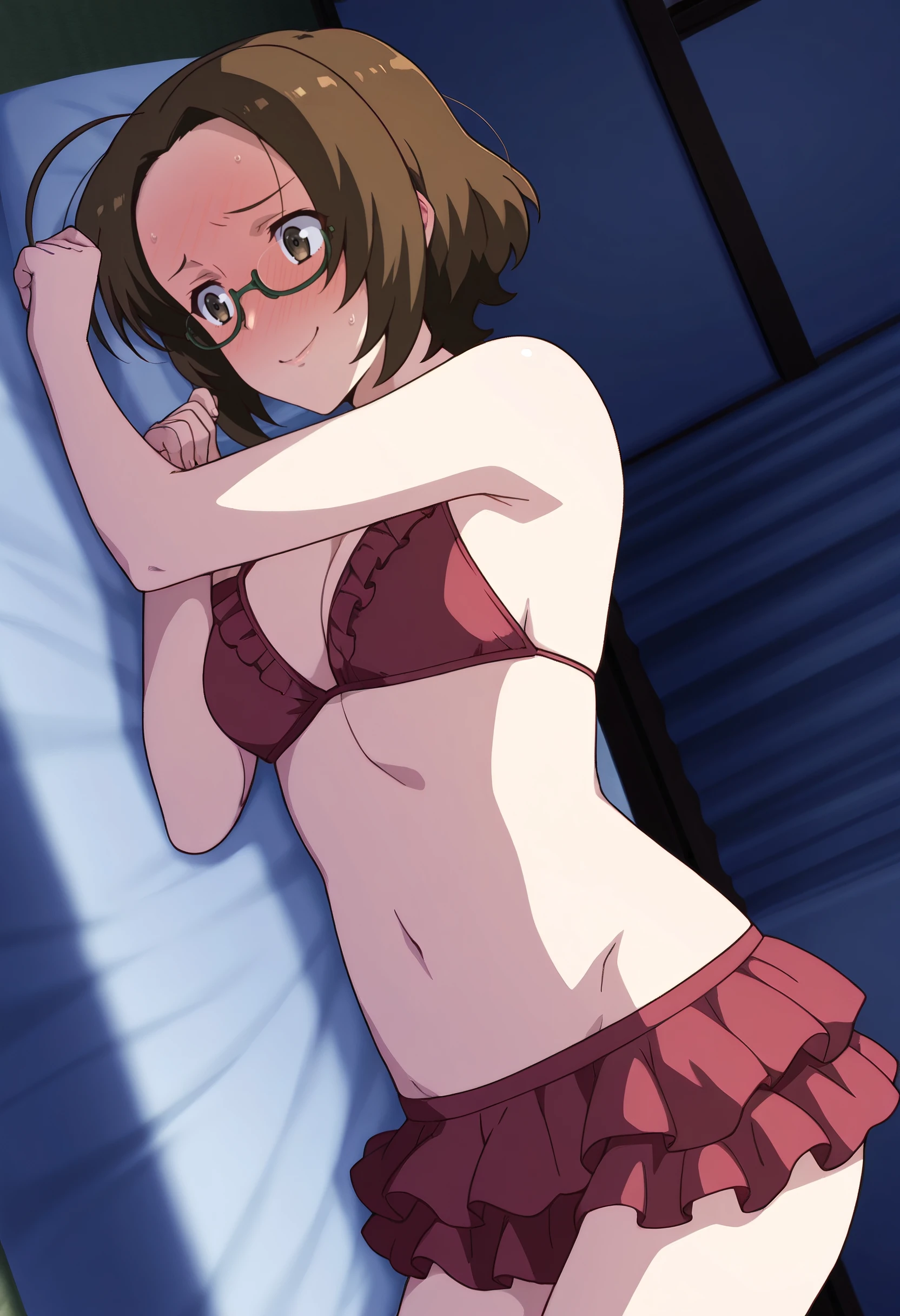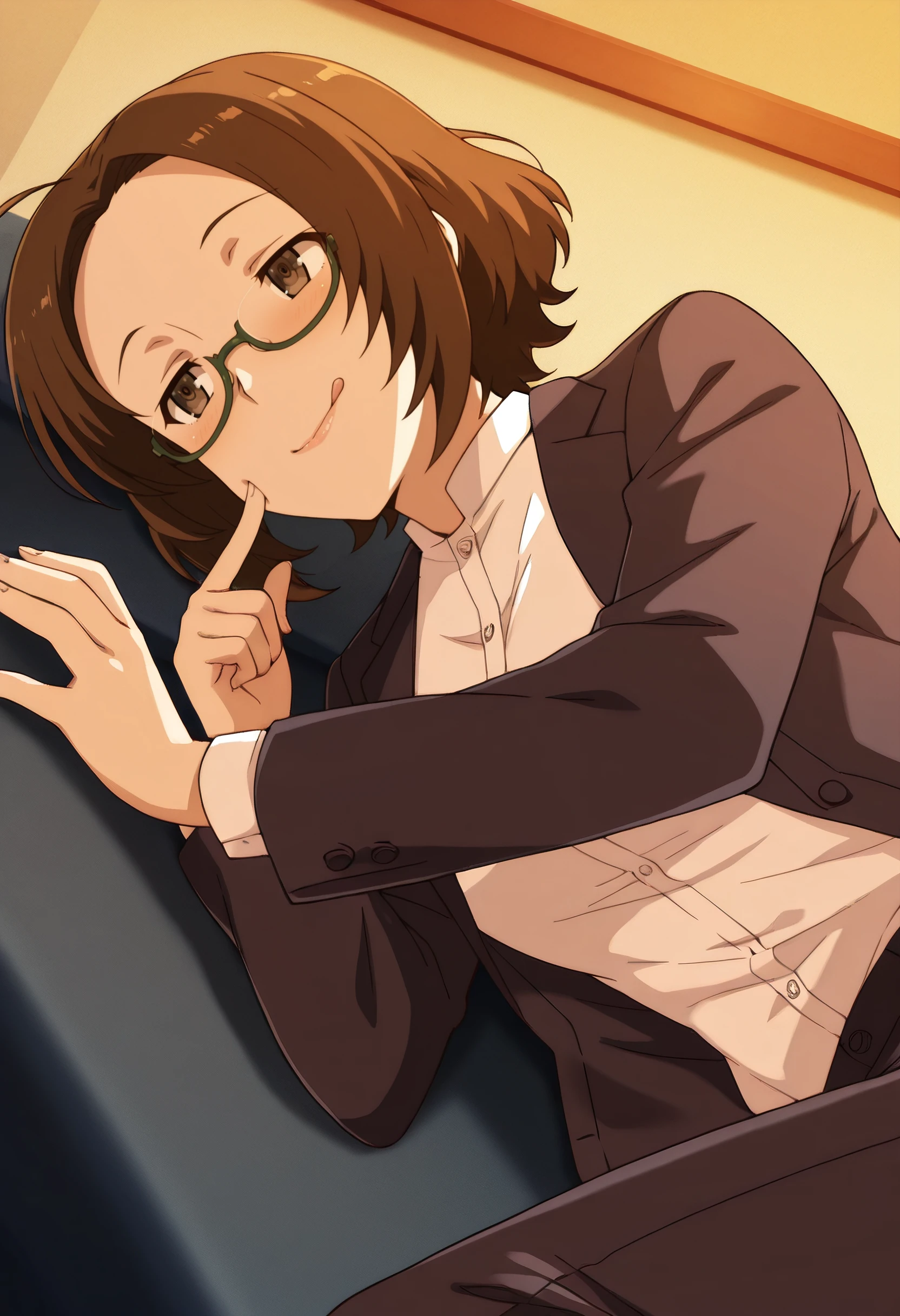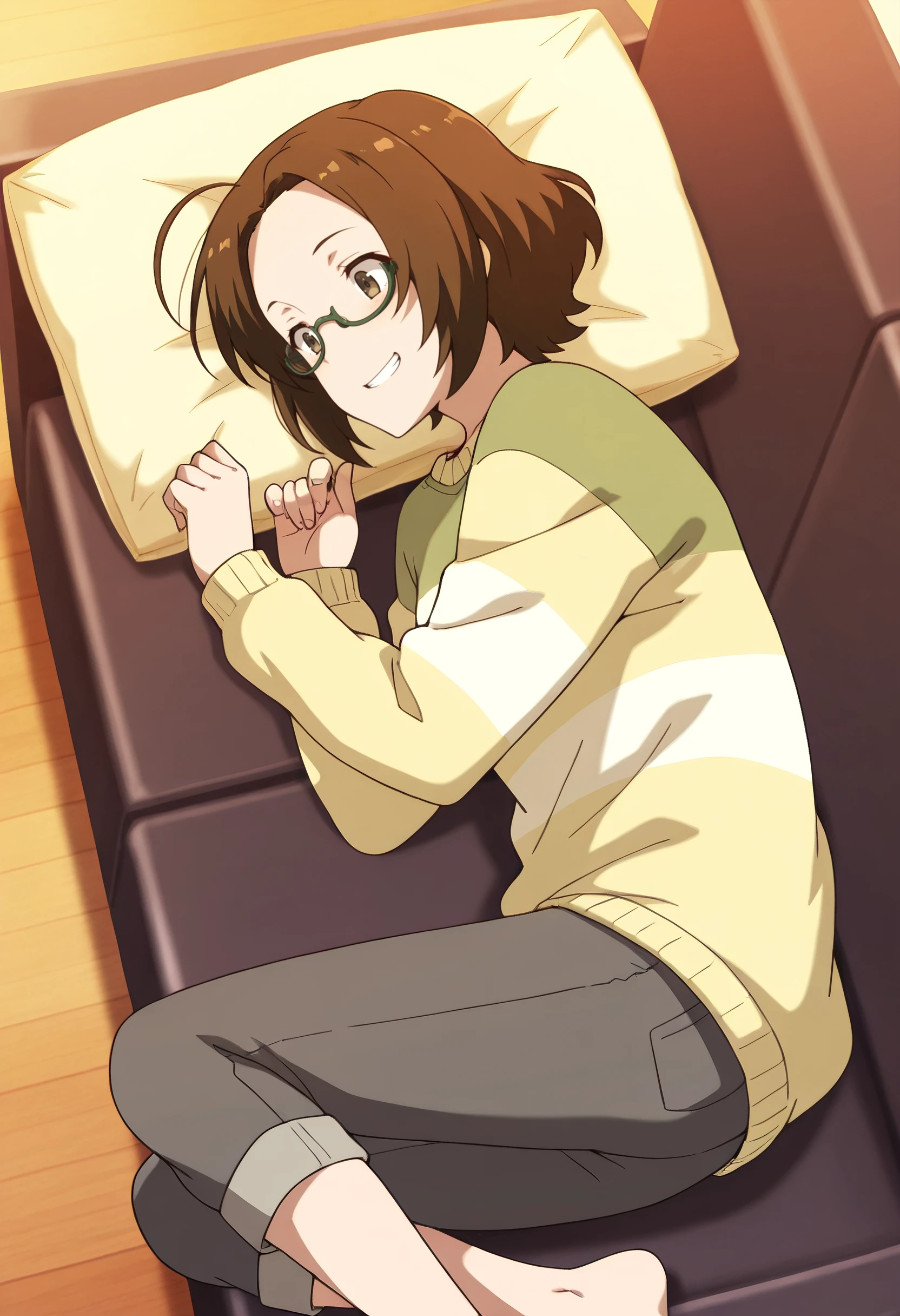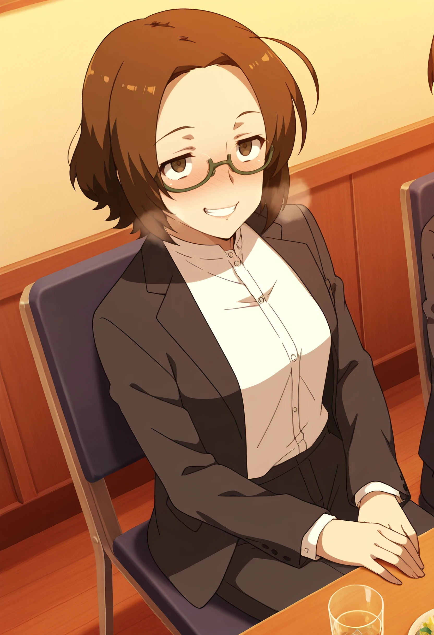 TNMRui, brown hair, glasses, short hair, brown eyes, semi-rimless eyewear, green-framed eyewear, rectangular eyewear, ahoge,