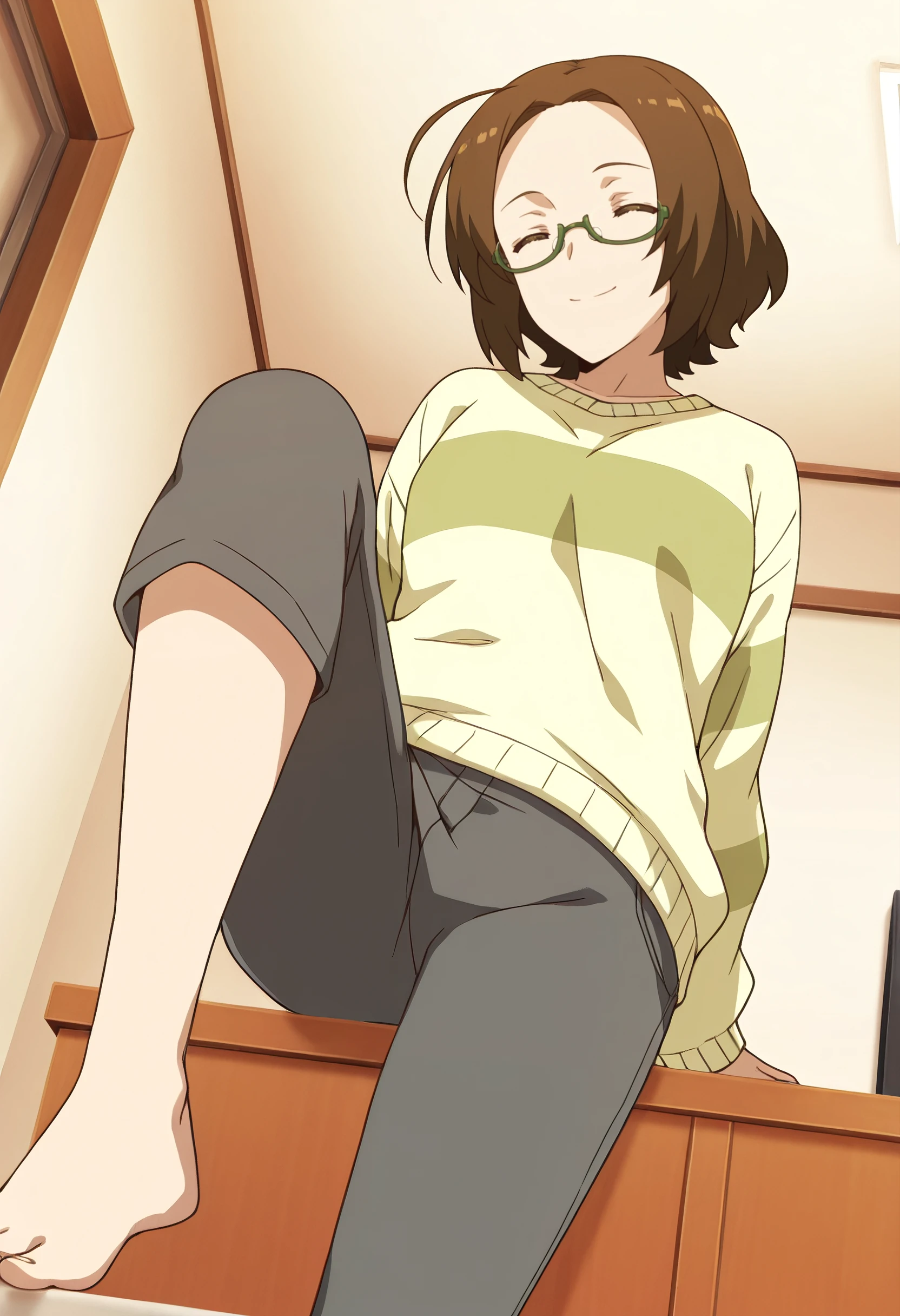 RuiSweater, sweater, long sleeves, pants, barefoot, green sweater, yellow sweater, striped clothes, striped sweater, capri pants, two-tone sweater, grey pants,