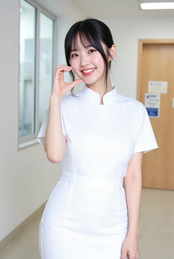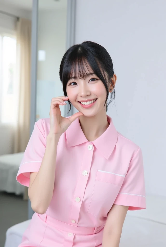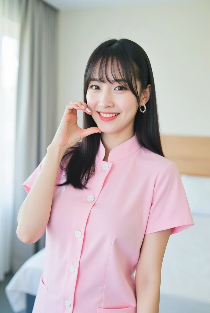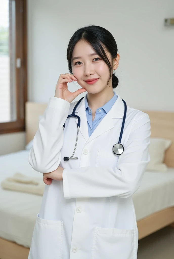 Makes the cheek heart pose, sometimes it is referred to as the Luda Cheek Heart Sign or other such names after the Kpop star that made it popular.