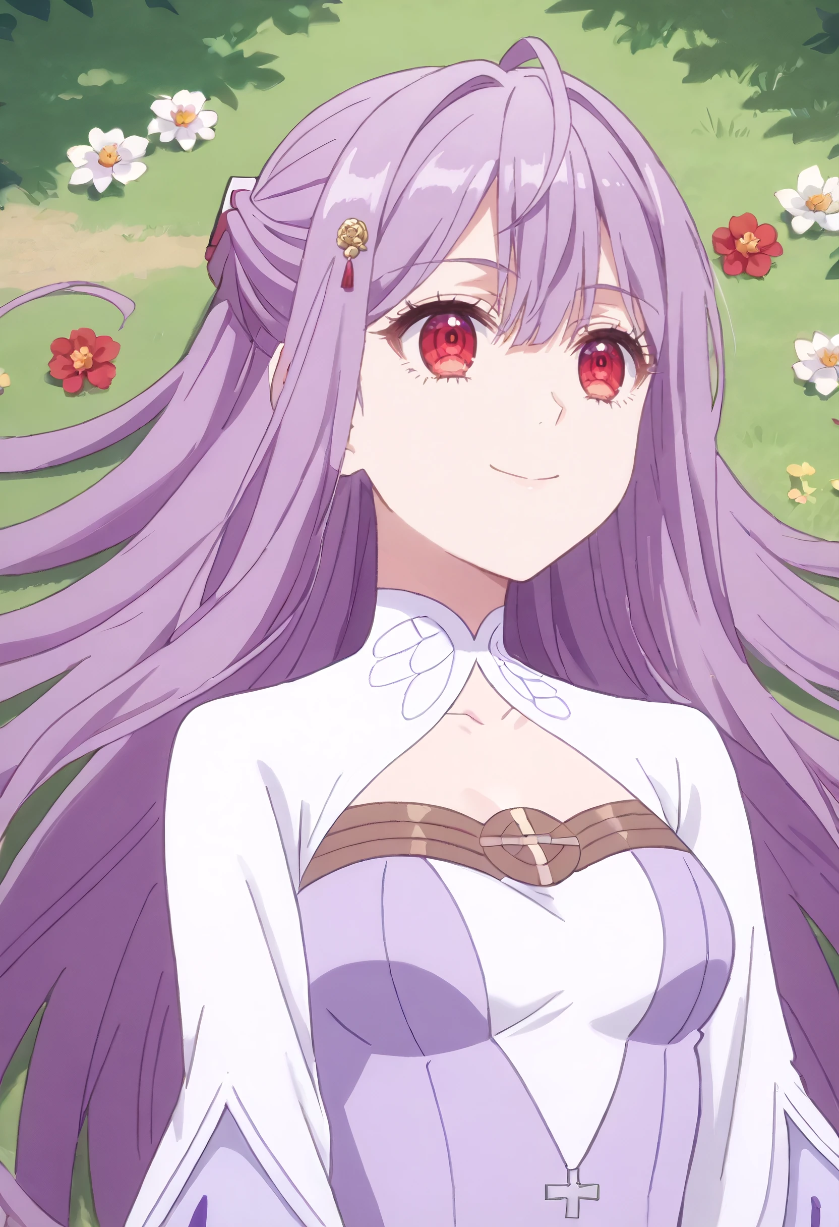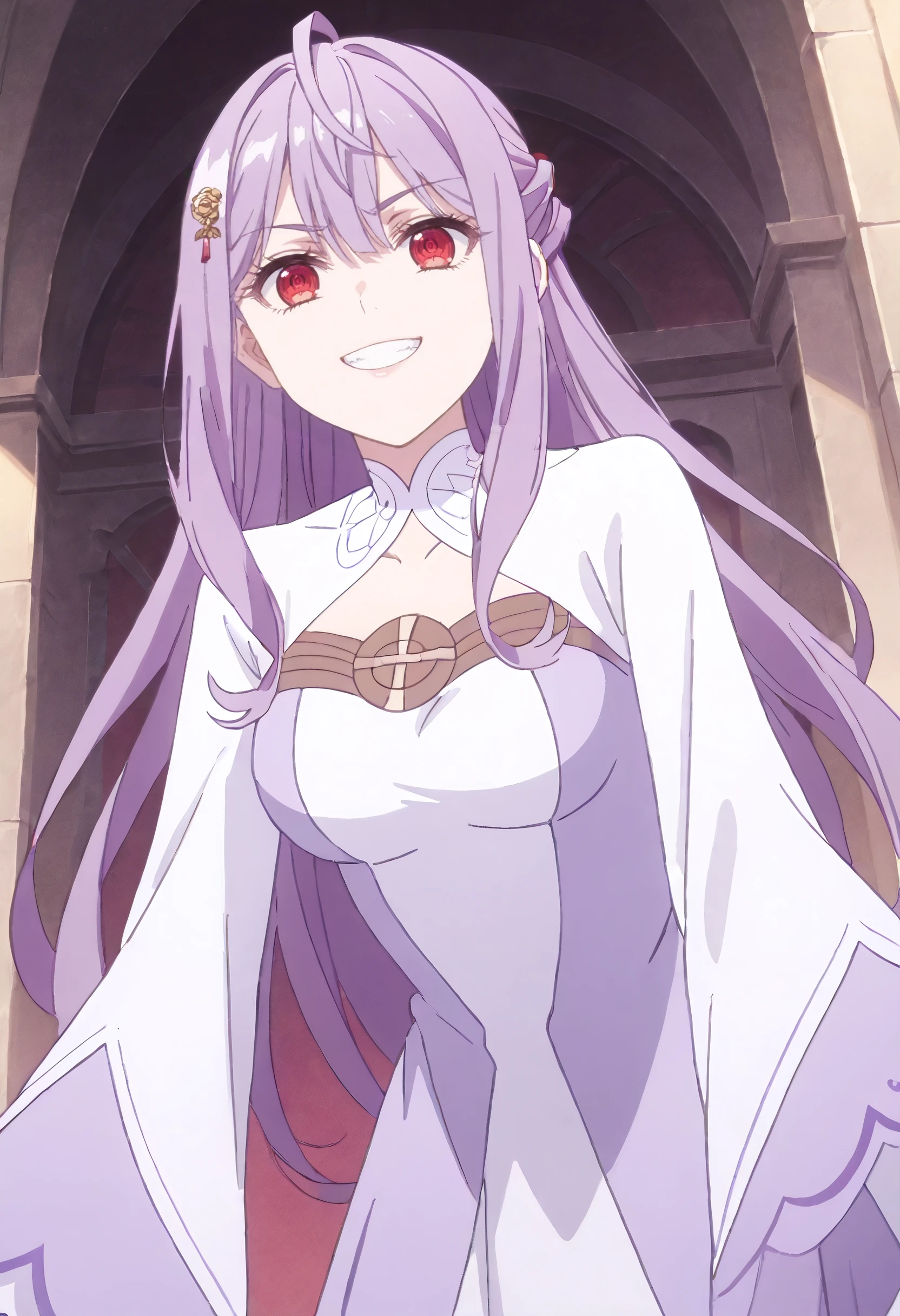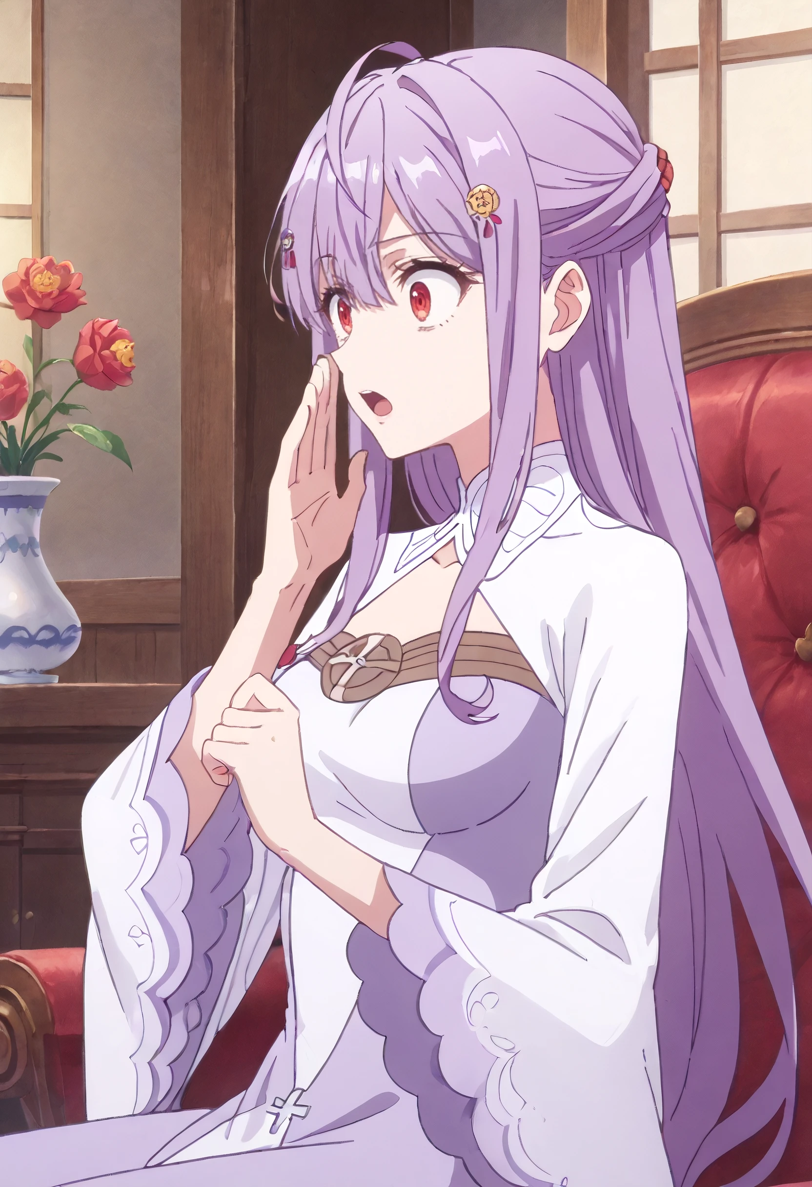 MiaOutfit, dress, hair ornament, white dress, long sleeves, flower, half updo, hair flower, clothing cutout, wide sleeves, red flower, cleavage cutout, purple dress, gradient dress, shrug (clothing), white shrug, tassel hair ornament, long dress, two-tone dress, hairclip,