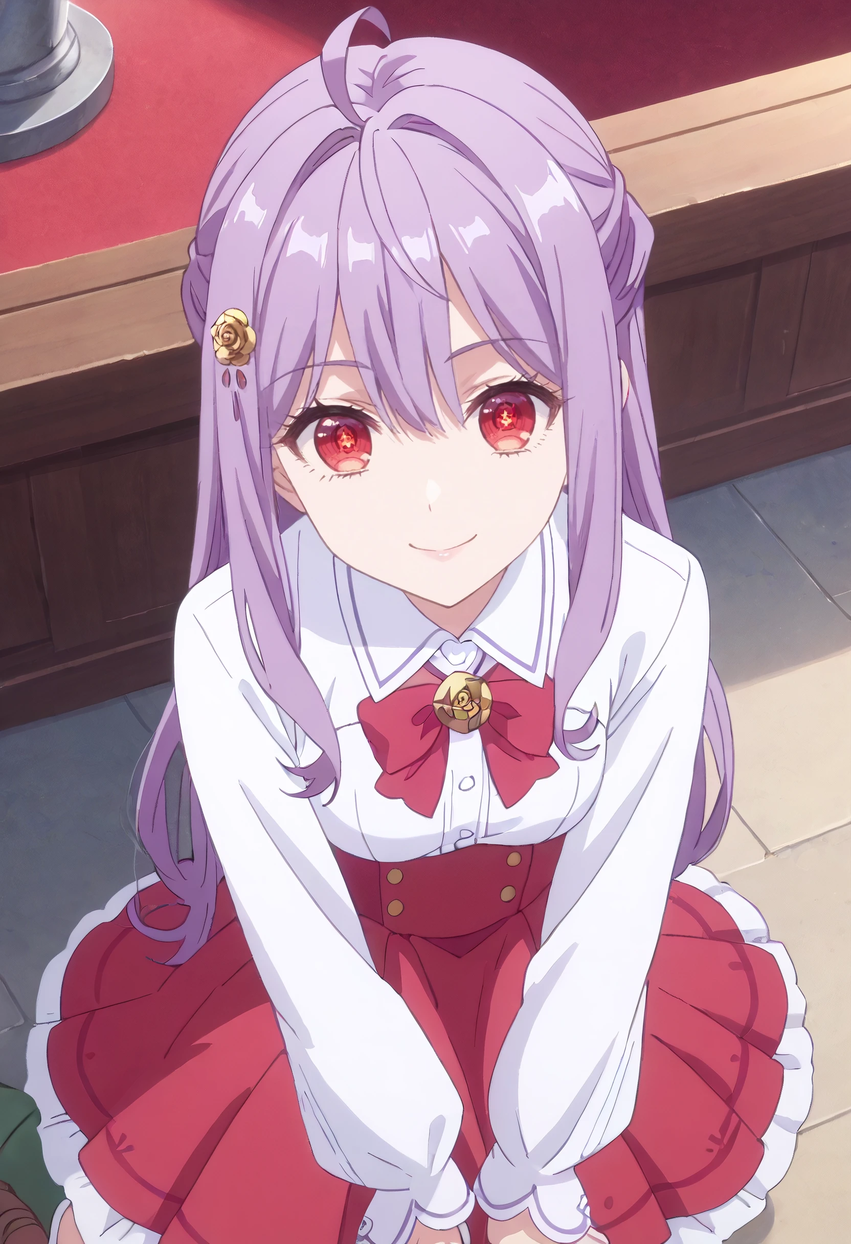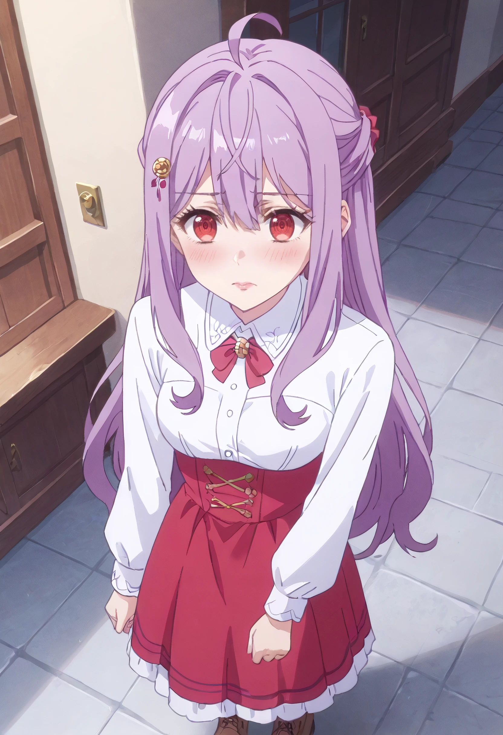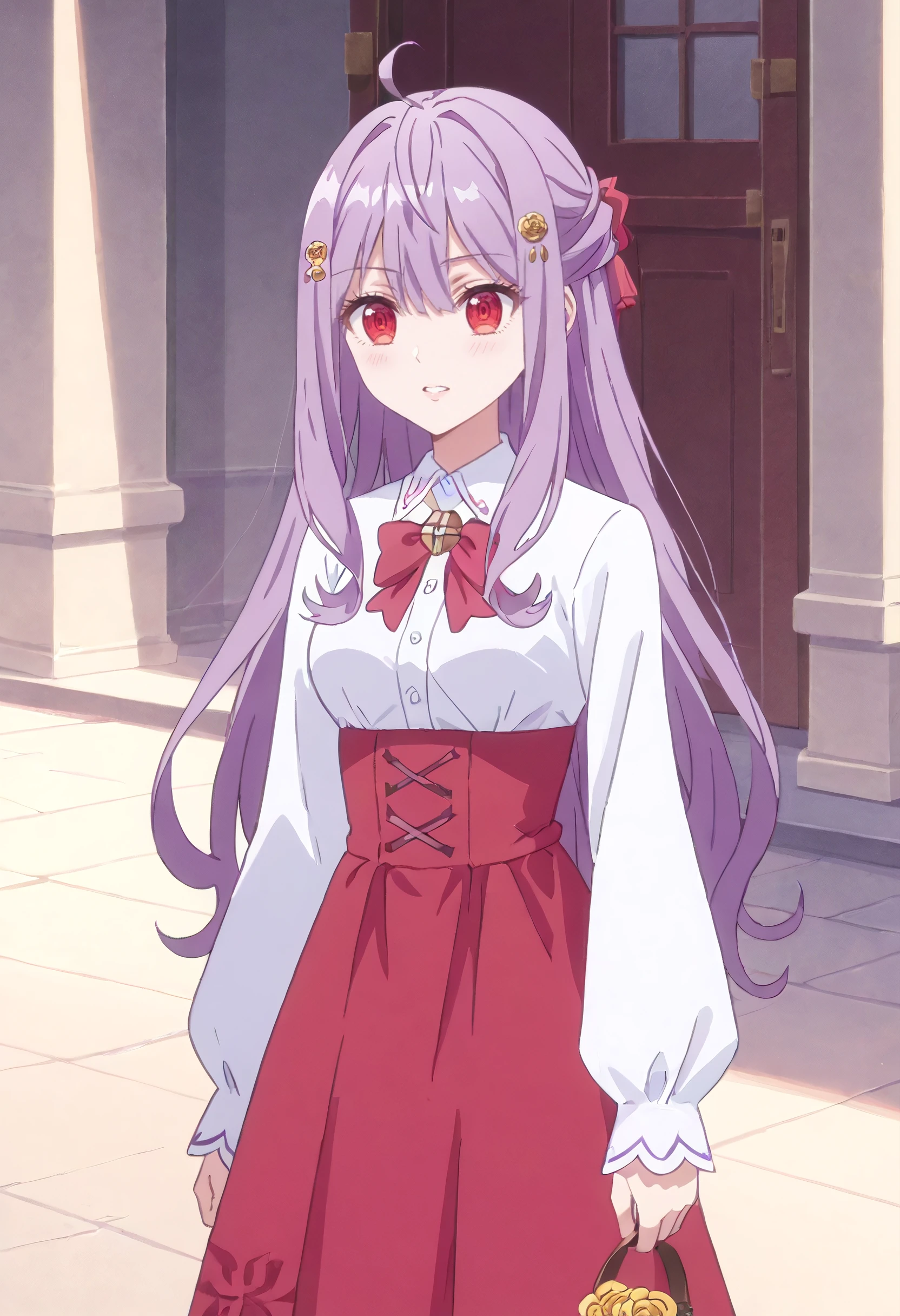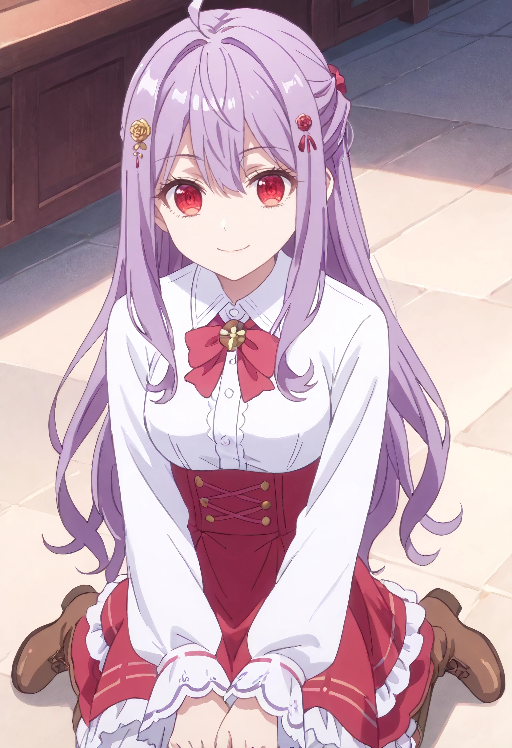 MiaSkirt, long sleeves, shirt, white shirt, red skirt, half updo, skirt, hair ornament, bow, long skirt, high-waist skirt, boots, pink bow, hair flower, brown footwear, red bow, flower, rose, collared shirt, layered skirt,