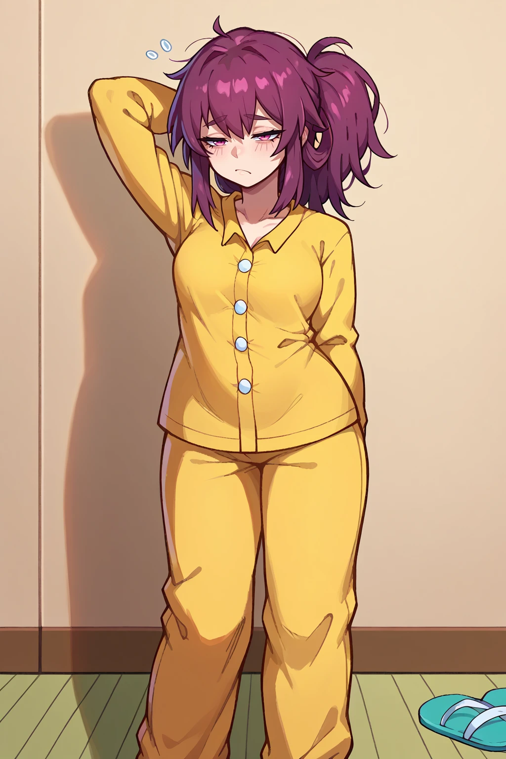 Appearance: NSKafkaMisc, long hair, bangs, sidelocks, ponytail + eyewear on head, sunglasses + purple eyes, purple hair, medium hair