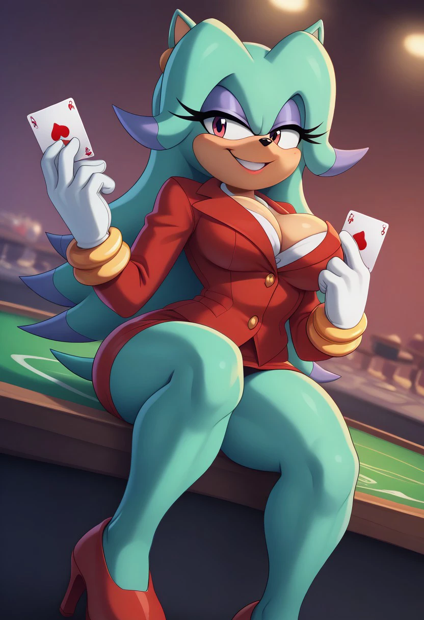 Breezie the Hedgehog, teal skin, lavender eyes, purple eyeshadow, red suit, white gloves, red heels