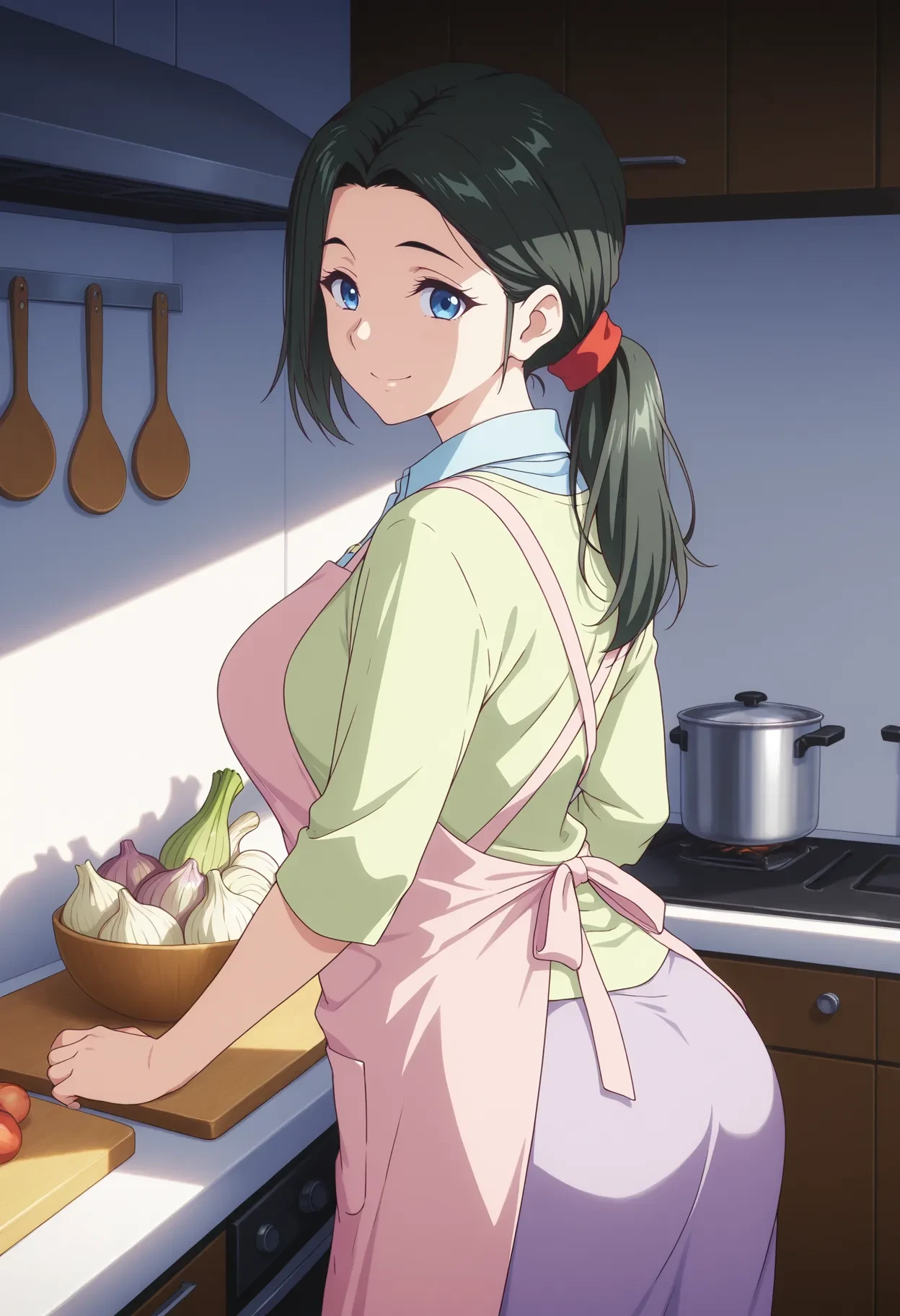 Appearance (Default) : HaruMama, black hair, long hair, bangs, ponytail, scrunchie, eyelashes, blue eyes, medium breast,