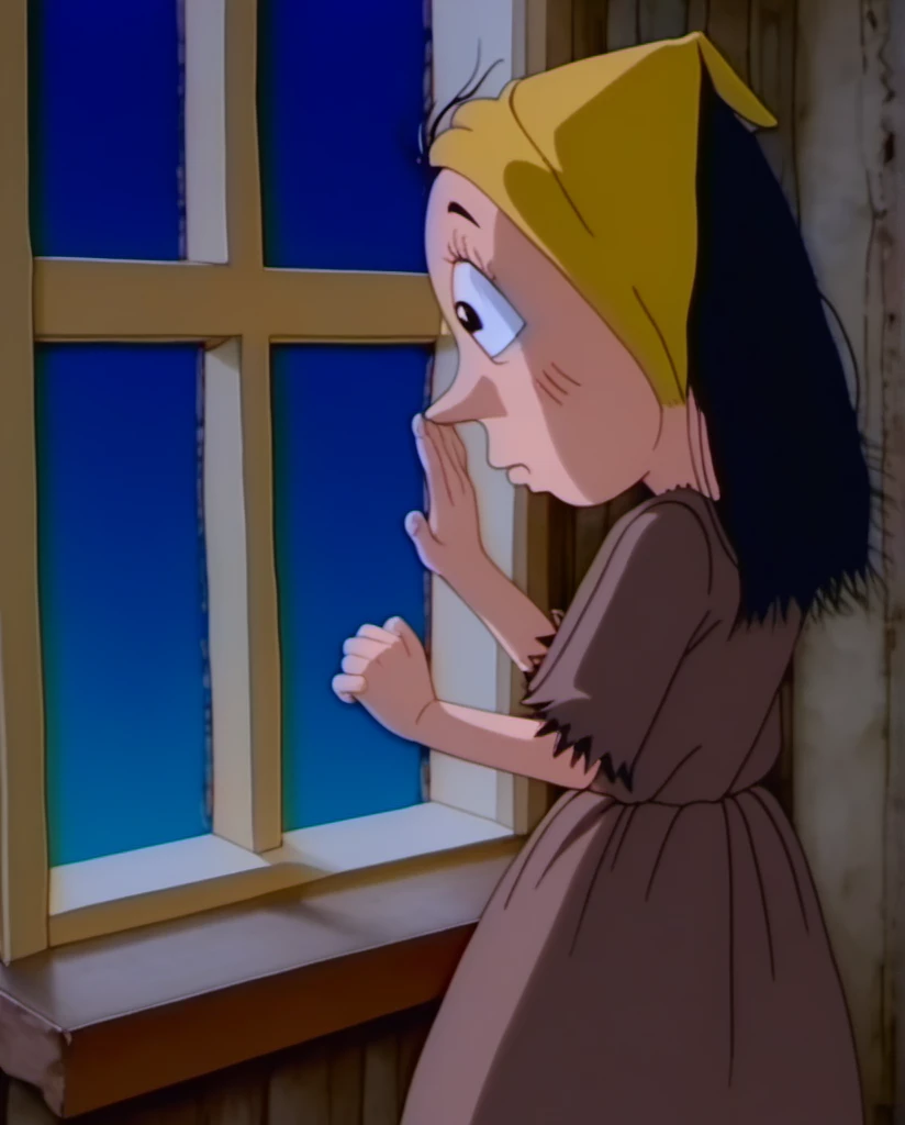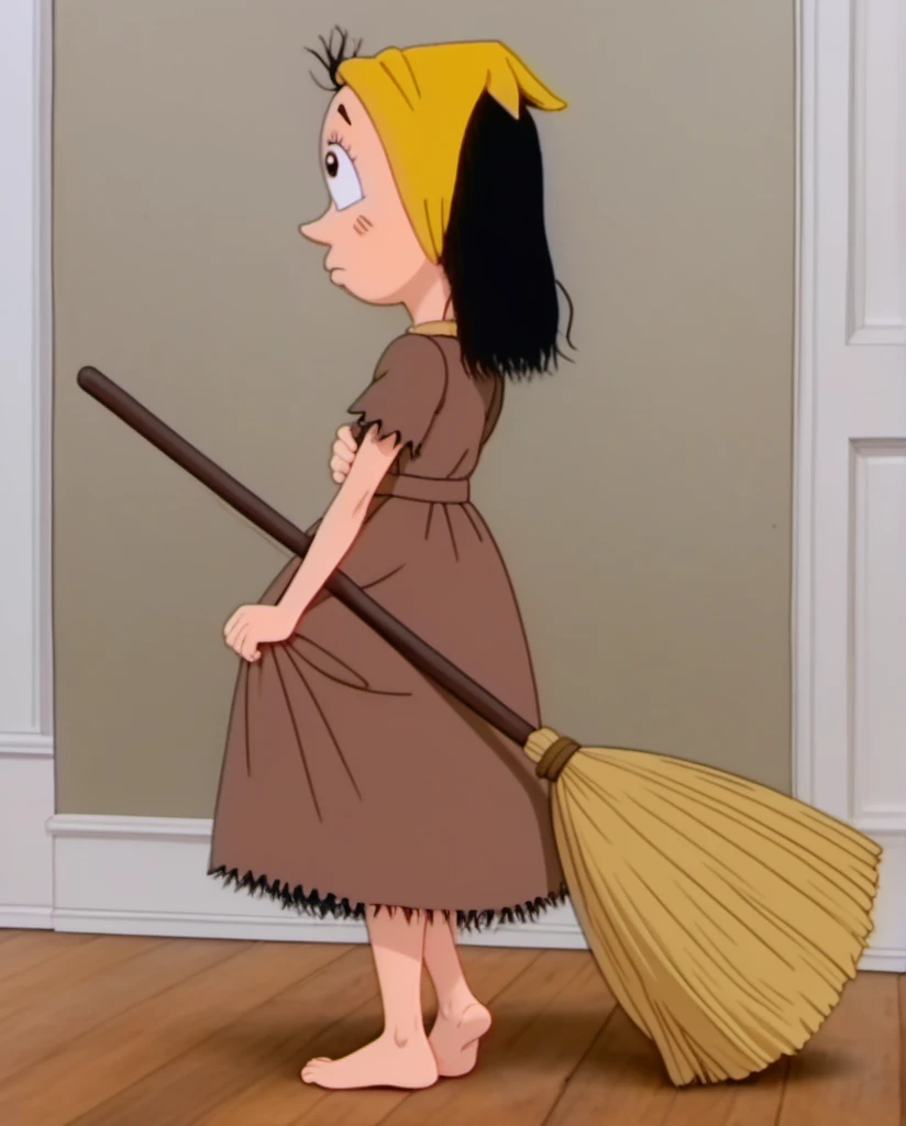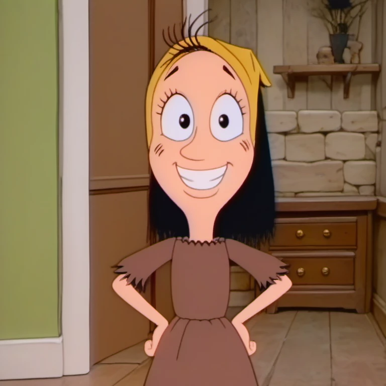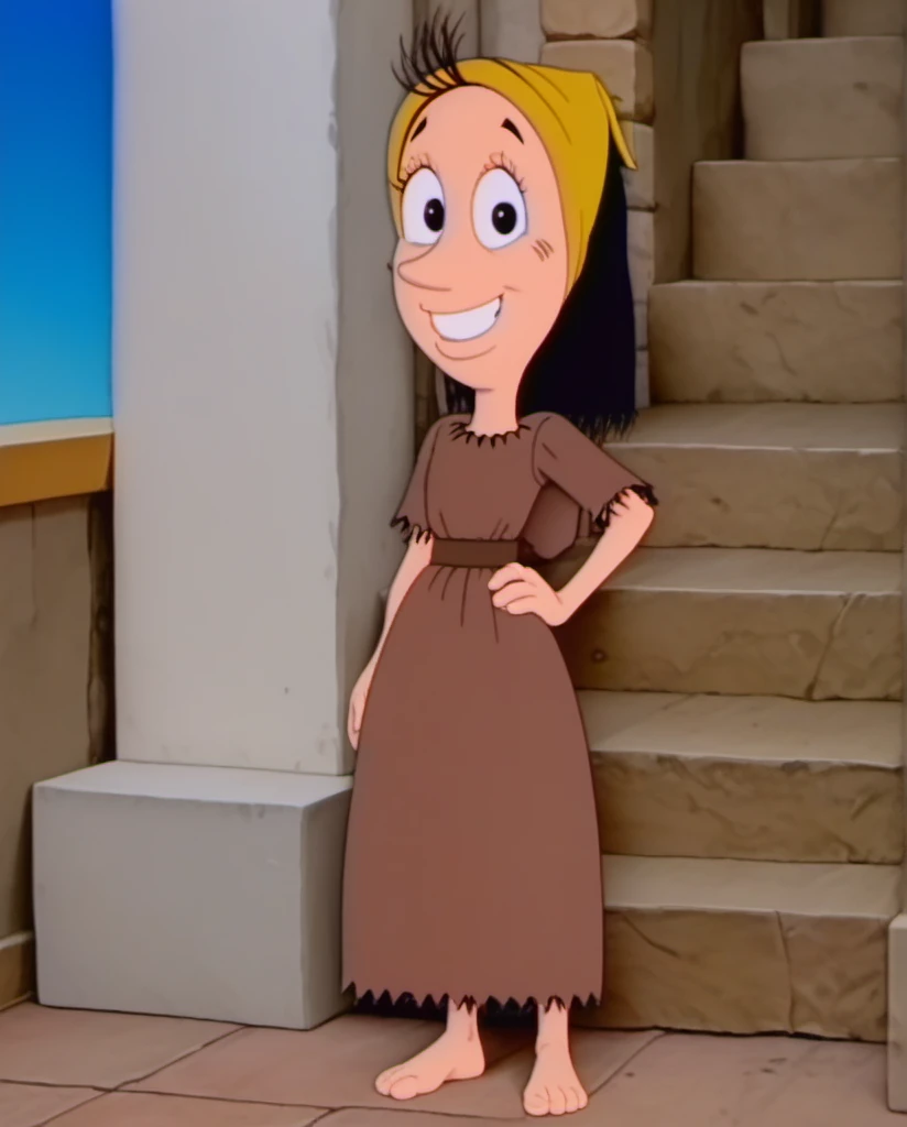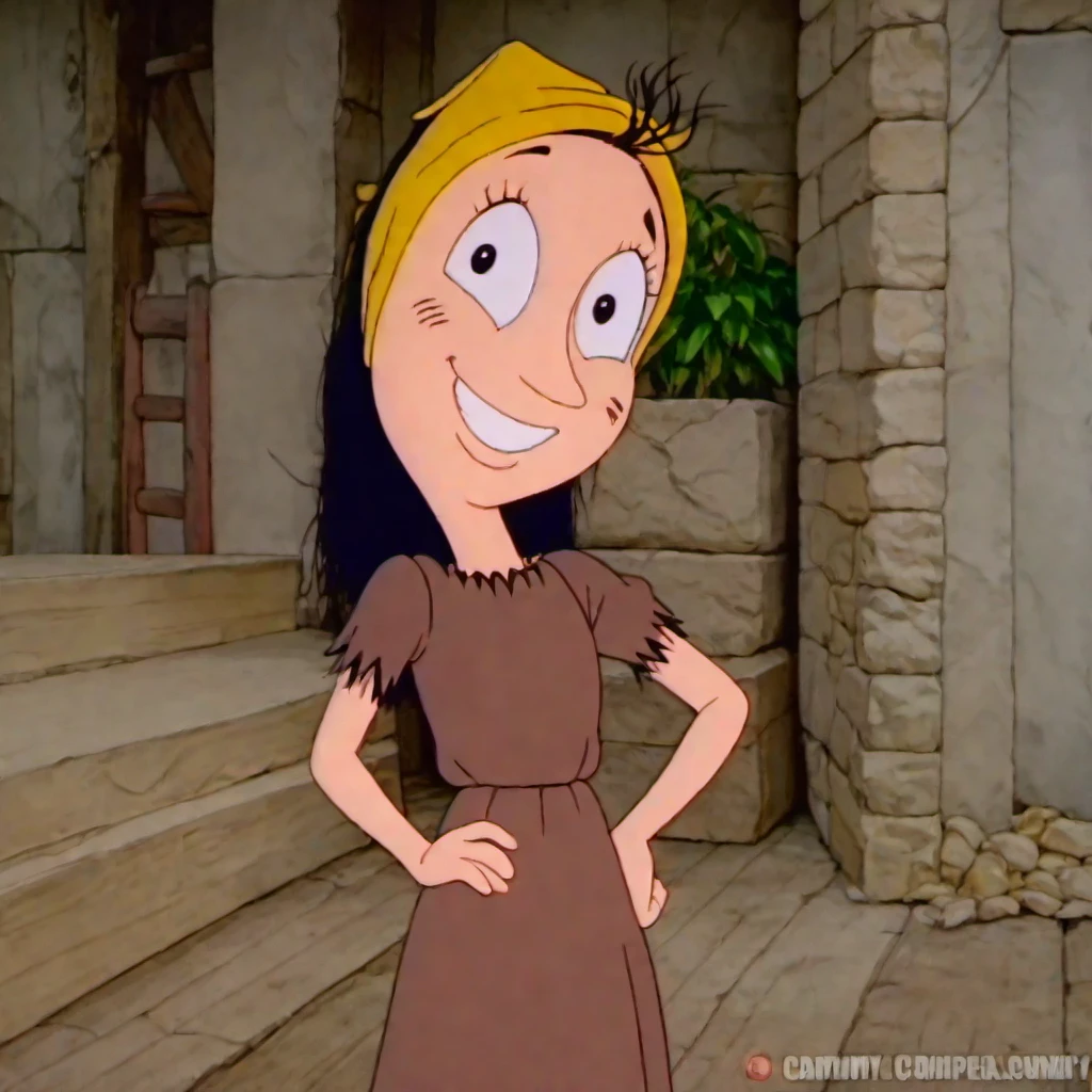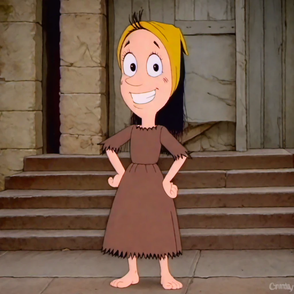 1girl, solo, cinbrit, smile, grin, looking at viewer, black hair, yellow headscarf, brown dress, barefoot, <lora:cinbrit:1>