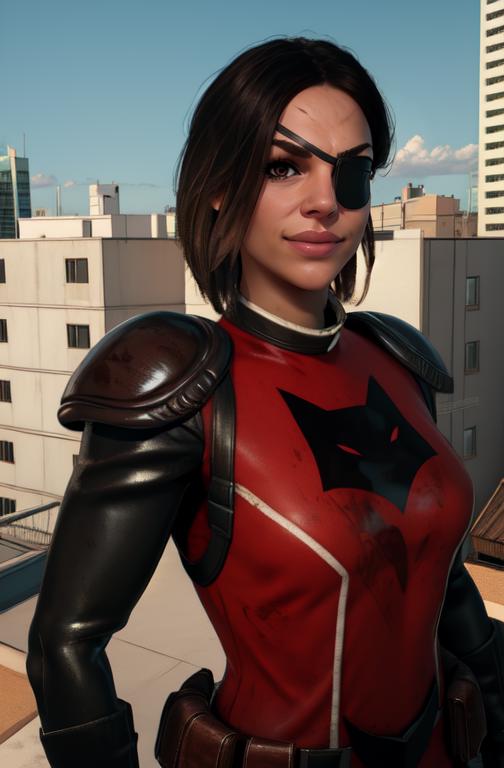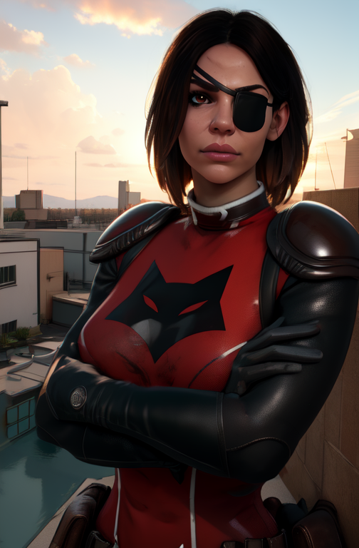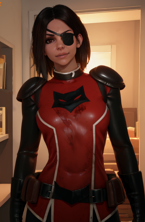 shoulder armor, black gloves, red bodysuit, black pants, utility belt, red boots, chest logo,