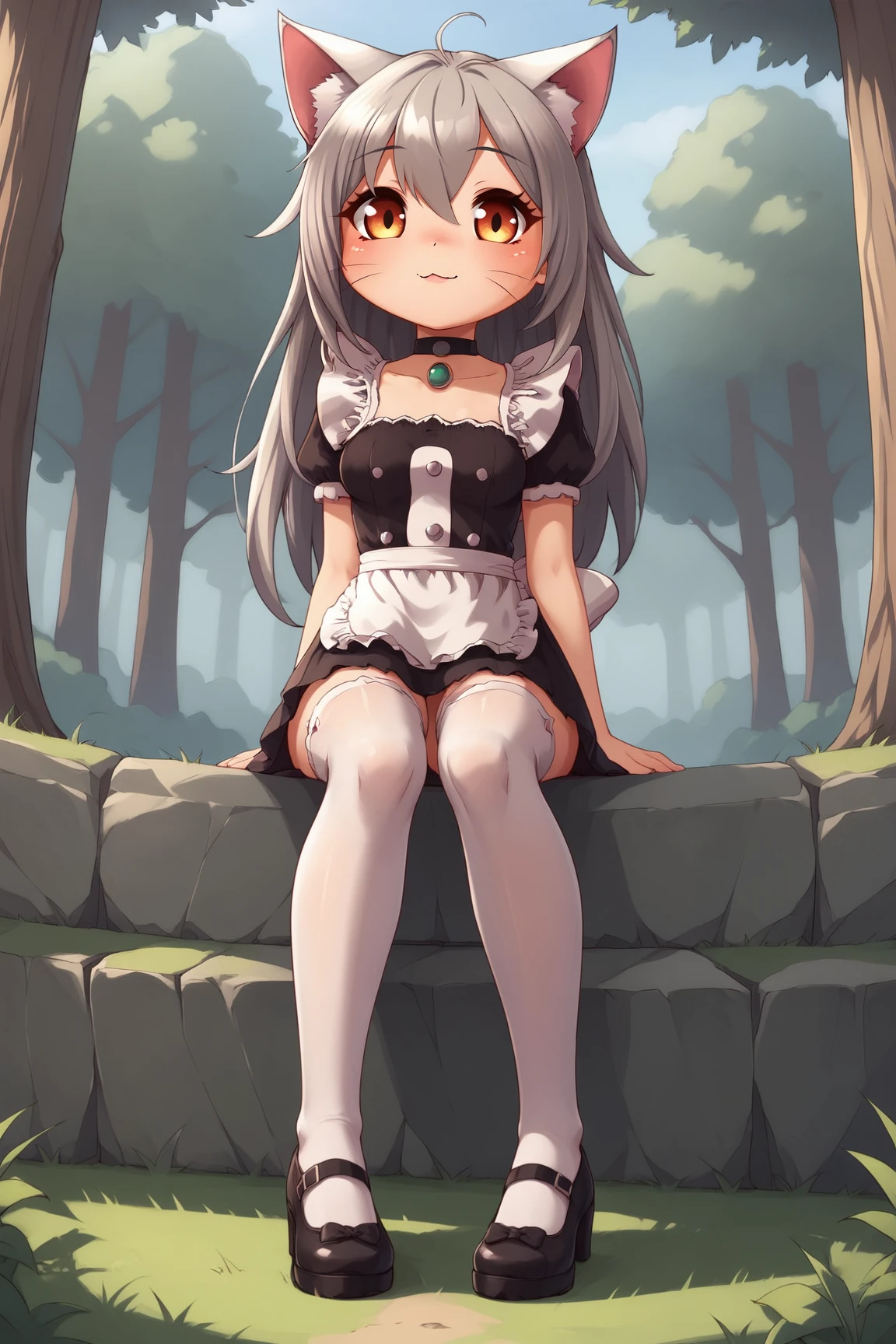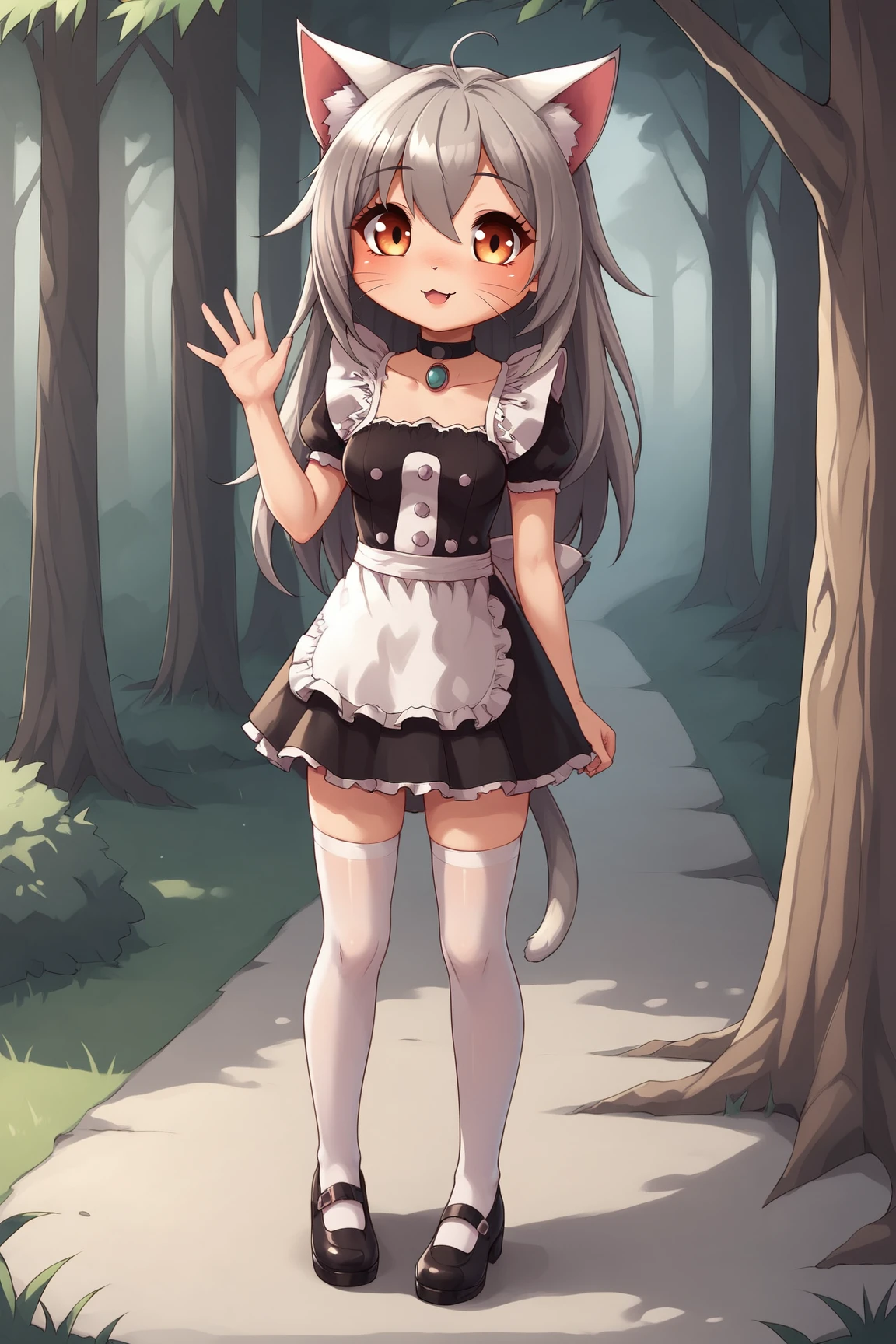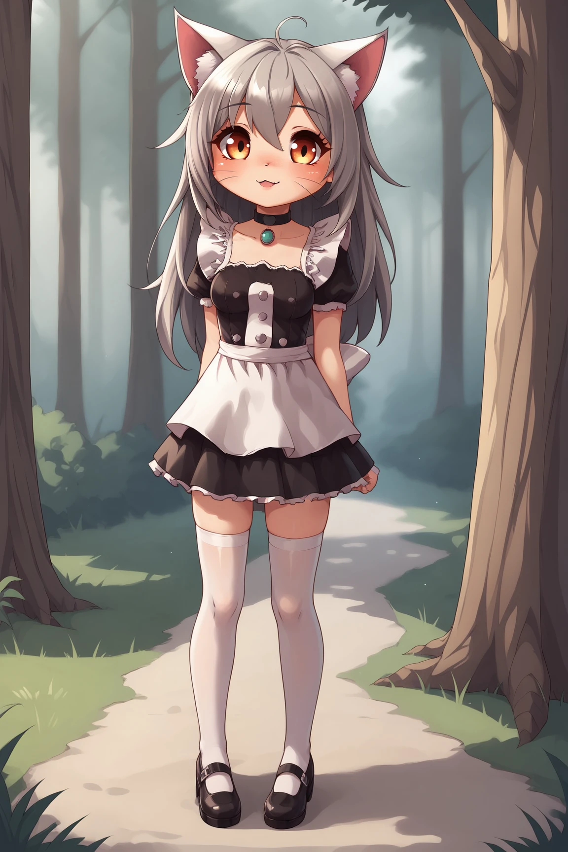 SamVTPXL, whiskers, brown eyes, grey hair, long hair, hair between eyes, bangs, ahoge, animal ears, cat ears, animal ear fluff, black choker, medium breasts, maid, black dress, short sleeves, white apron, black skirt, white thighhighs, black shoes