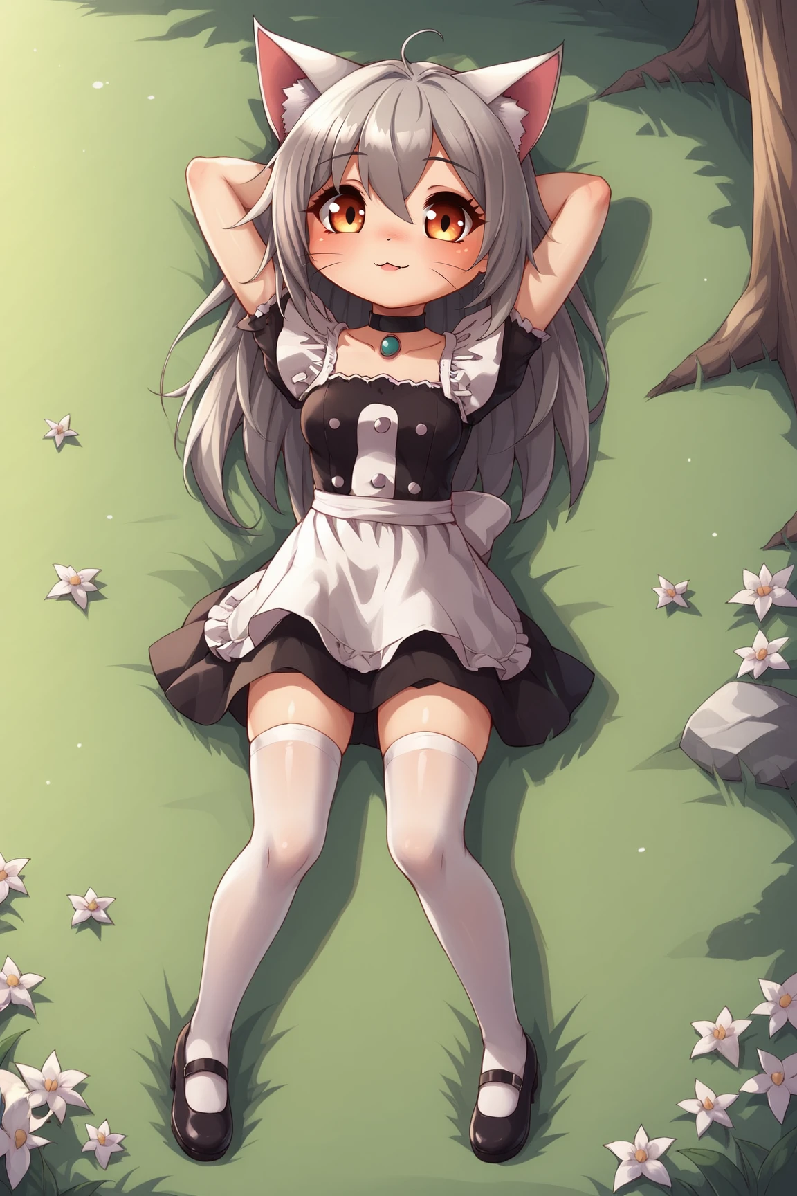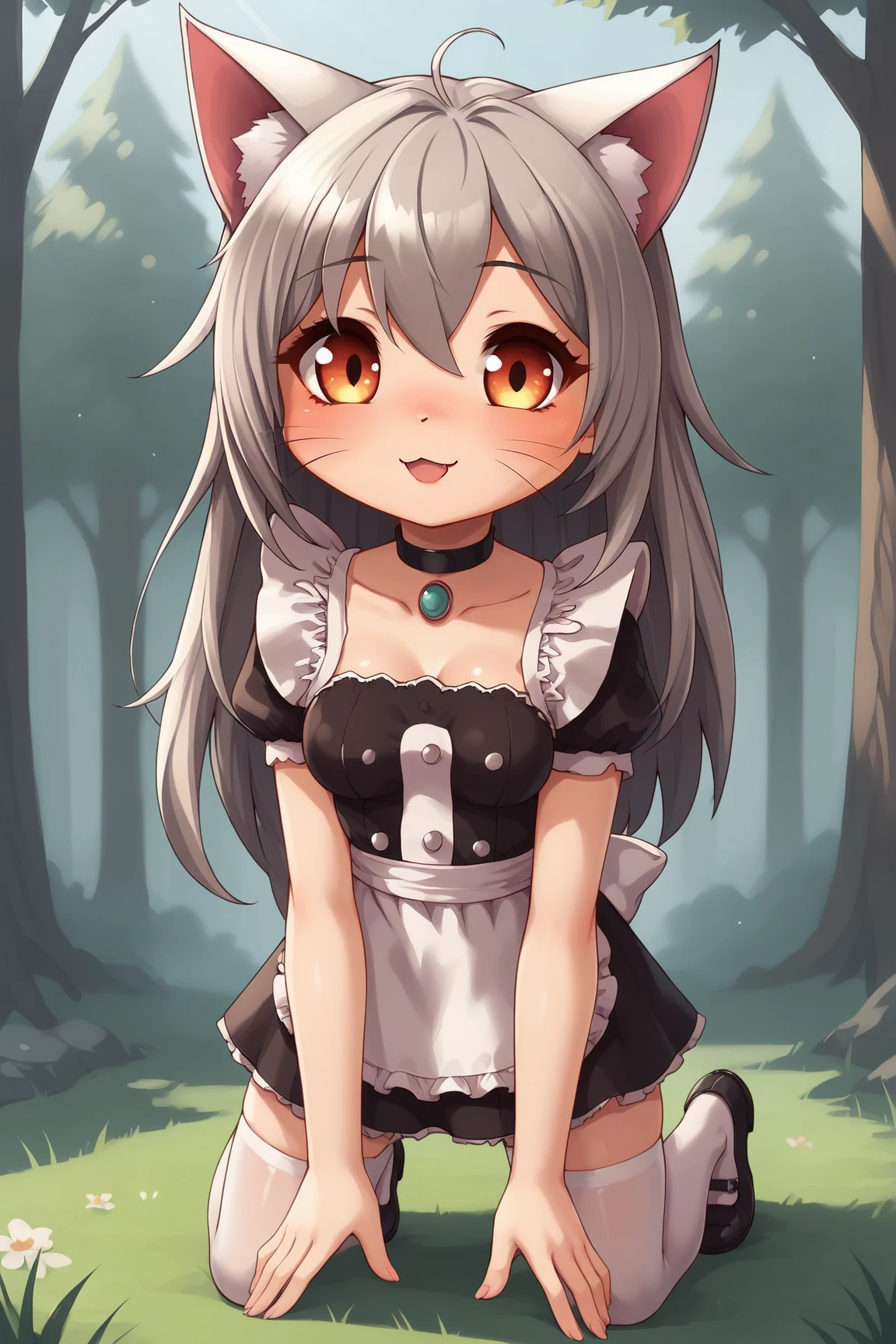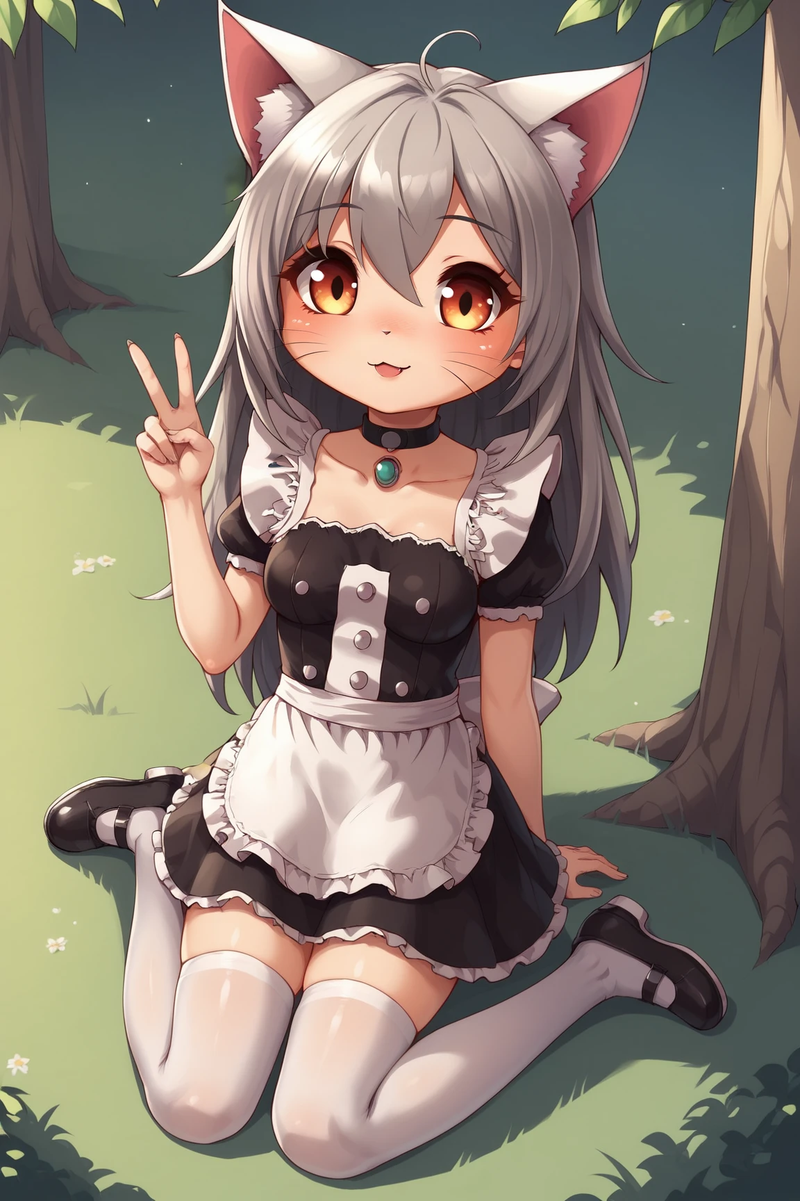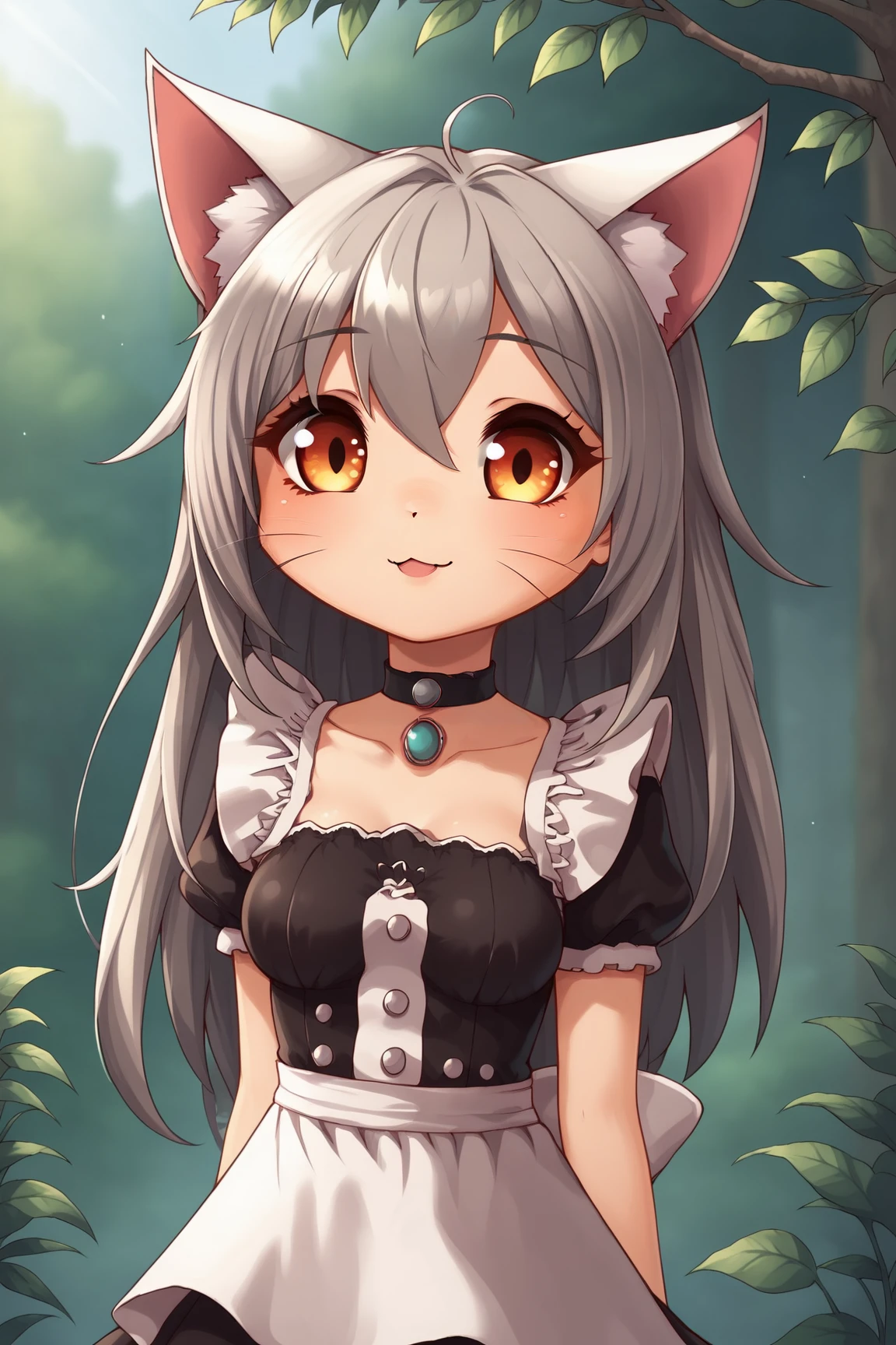 SamVTPXL, whiskers, brown eyes, grey hair, long hair, hair between eyes, bangs, ahoge, animal ears, cat ears, animal ear fluff, black choker, medium breasts, maid, black dress, short sleeves, white apron, black skirt, white thighhighs, black shoes