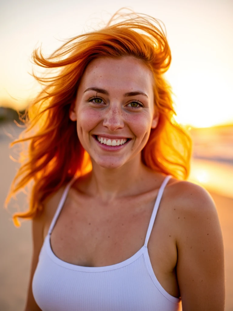 • (happy), a close up of a beautiful young woman smile in a room. She have red hair and freckles and is underwater