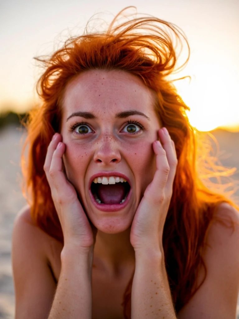 • (very surprised), a close up of a beautiful young woman in a room with surprised expression. She have red hair and freckles and is underwater. open mouth