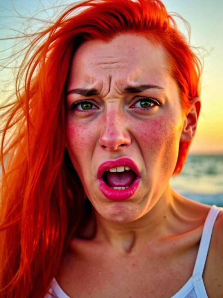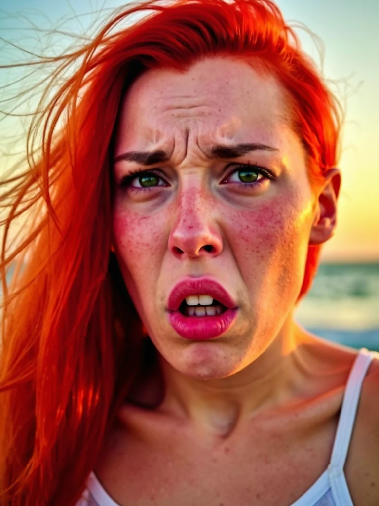 • (very disgusted), a close up of a beautiful young woman in a room with disgusted expression. her mouth is distorted by the disgust she feels, and her expression is grotesque. She have red hair and freckles and is underwater. open eyes