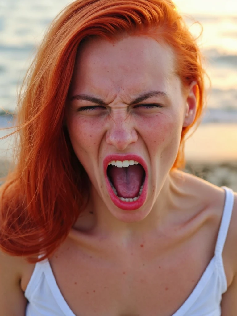 • (very angry), a close up of a beautiful young woman in a room with a angry expression, Her mouth is open and show her teeth. She have red hair and freckles and is underwater
