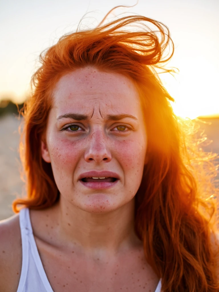 • (very sad), a close up of a beautiful young woman in a room with a sad expression, Her mouth is open and twisted of sad. Her eyes were bloodshot from crying is closed and tearfull. She have red hair and freckles and is underwater,scream