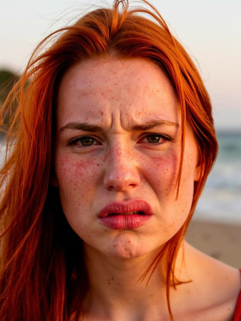 • (angry), a close up of a beautiful young woman in a room with a angry expression. She have red hair and freckles and is underwater