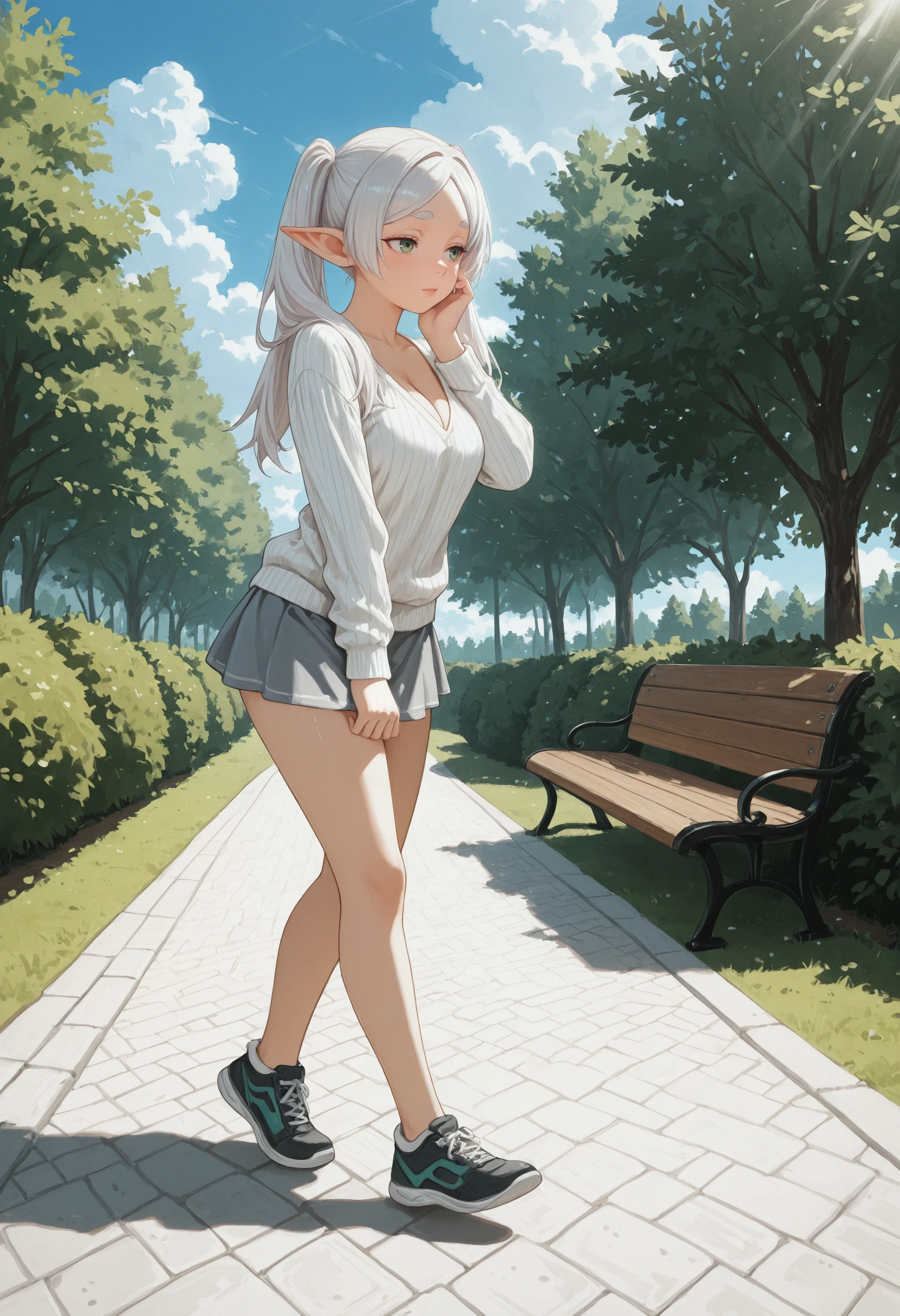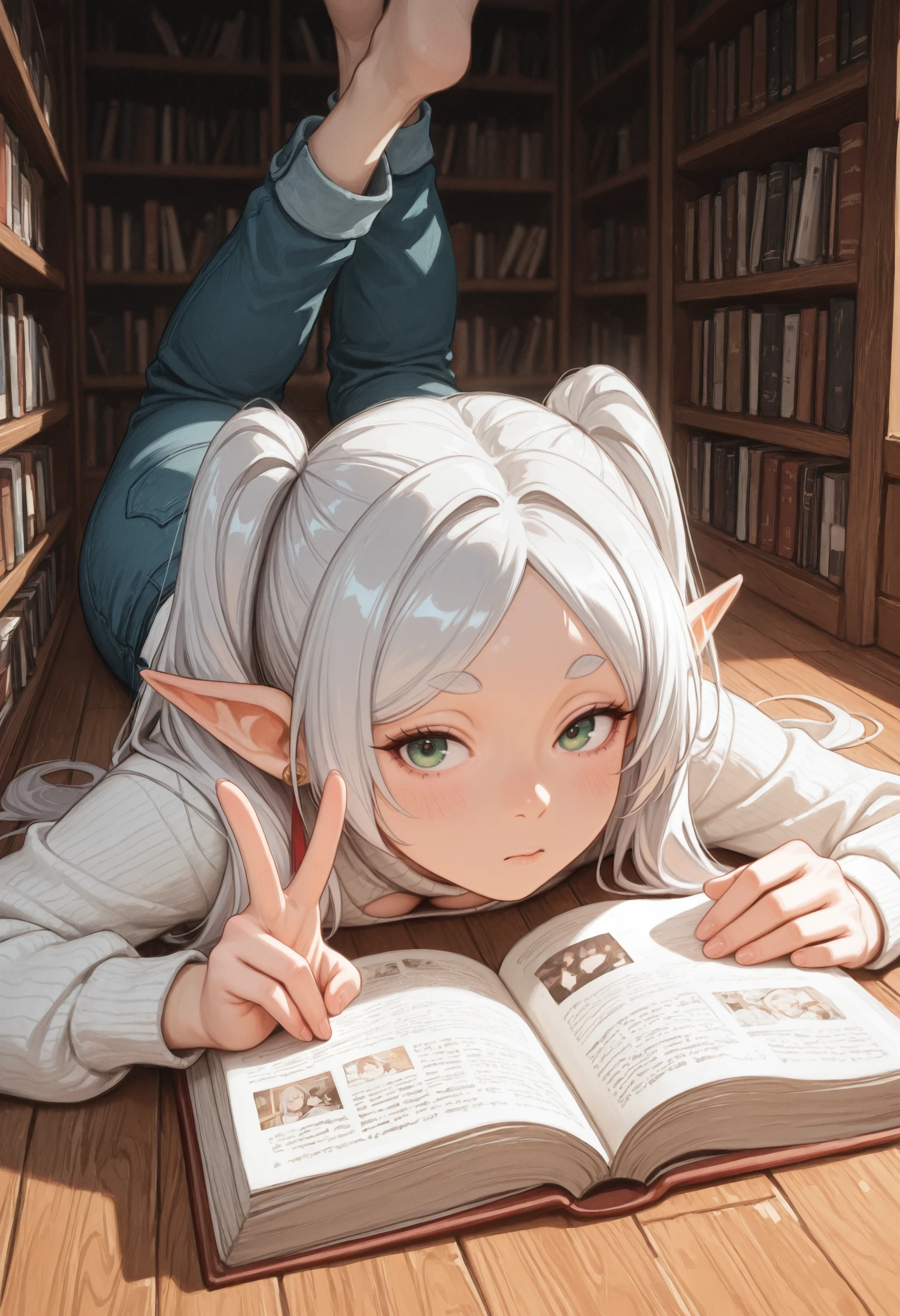(Positive Prompts) lynfrie, green eyes, pointy ears, long hair, white hair, parted bangs, hair intakes, short eyebrows, twintails,