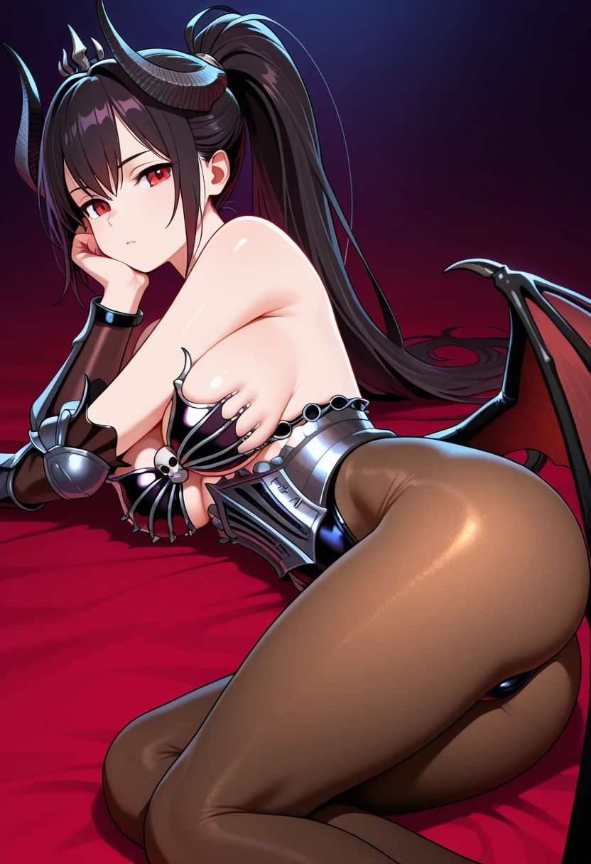 succubus_queen, 1girl, solo, red eyes, long hair, black hair, ponytail, demon girl, demon horns, , shoulders, armor, pantyhose, low wings