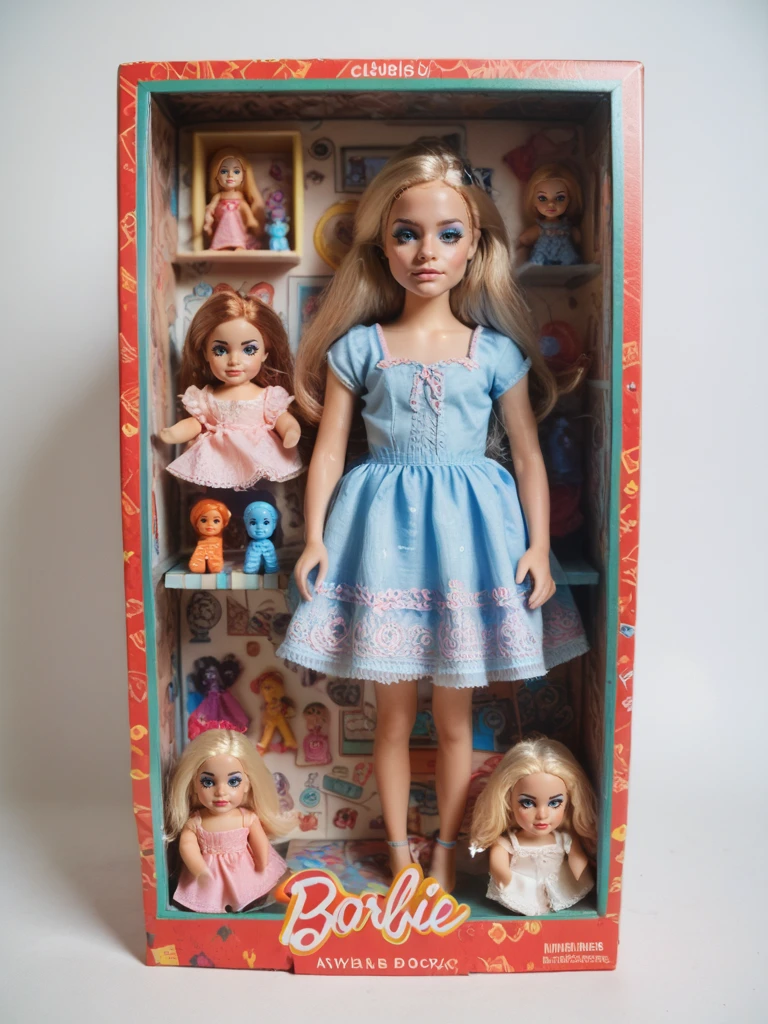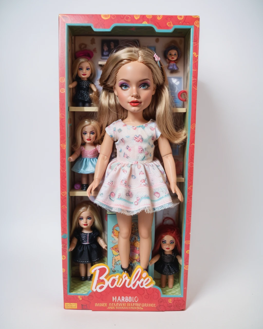 ,score_9, score_8_up, score_7_up, score_6_up, score_5_up, score_4_up, score_9, <lora:inDollBoxQuiron:0.77> makeup, doll box, tuffed toy, toy, doll, indollboxquiron, boxpremiumpackquiron, long hair, looking at viewer, standing, realistic, 1girl, fashion, lipstick, female, 1girl, solo, from above, full body, concert, light, carried breast rest, starry print hair, short hair, low twintails, pink eyes, pale skin, tube top, layered skirt, (hair flower),