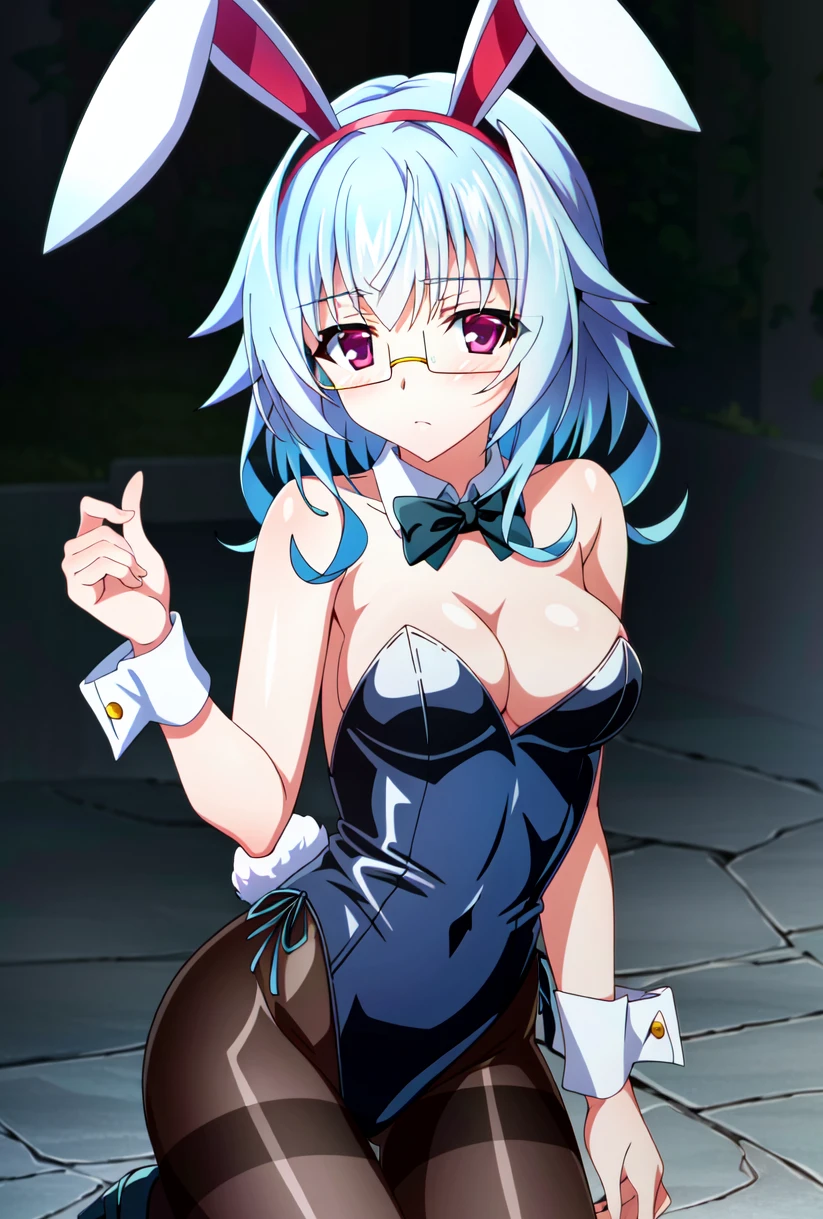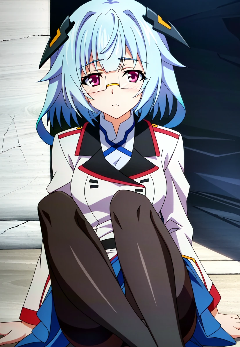 Kanzashi Sarashiki, 1girl, solo, glasses, blue hair, open mouth, school uniform, short hair, purple eyes, blush, smile, looking at viewer, uniform