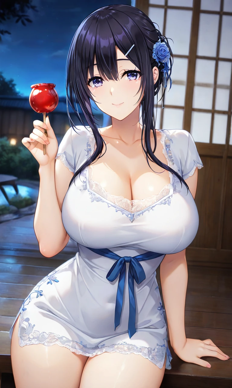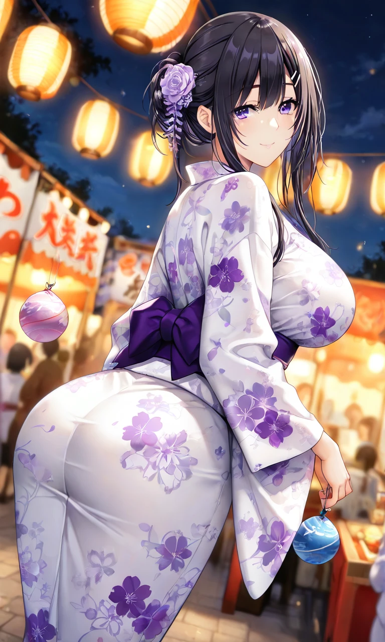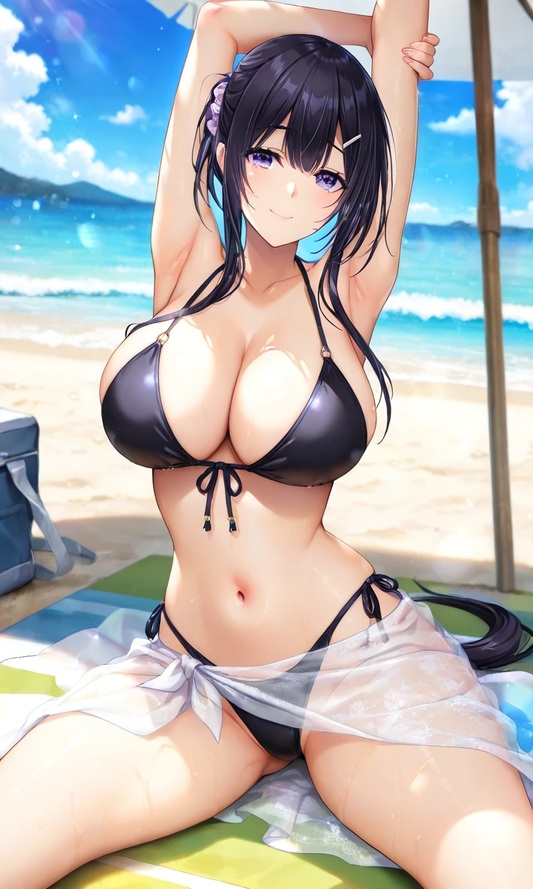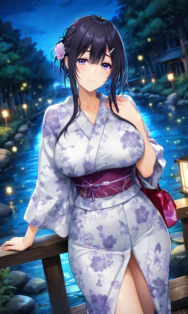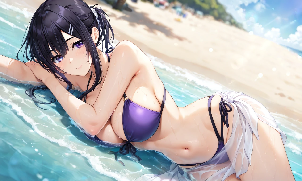 wakami suiren, black hair, ponytail, short ponytail, purple eyes, hairclip, hair ornament,
