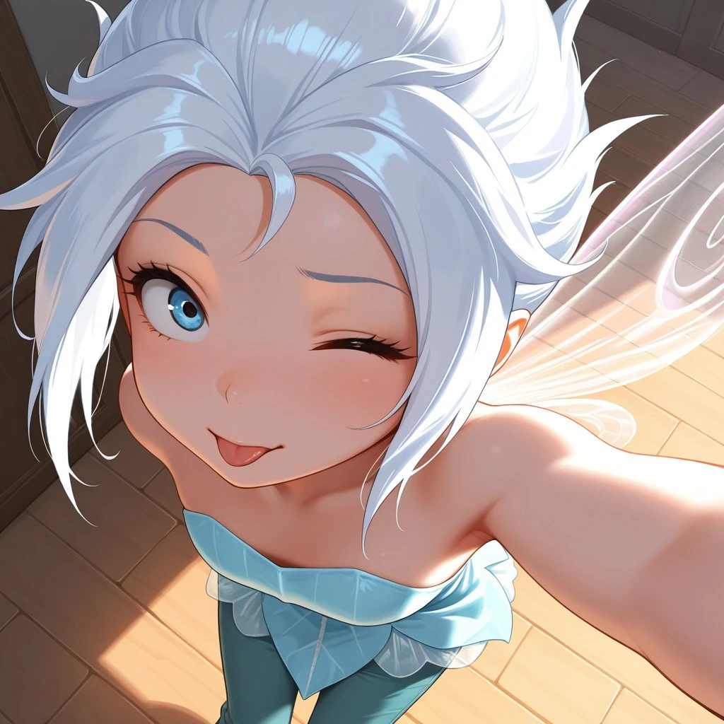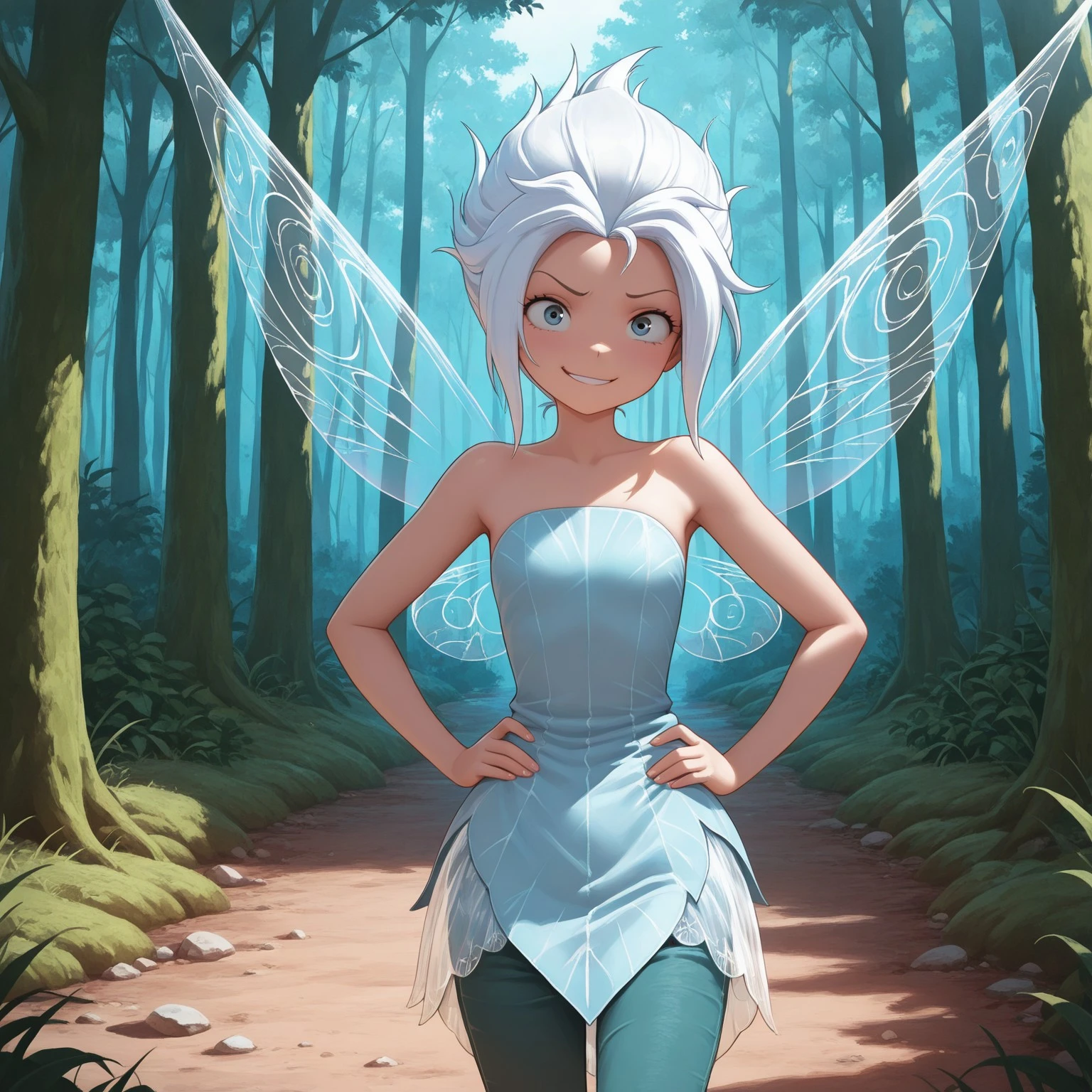 peri_tb, white hair, blue eyes, fairy wings, dress, bare shoulders, pants