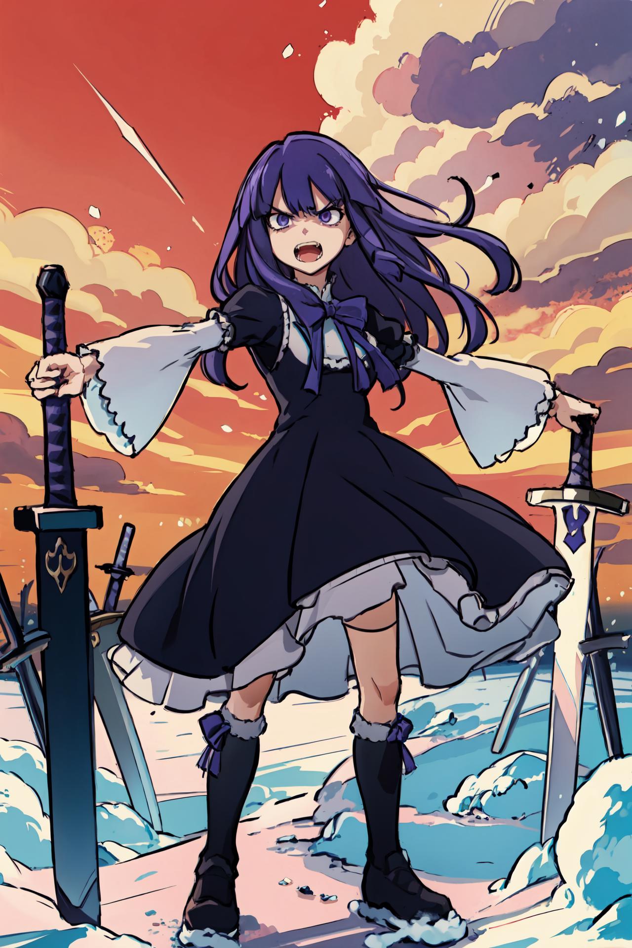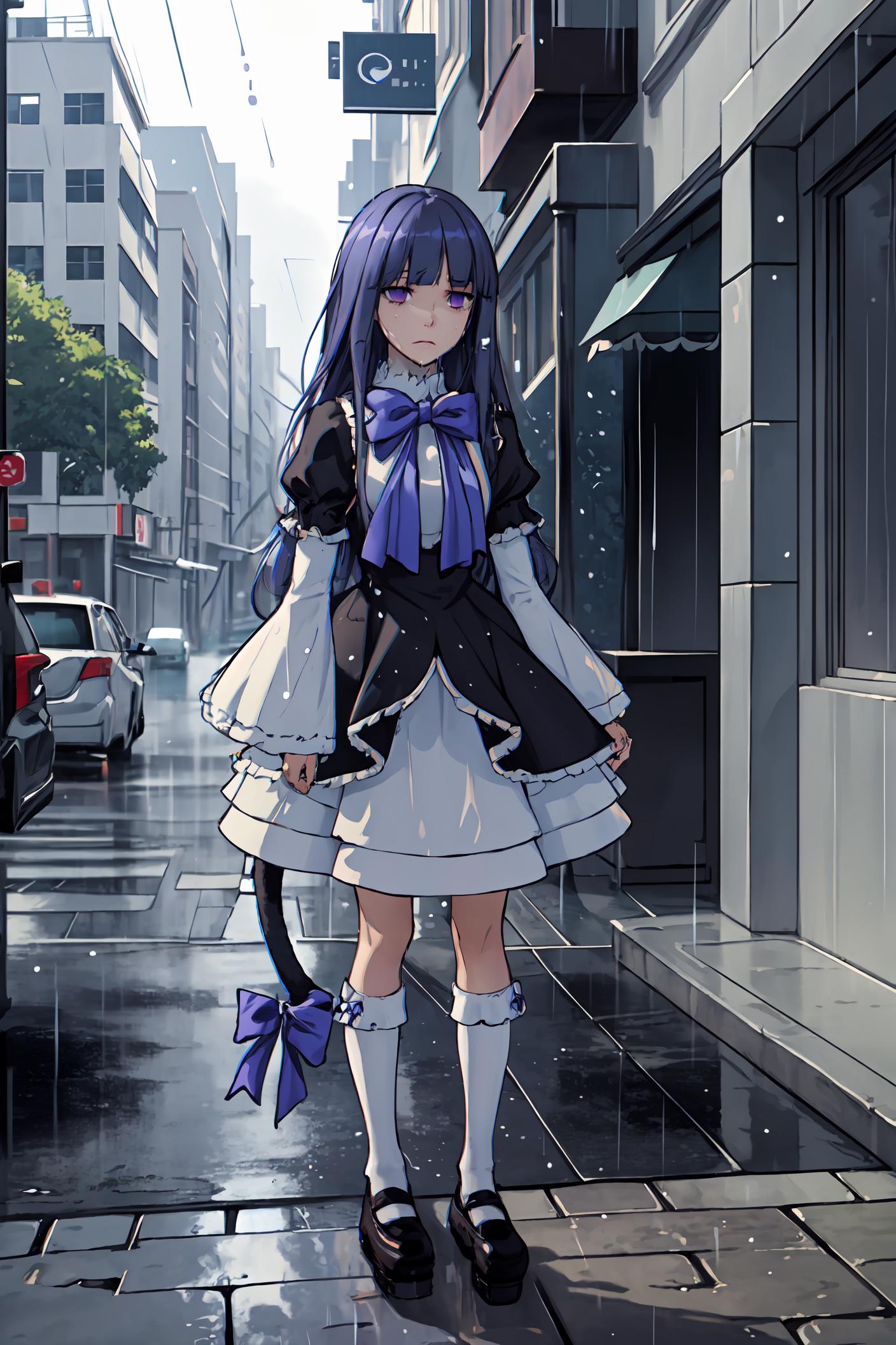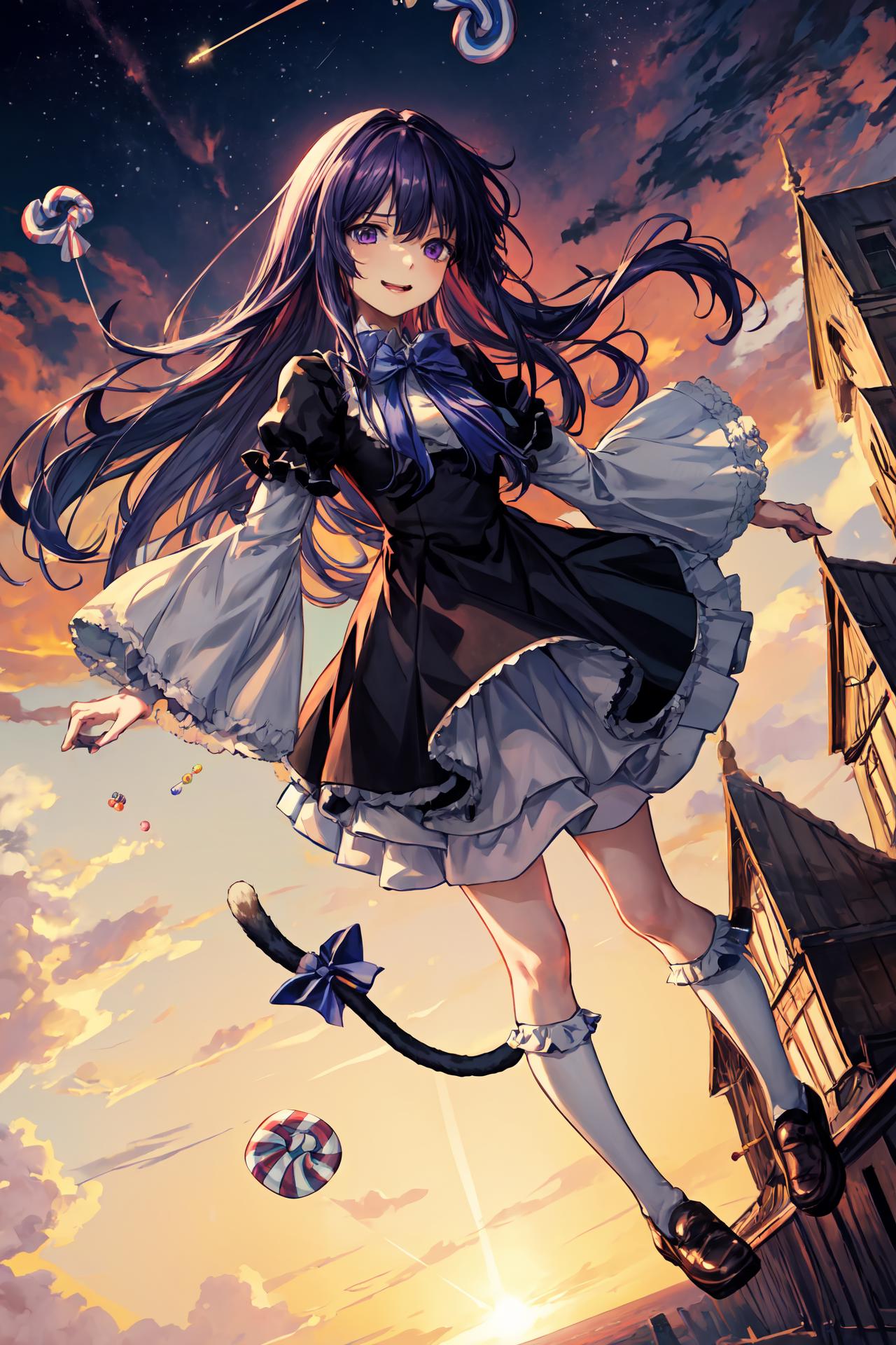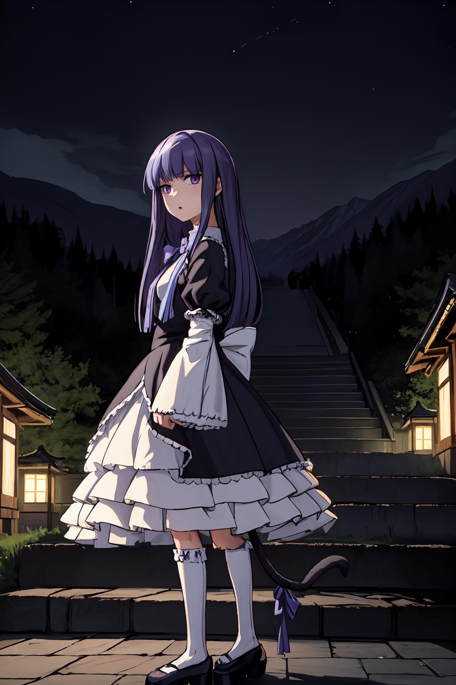 Prompt activator: frederica bernkastelMajor prompt words: purple hair, cat tail, tail bowMinor prompt words: purple eyes*, tail ornament* Witch outfit: dress, bowtie*, mary janes*, socks**If the main trigger word does not work properly
