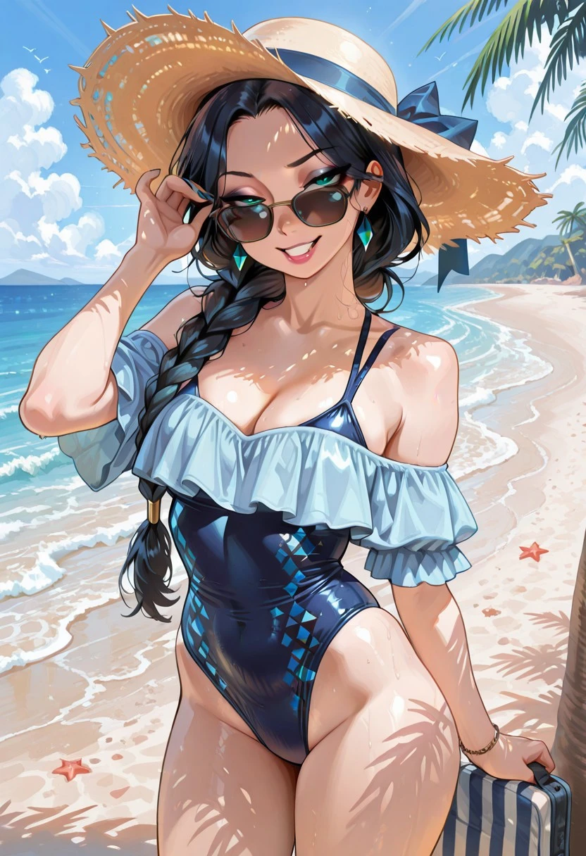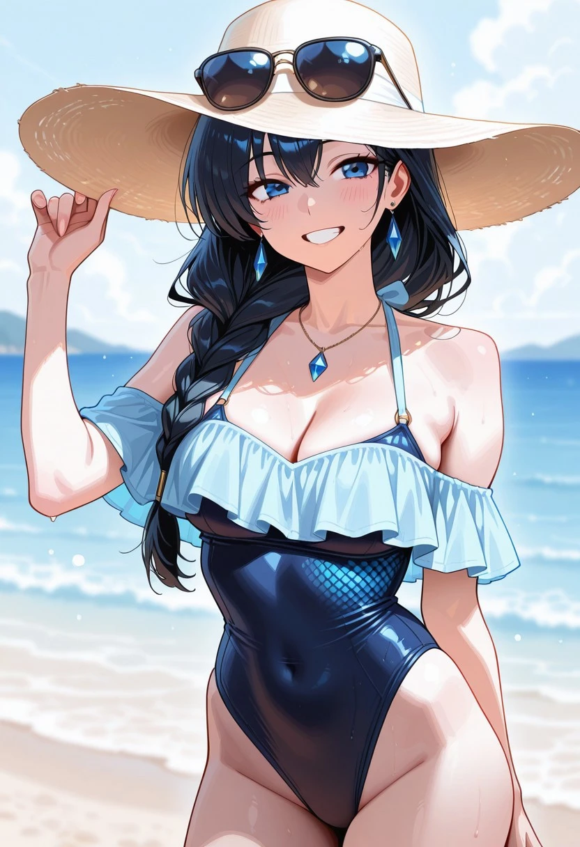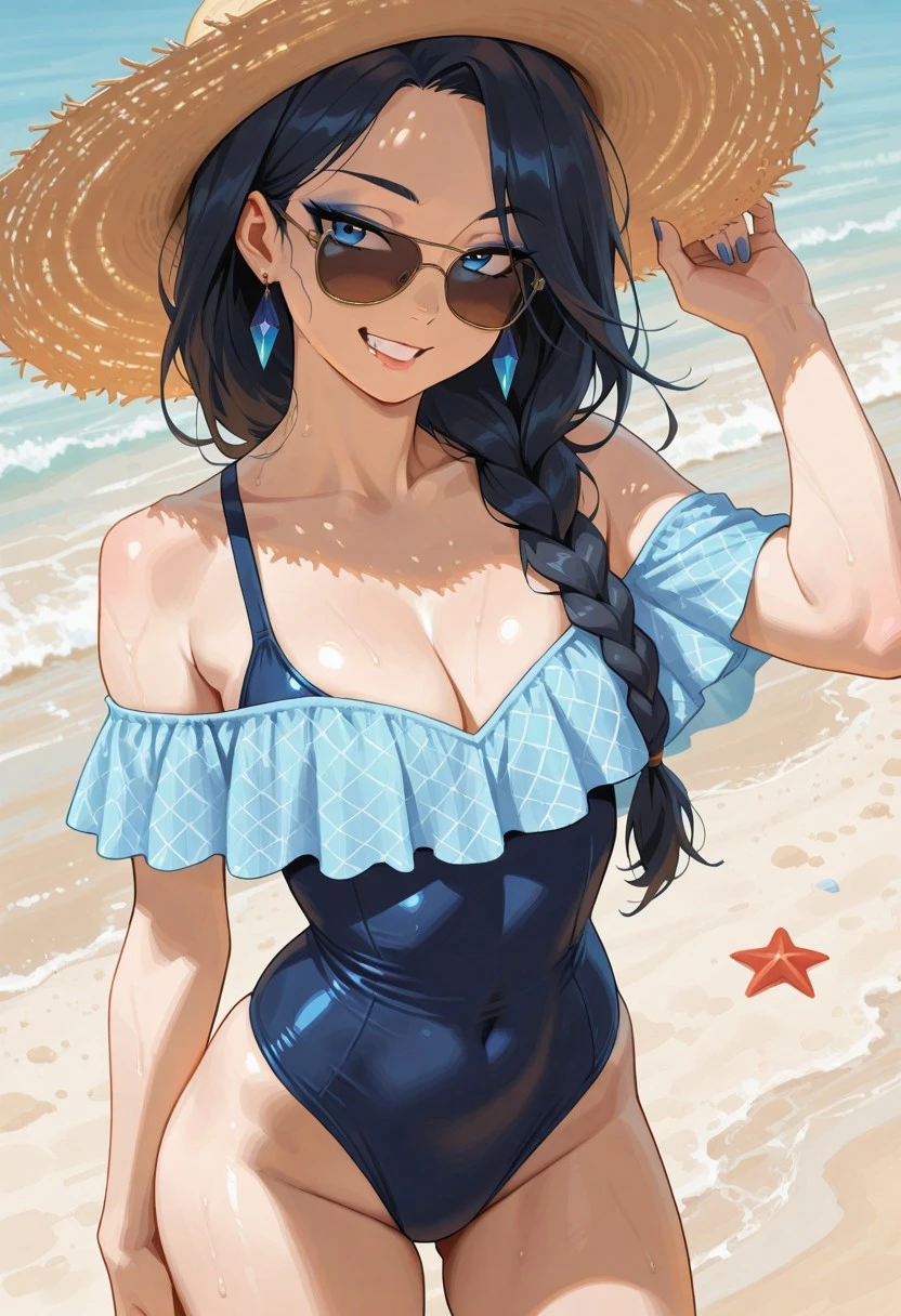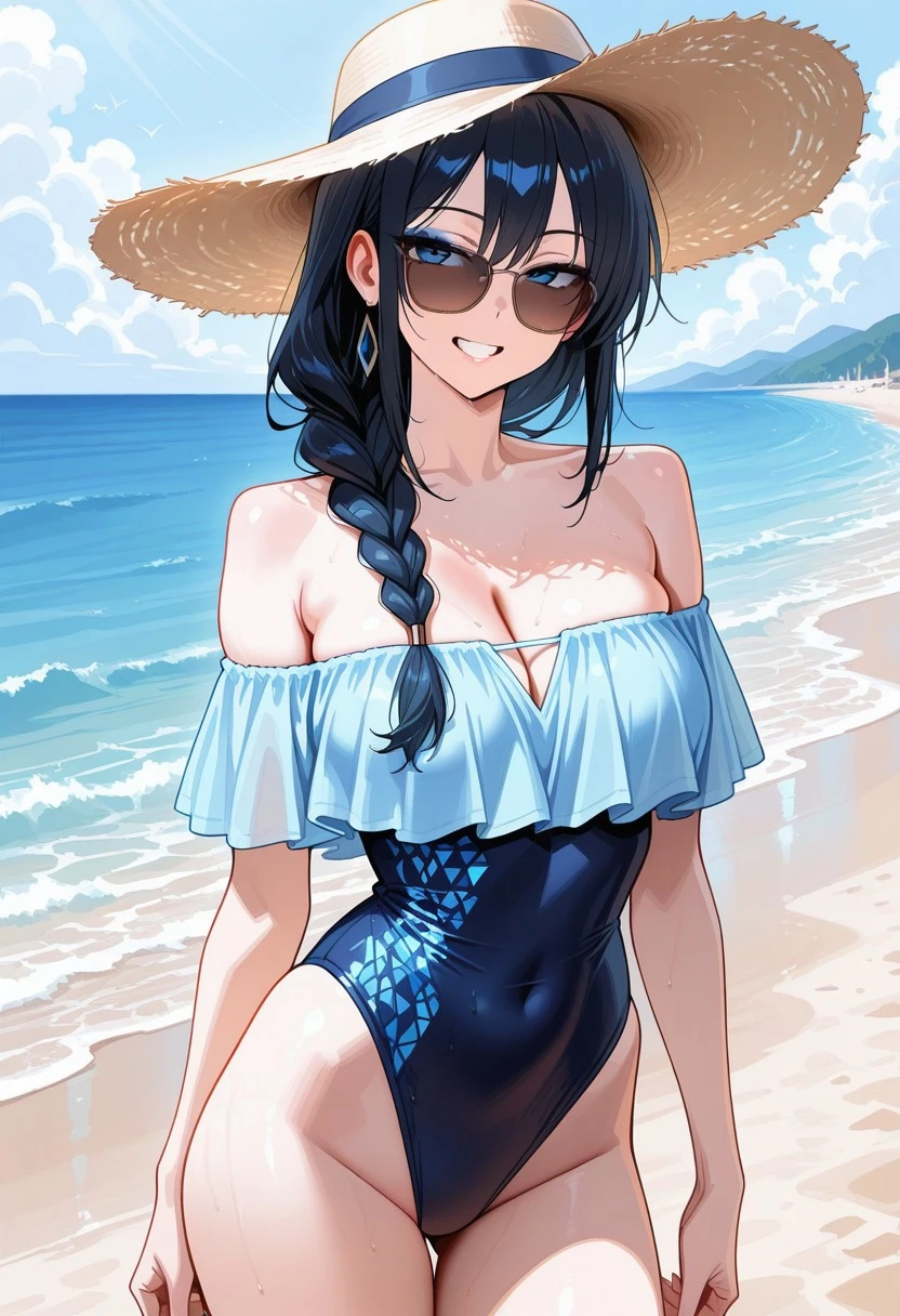dark blue diamond print outfit (sunhat, sunglasses, light blue off-shoulder neck swimsuit)