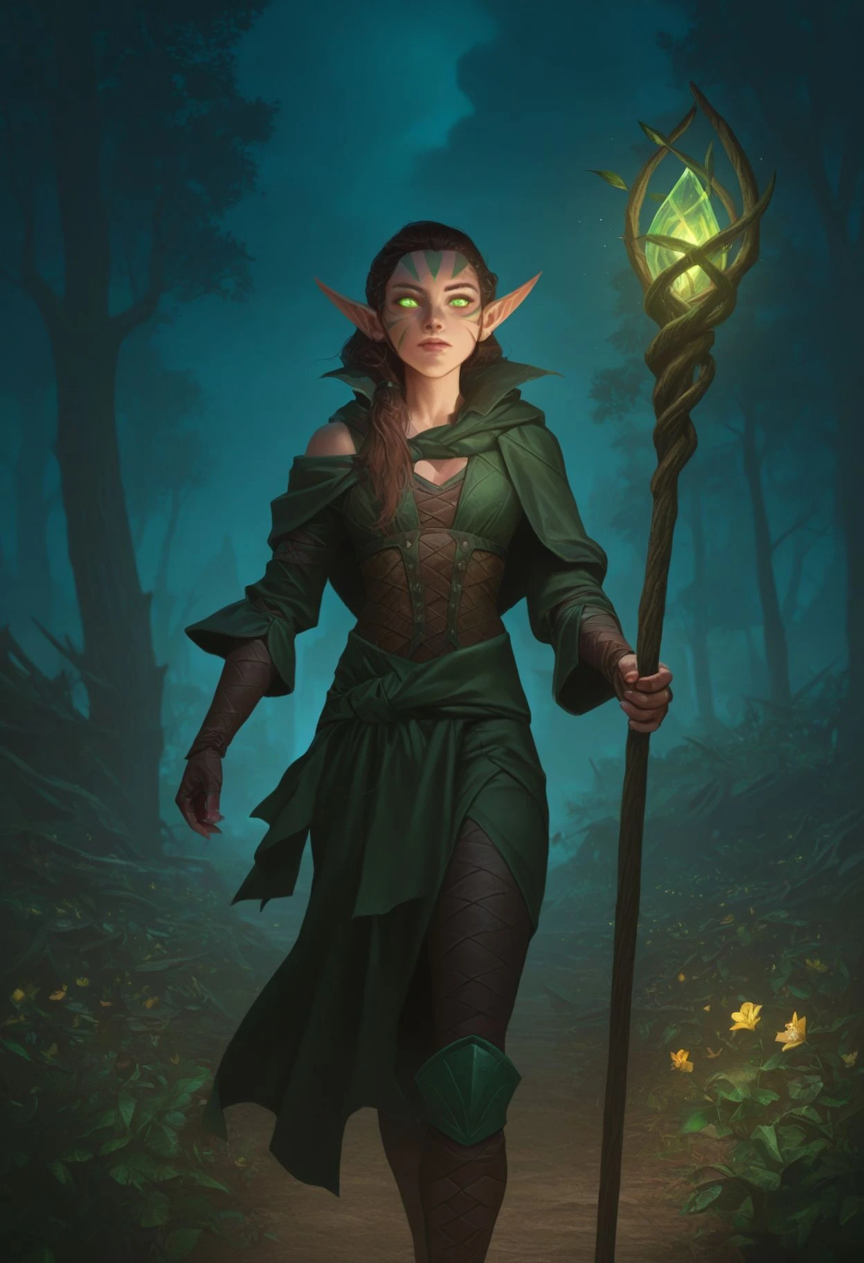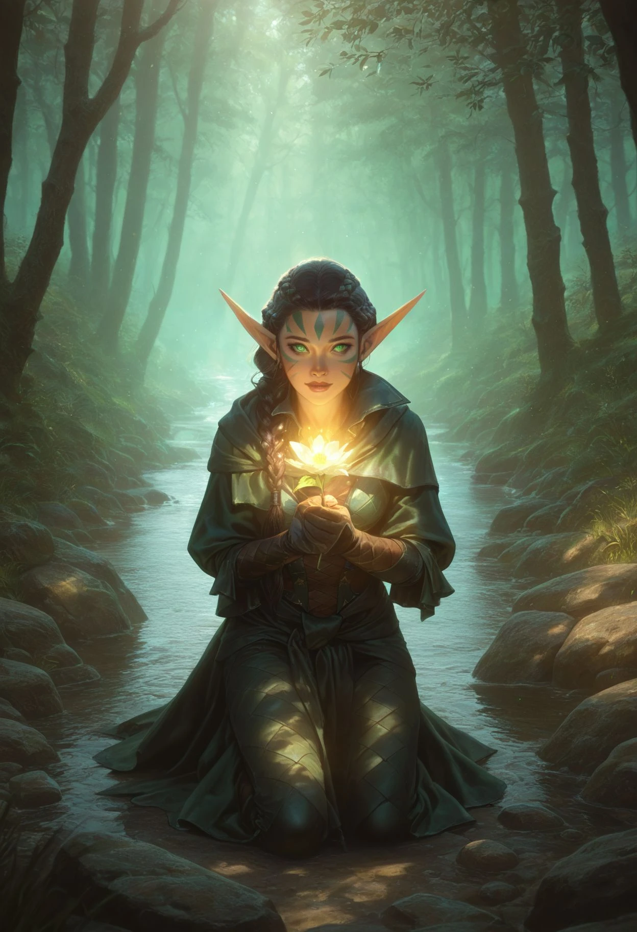 1girl, brown hair, braid, glowing eyes, green eyes, pointy ears, facial mark