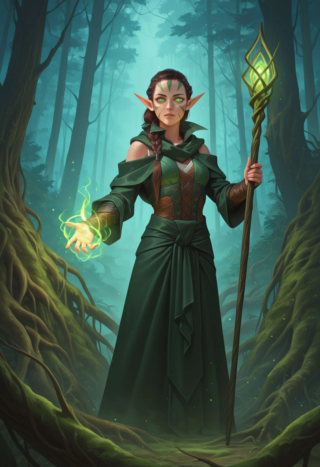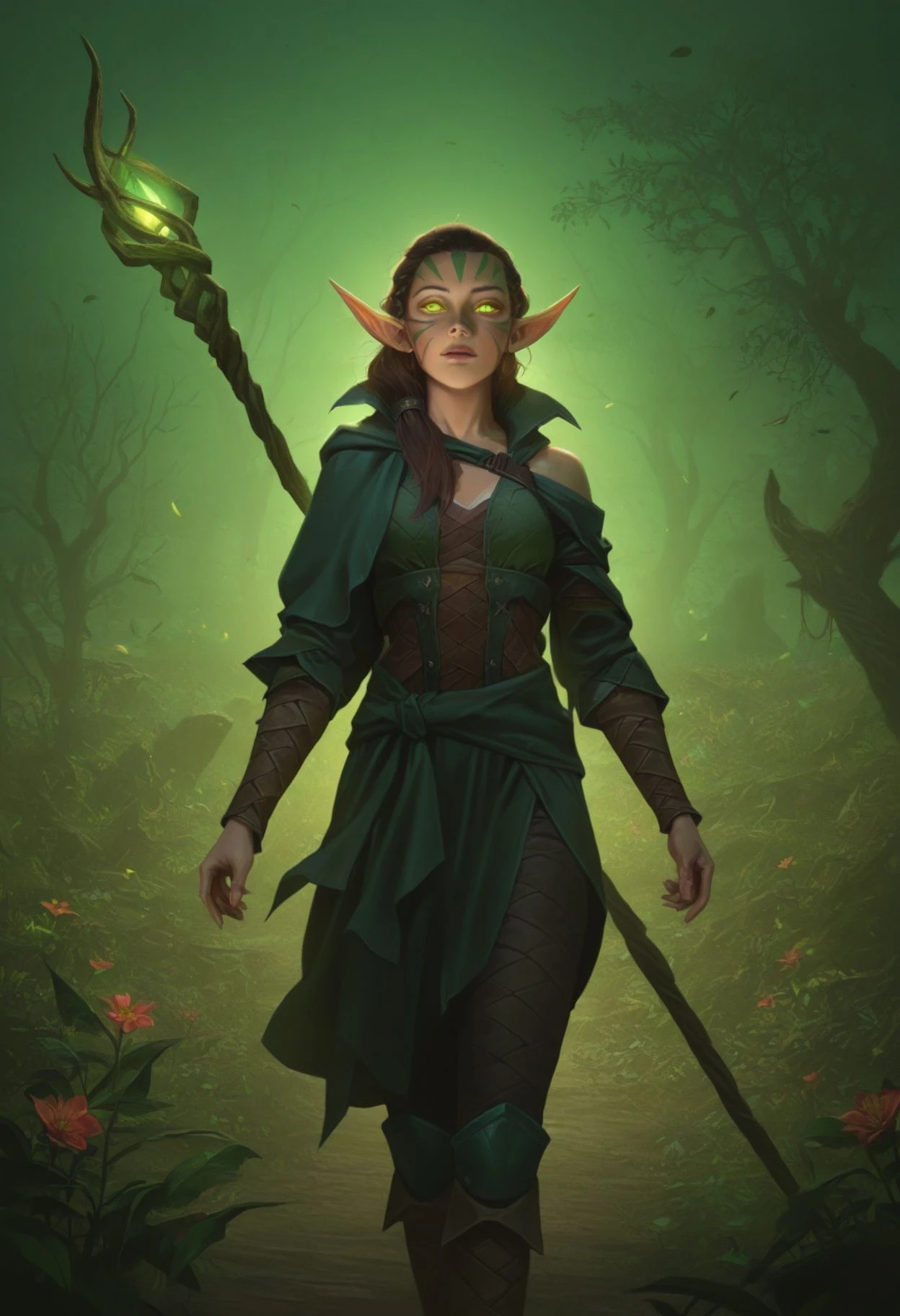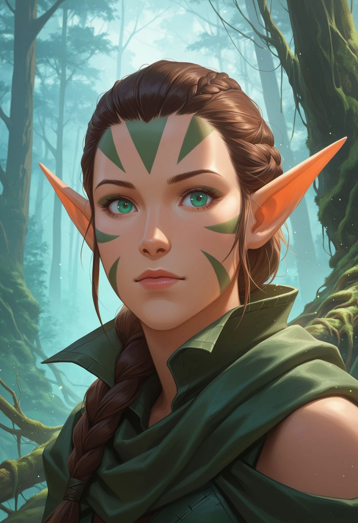 Regular: nissa, portrait, 1girl, brown hair, braid, glowing eyes, green eyes, pointy ears, facial mark