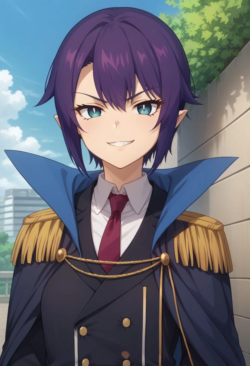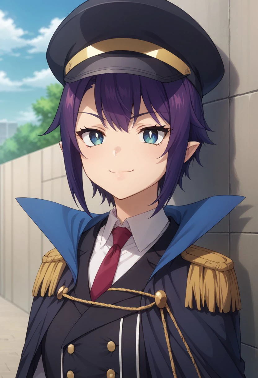 saurva, 1girl, blue eyes, hat, purple hair, necktie, thighhighs, pointy ears, shorts, epaulettes, gloves, cape, white gloves, boots, short hair, uniform, purple necktie, black shorts, grey thighhigh,