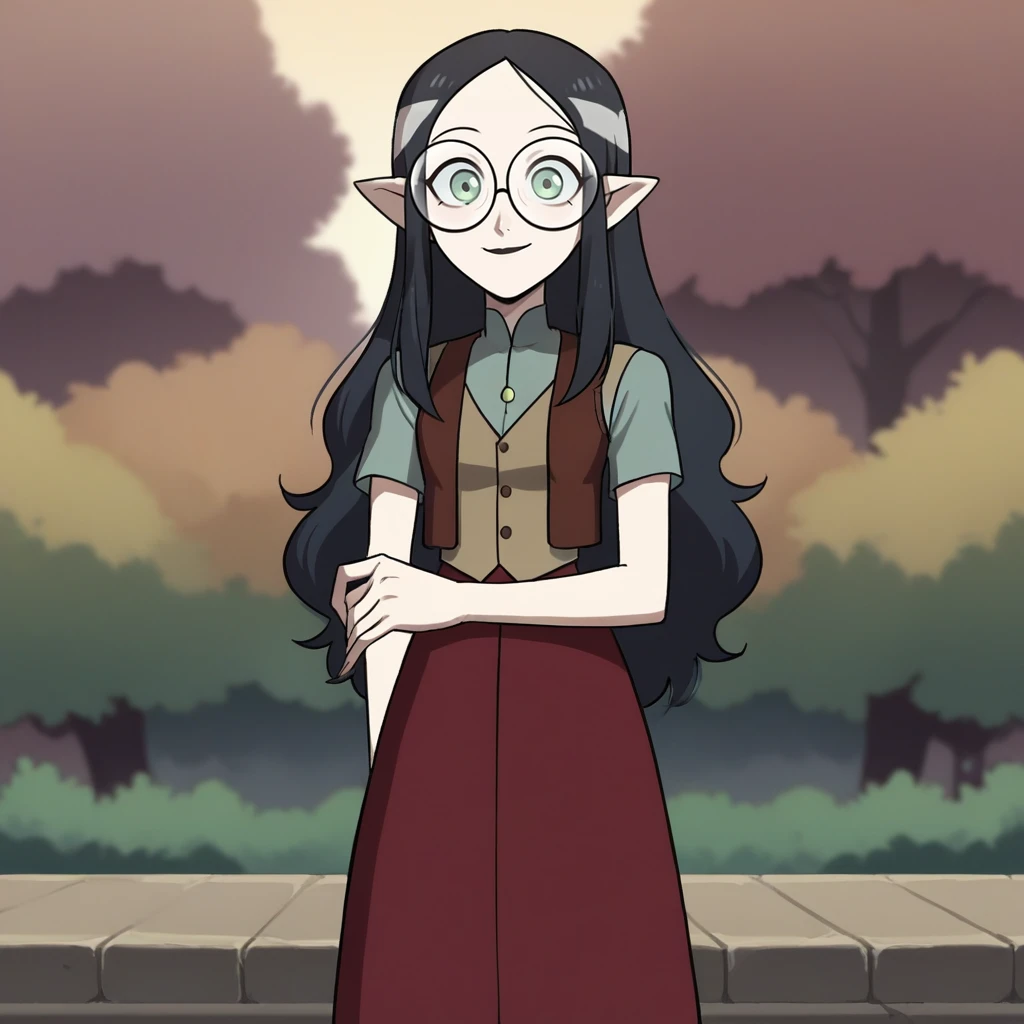 Season 2 Appearance: Long hair,black hair,heterochromia, green eyes, pointy ears,long skirt, vest, short sleeves, round eyewear, red skirt, glasses