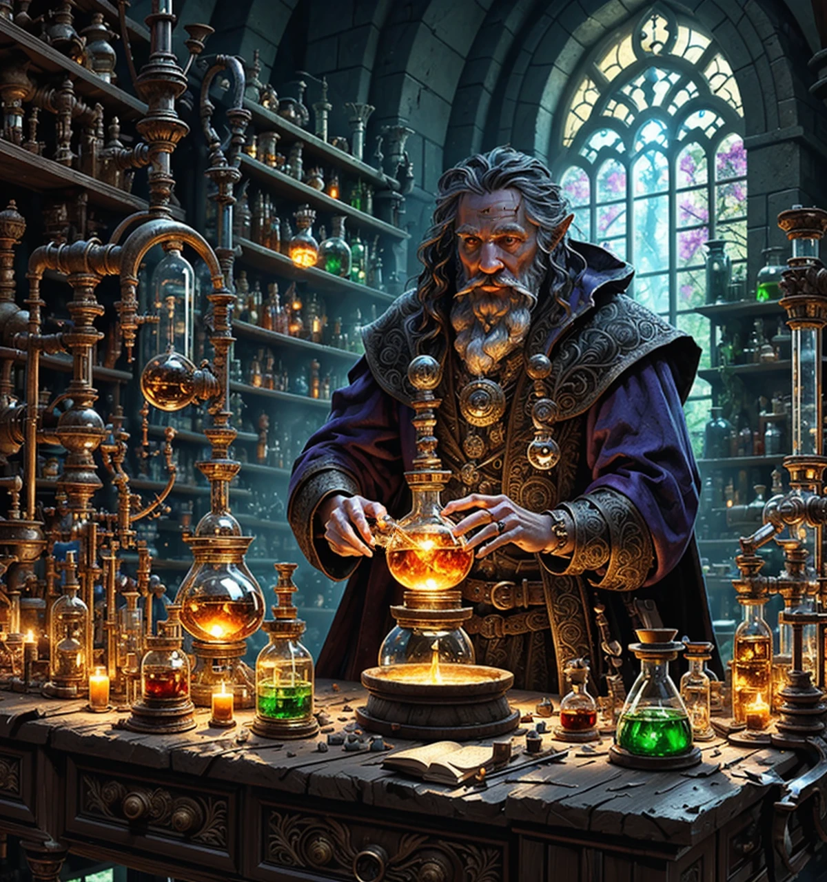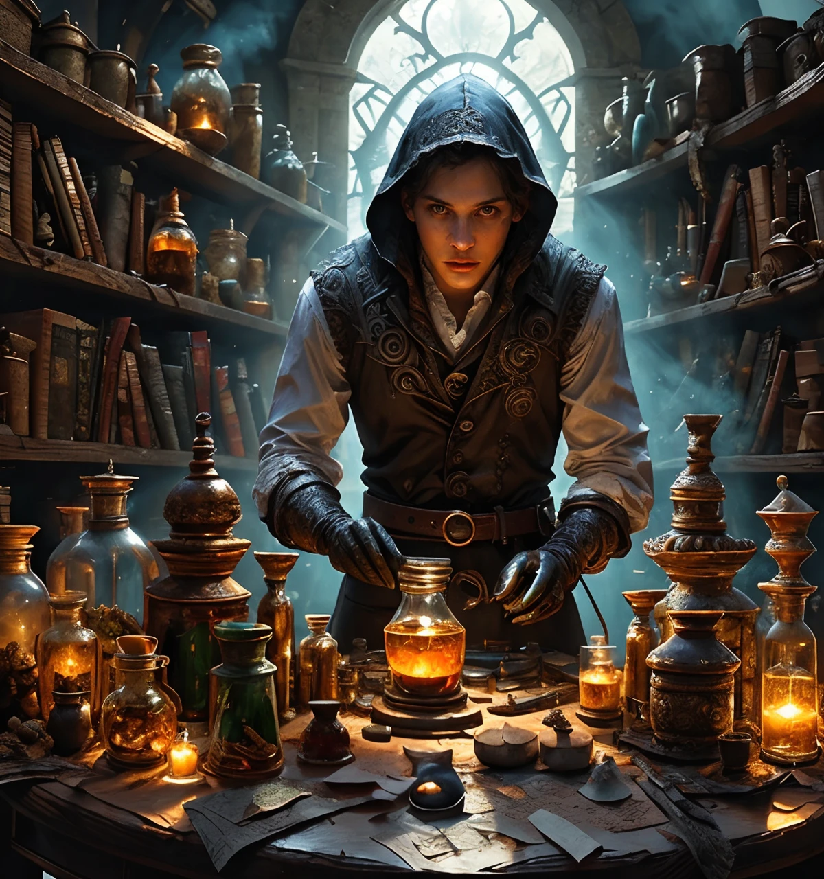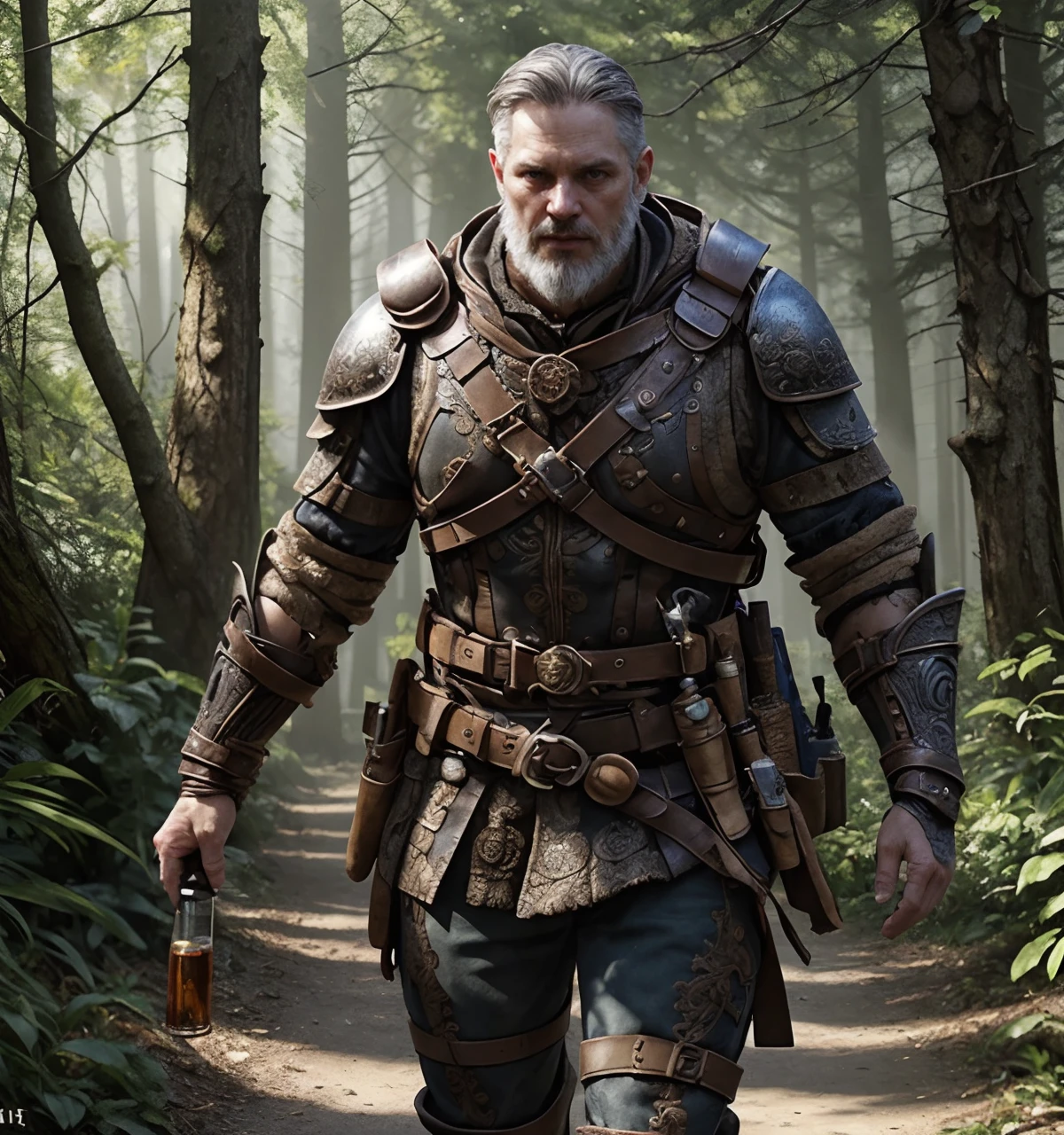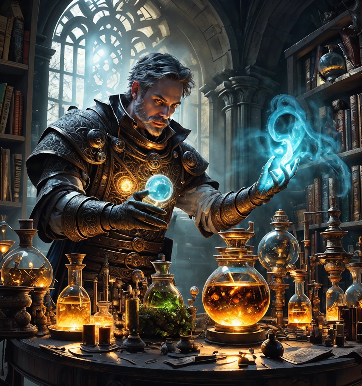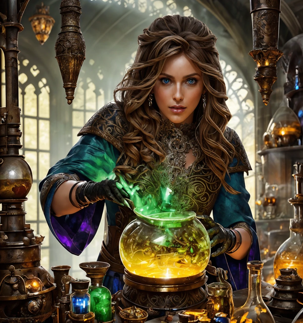 Reduce weight to 0.5 to avoid getting an alchemist table and lots of bottles / flasks in every picture, as the LoRA heavily goes into the direction of "alchemist mixing potion at alchemist table". But as you can see from the pictures, it is possible to get an alchemist walking through the forest, maybe holding a potion.