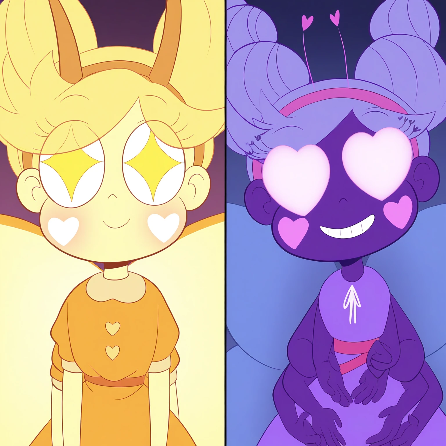 st4rr, st4rrevo, toon (style), star-shaped pupils, blonde hair, cone hair bun, colored skin, yellow skin, heart blush stickers, long horns hairband, extra arms, butterfly wings, heart belt, orange dress