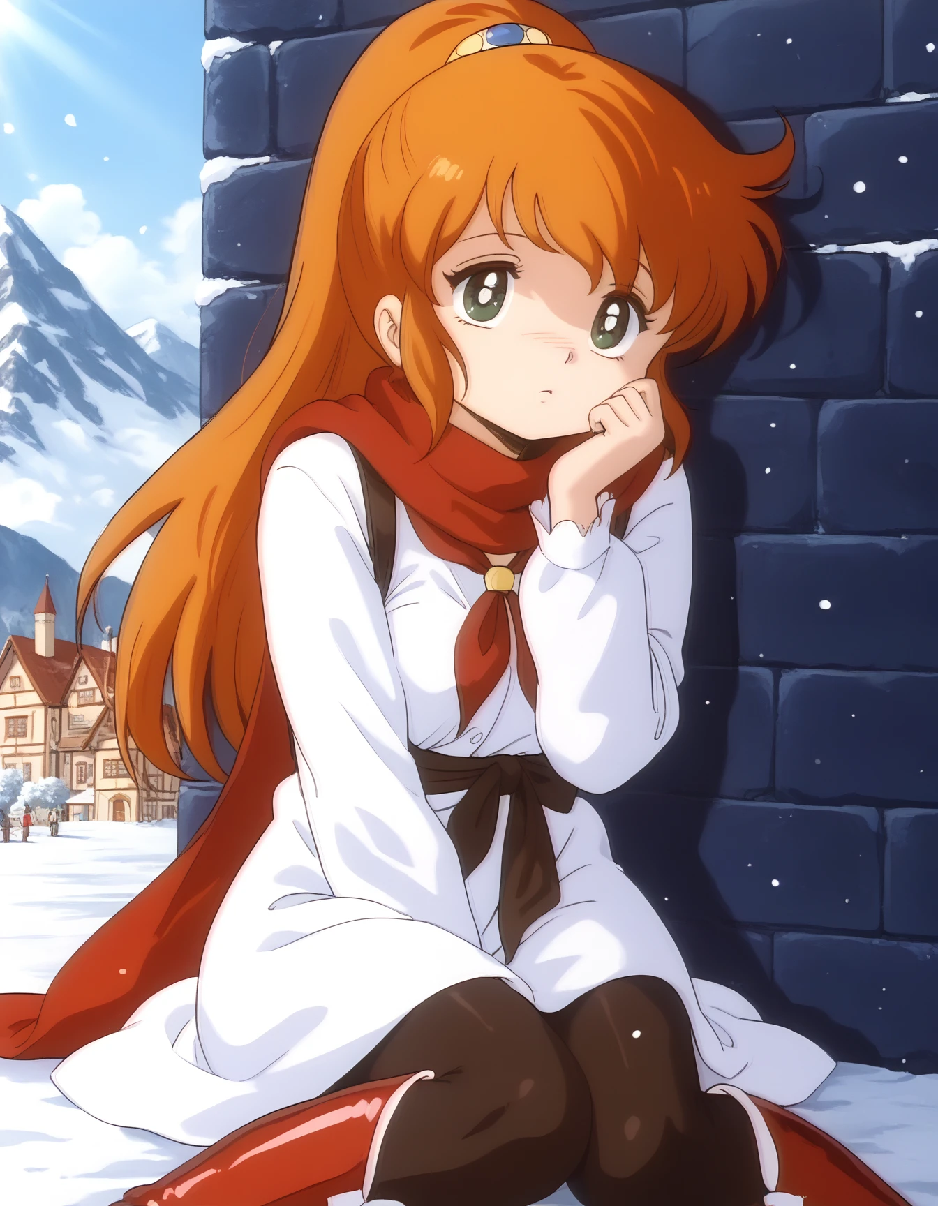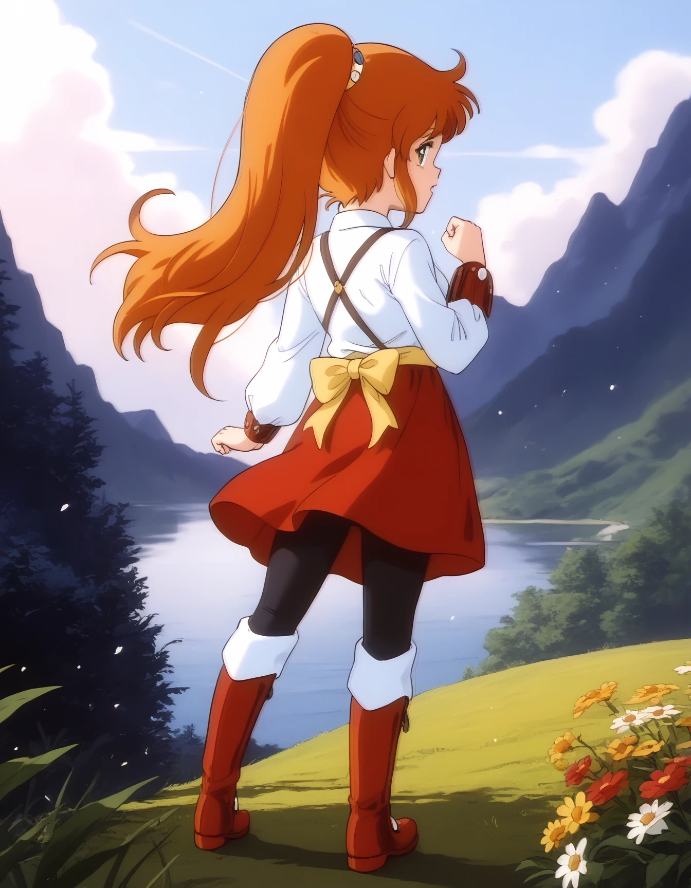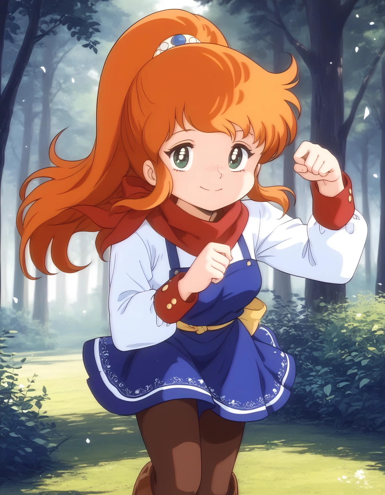 1girl, caron_rall1, green eyes, orange hair, high ponytail, long hair, sidelocks, hair ornament, midriff, navel, bikini armor, armor, red buruma, thighs, armlet, choker, gauntlet, leg armor, shoulder armor, one-shoulderDescription