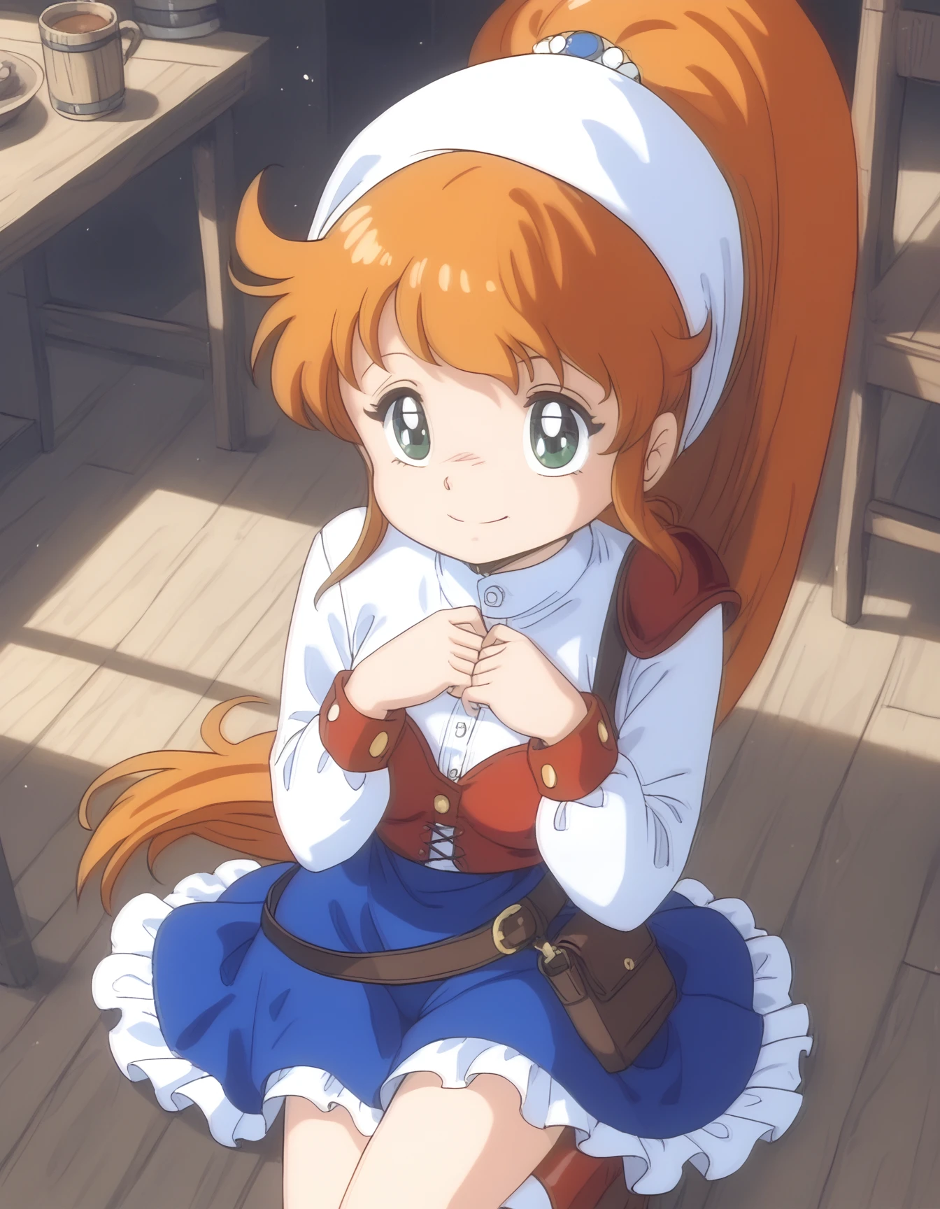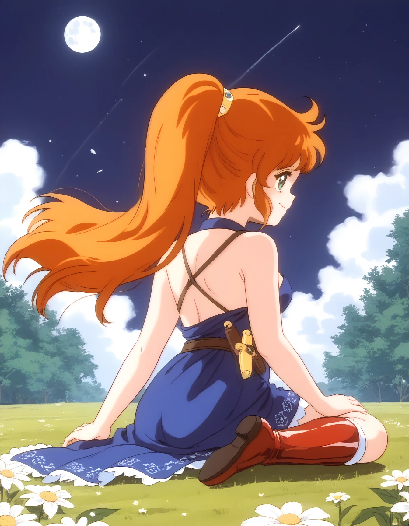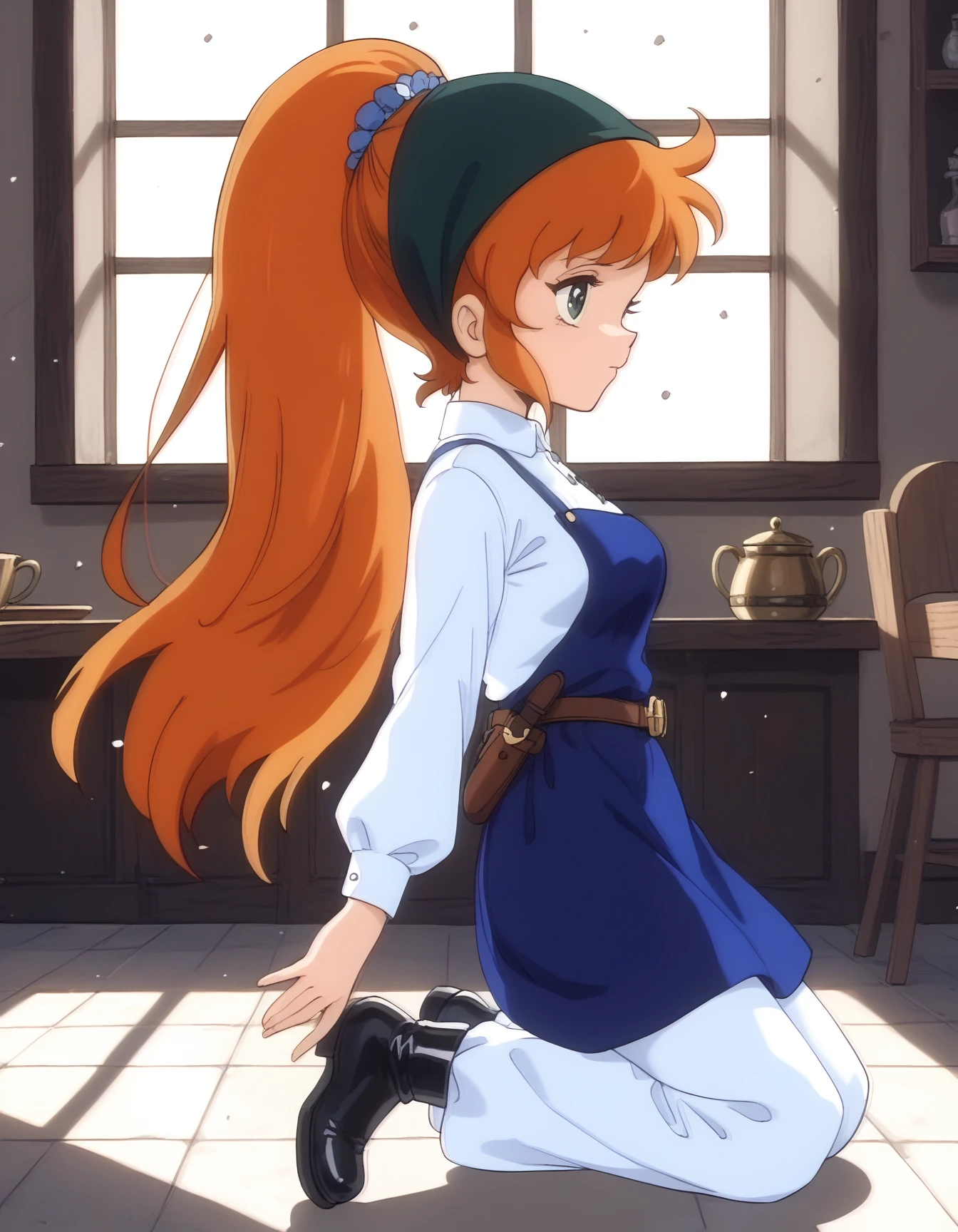 1girl, caron_rall1, green eyes, orange hair, high ponytail, long hair, sidelocks, hair ornament, midriff, navel, bikini armor, armor, red buruma, thighs, armlet, choker, gauntlet, leg armor, shoulder armor, one-shoulderDescription