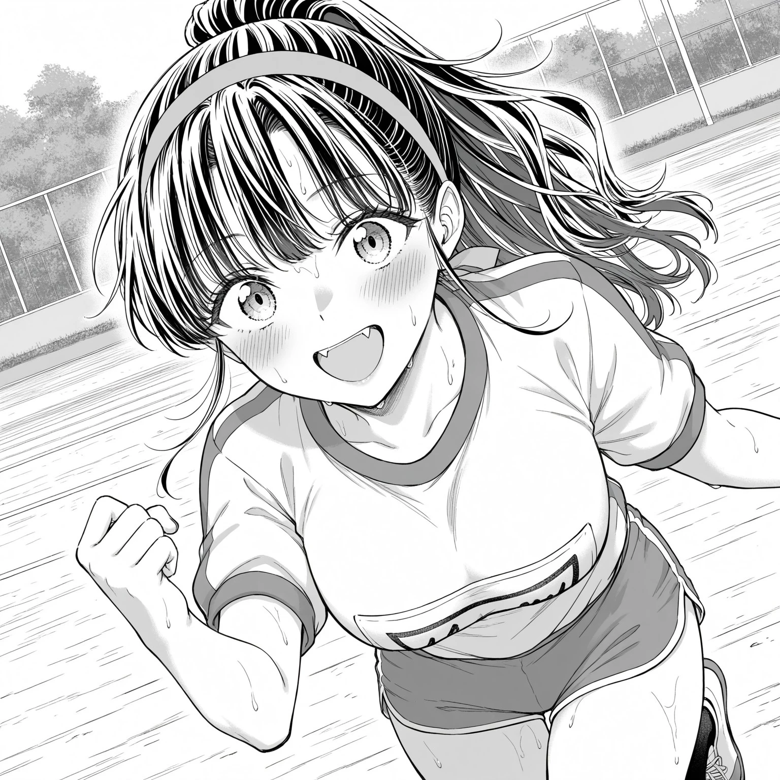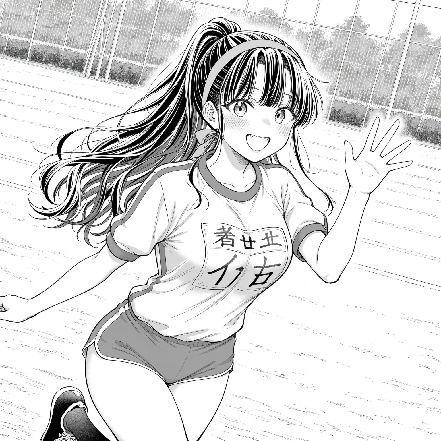 kurope, ponytail, gym uniform, shorts, hairband, socks, kneehighs, shoes, shirt, short sleeves