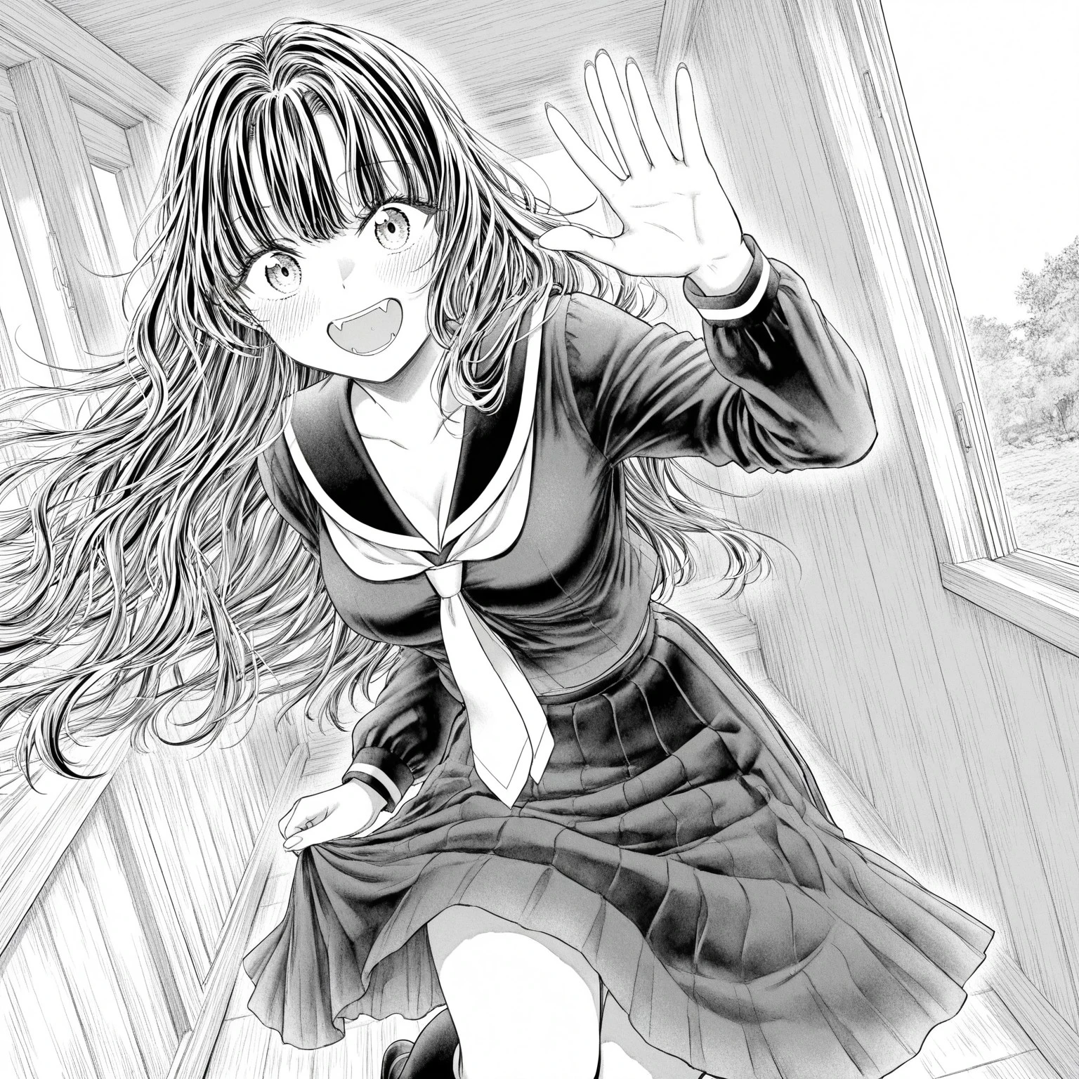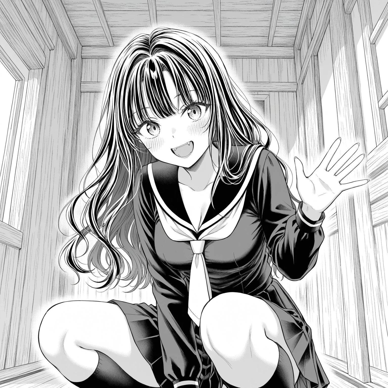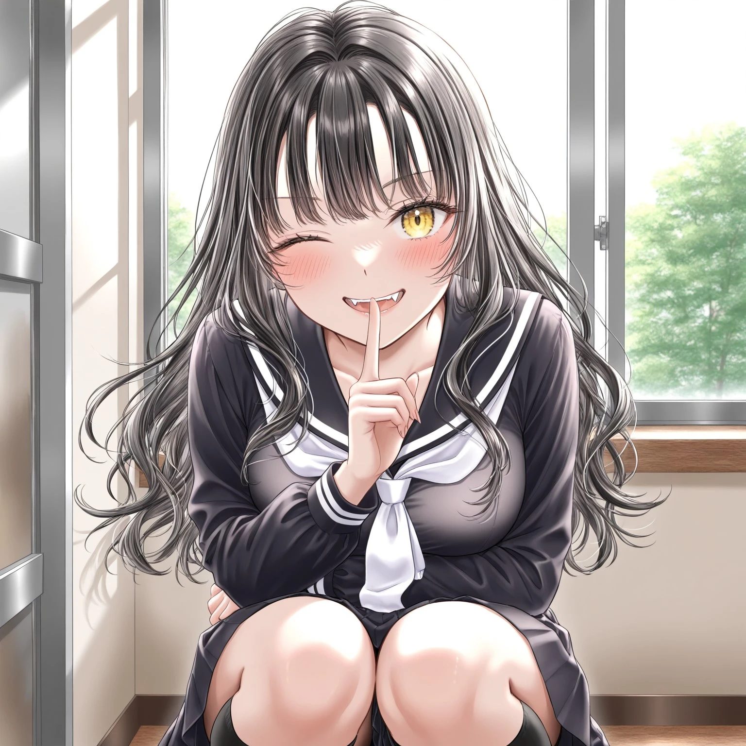 Base: kuro, 1girl, long hair, fangs, breasts, bangs,