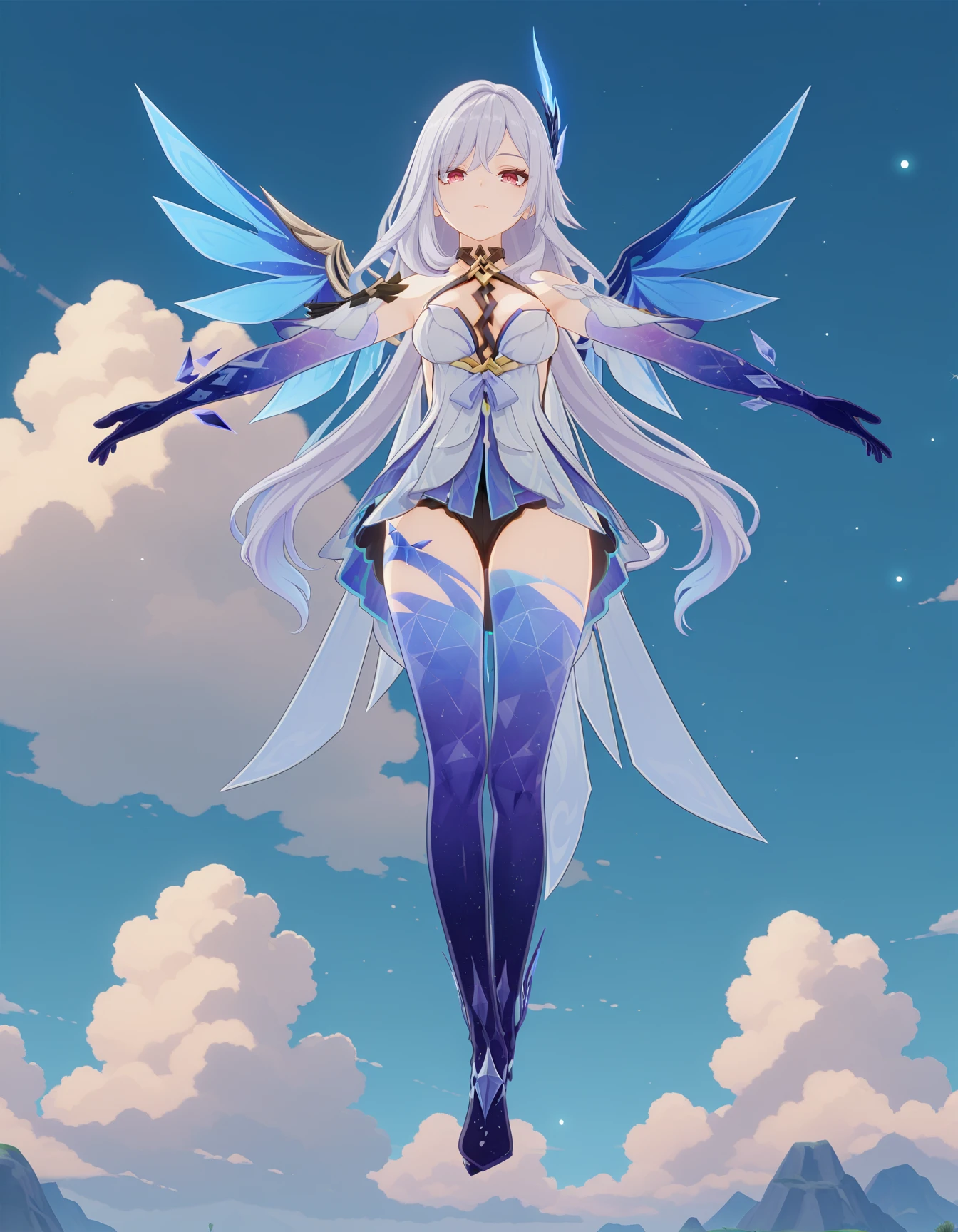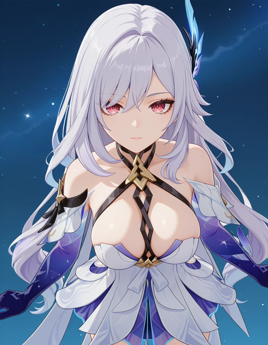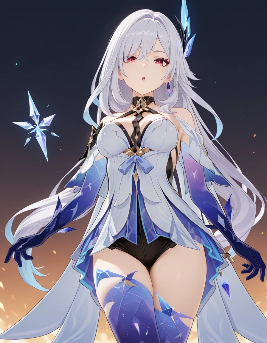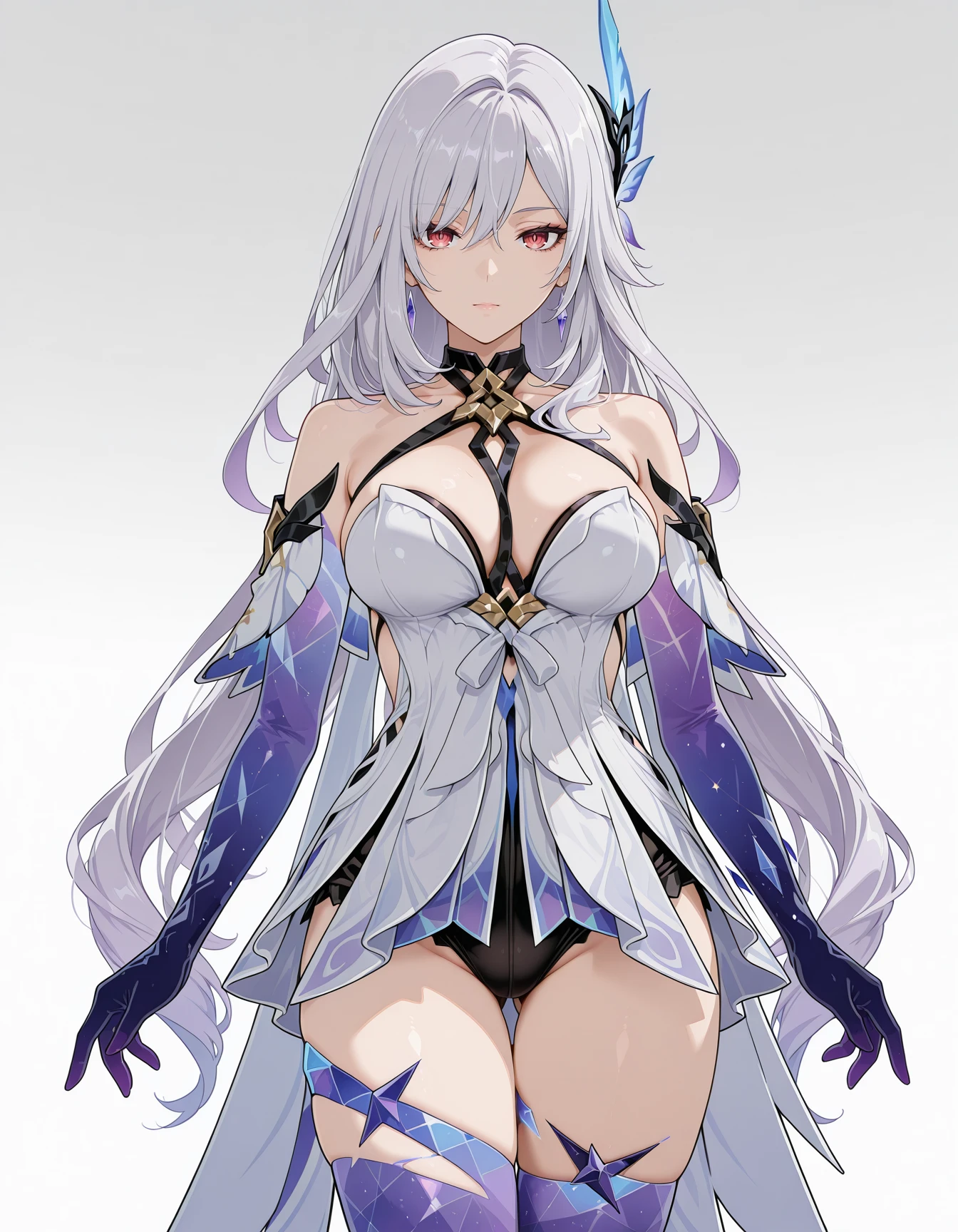 1girl,genshin_impact,skirk_\(genshin_impact\),very_long_hair,grey_hair,hair_between_eyes,red_eyes,hair_ornament,white_dress,detached_sleeves,gradient_gloves,purple_thighhighs,gradient_legwearRecommend preferred Strength: 0.7~1.