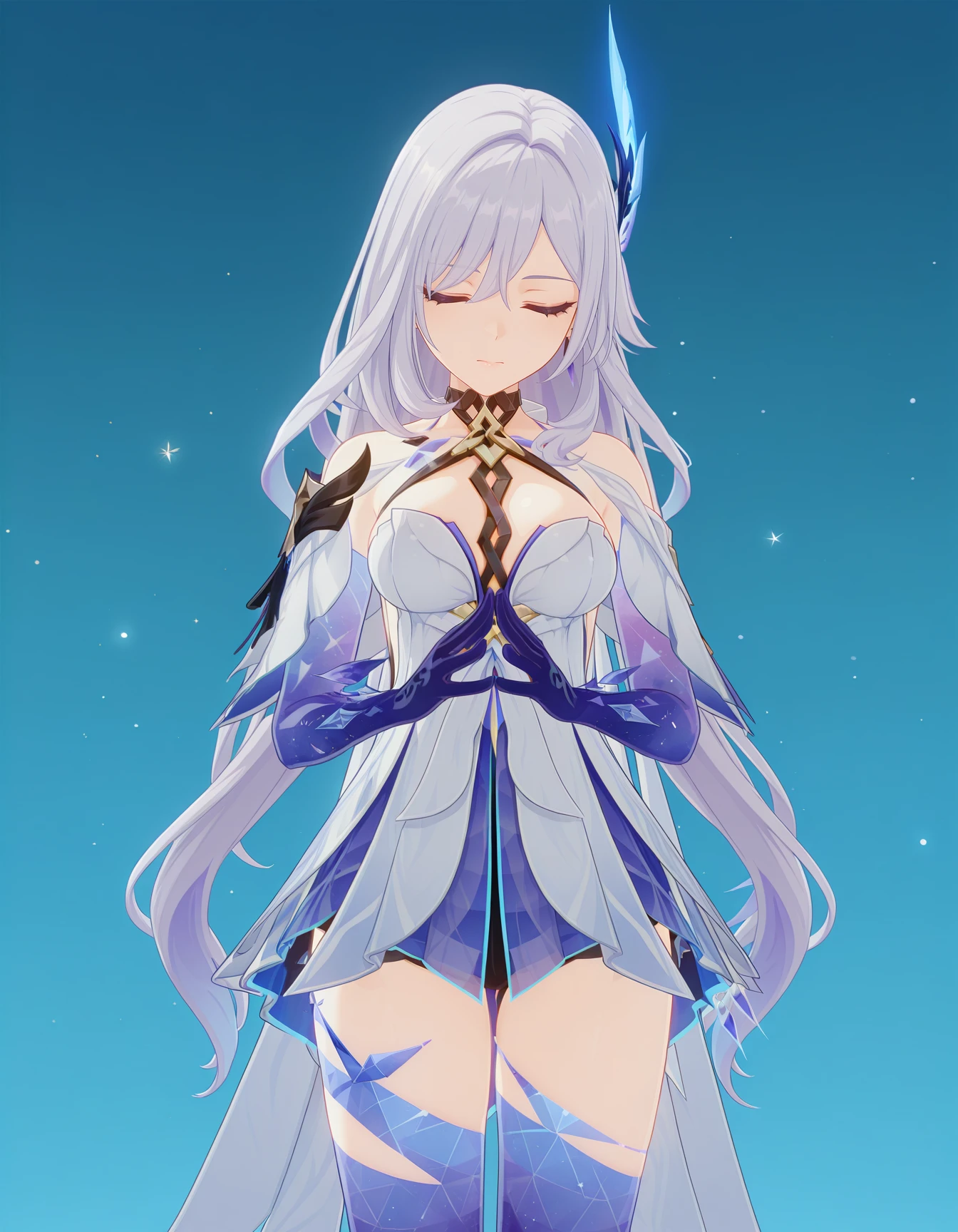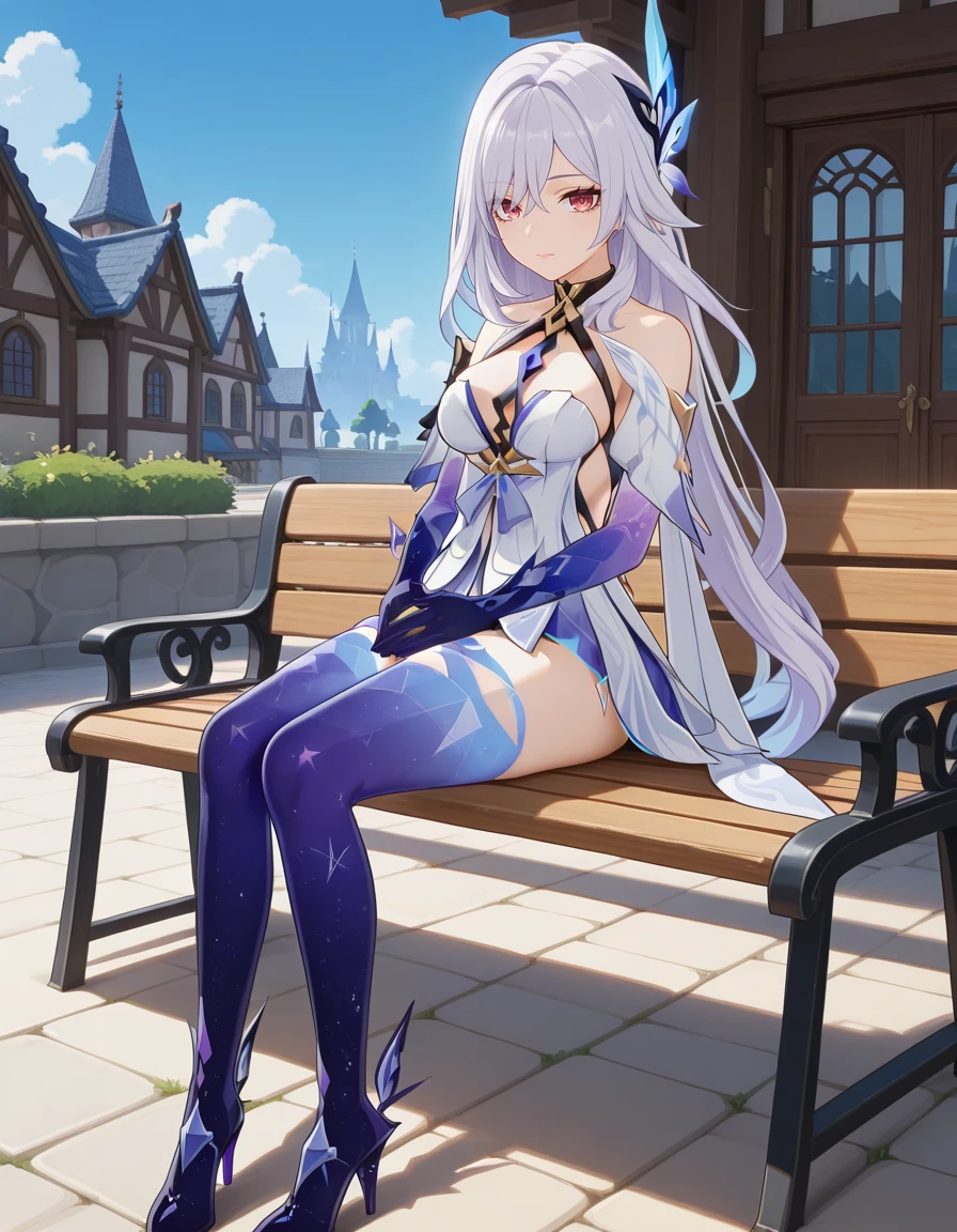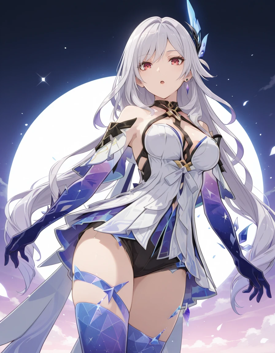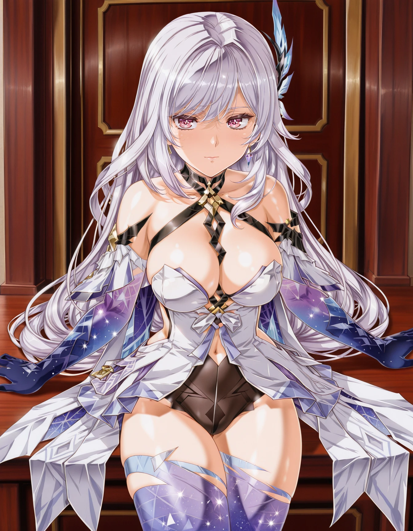1girl,genshin_impact,skirk_\(genshin_impact\),very_long_hair,grey_hair,hair_between_eyes,red_eyes,hair_ornament,white_dress,detached_sleeves,gradient_gloves,purple_thighhighs,gradient_legwearRecommend preferred Strength: 0.7~1.