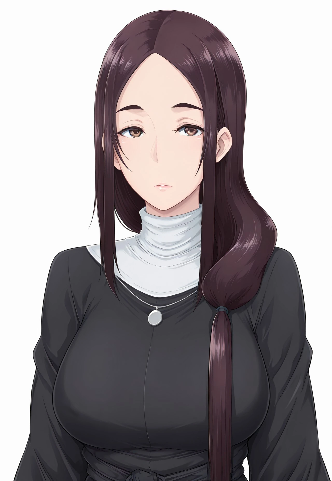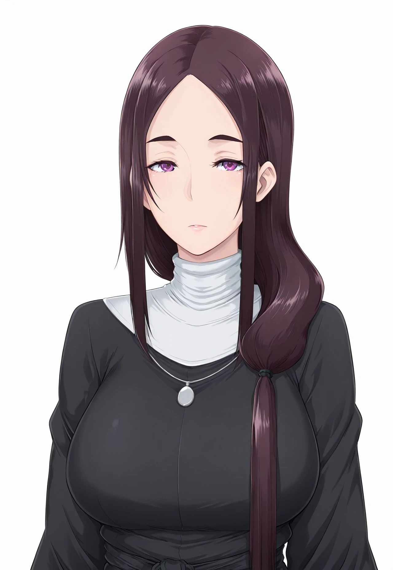 h4z4m43r1, 1girl, long hair, low-tied long hair, hair over shoulder, brown hair, purple eyes, nun, habit, jewelry, necklace, , boots, black footwear
