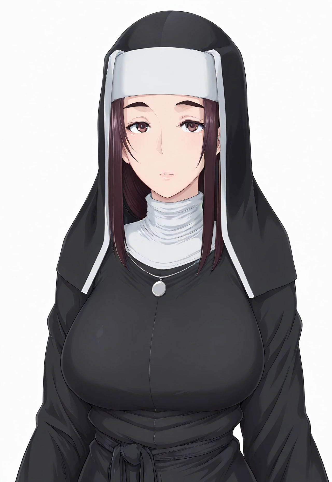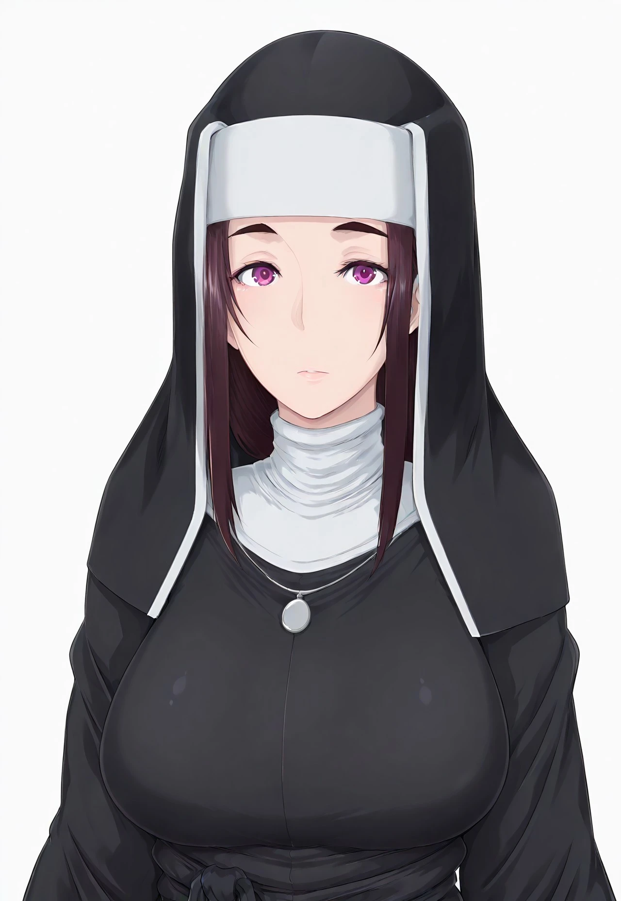 h4z4m43r1, 1girl, long hair, brown hair, purple eyes, nun, habit, veil, jewelry, necklace, , boots, black footwear