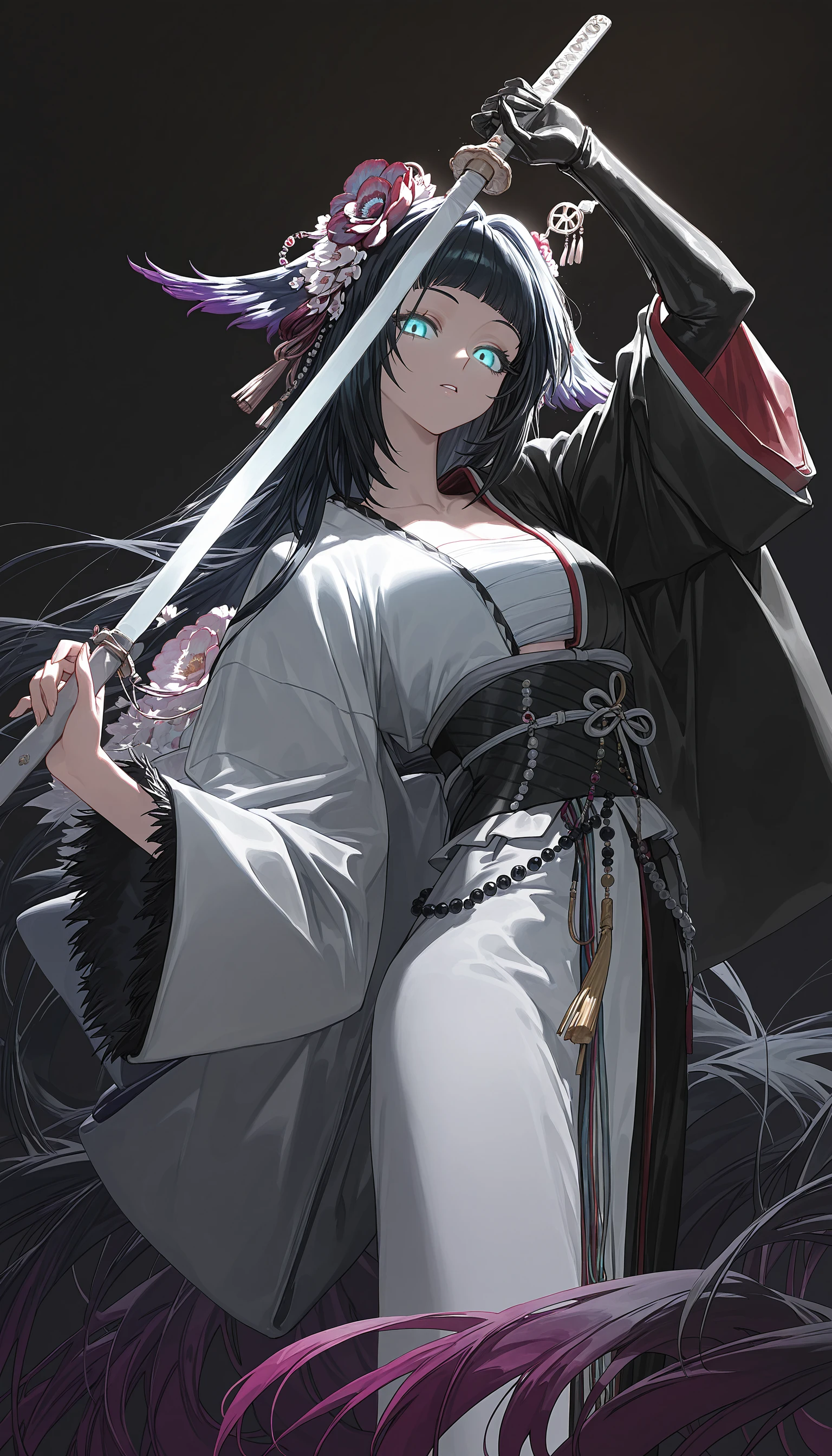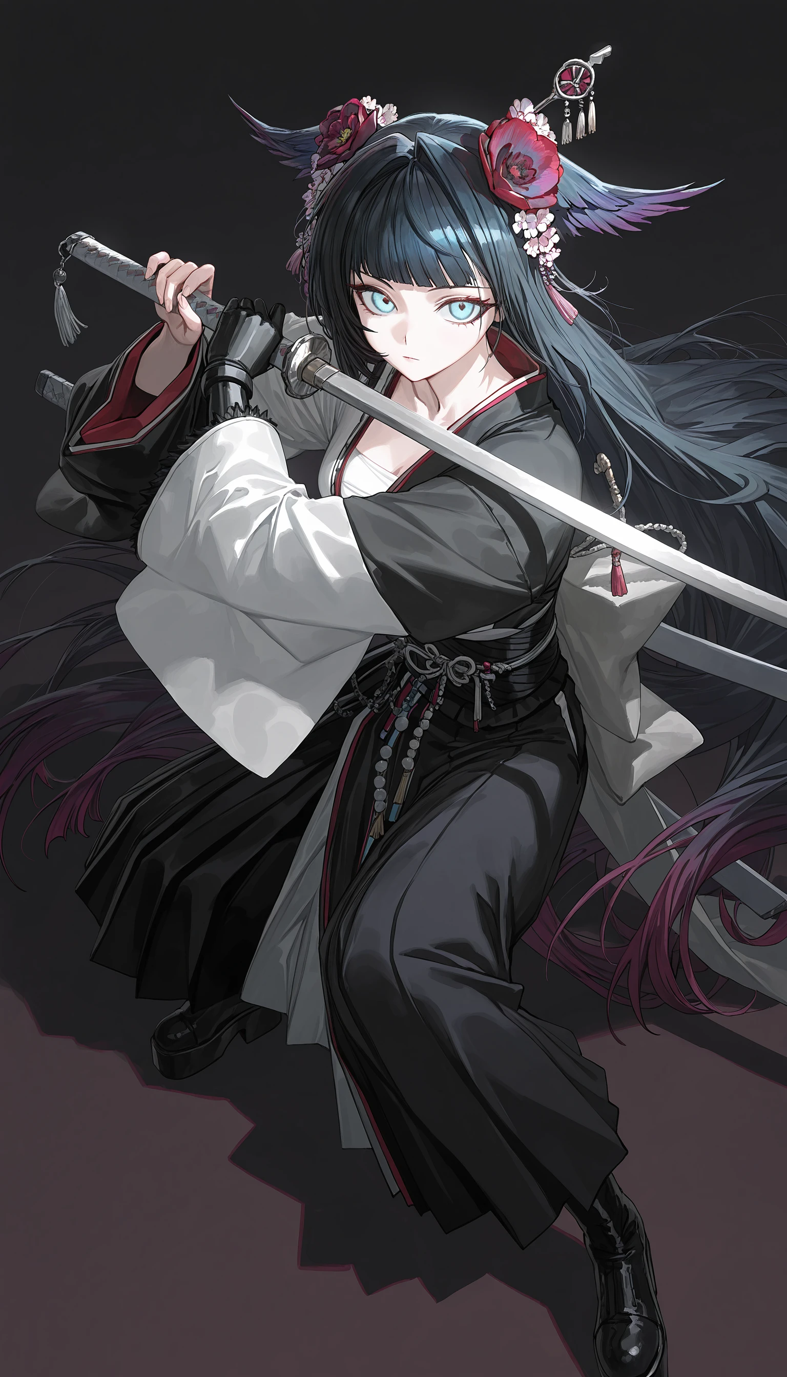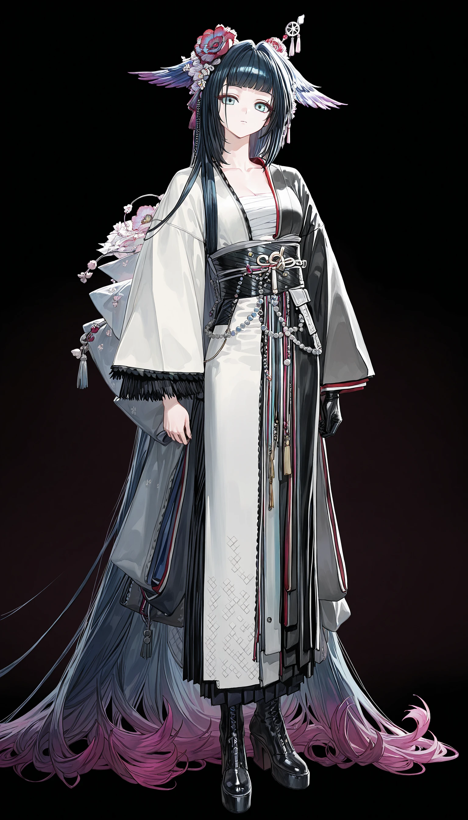 aqua_eyes,black hair, blunt_bangs , hair wings ,gradient hair ,