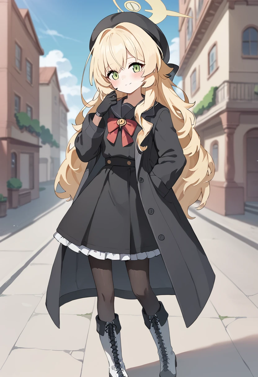 niyaniya-default,professor niyaniya \(blue archive\),green eyes, blonde hair, long hair, halo,beret,black coat,black dress,sailor collar,black pantyhose,lace-up boots,black gloves